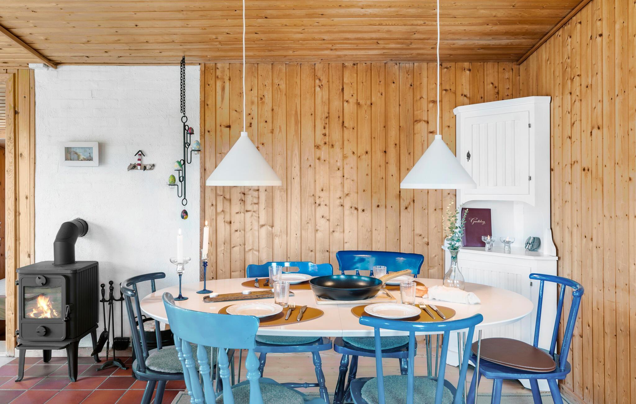Ontspan in de kamers van dit charmante vakantiehuis. Het spel van licht en maritieme kleuren in combinatie met de houten lambrisering en de houtkachel creëren een gezellige sfeer waarin je je alleen maar thuis kunt voelen. Kijk uit naar je dagelijkse vakantie, die je uitnodigt om te toveren in de keuken of samen te ontspannen op de bank.