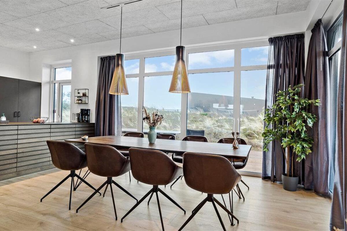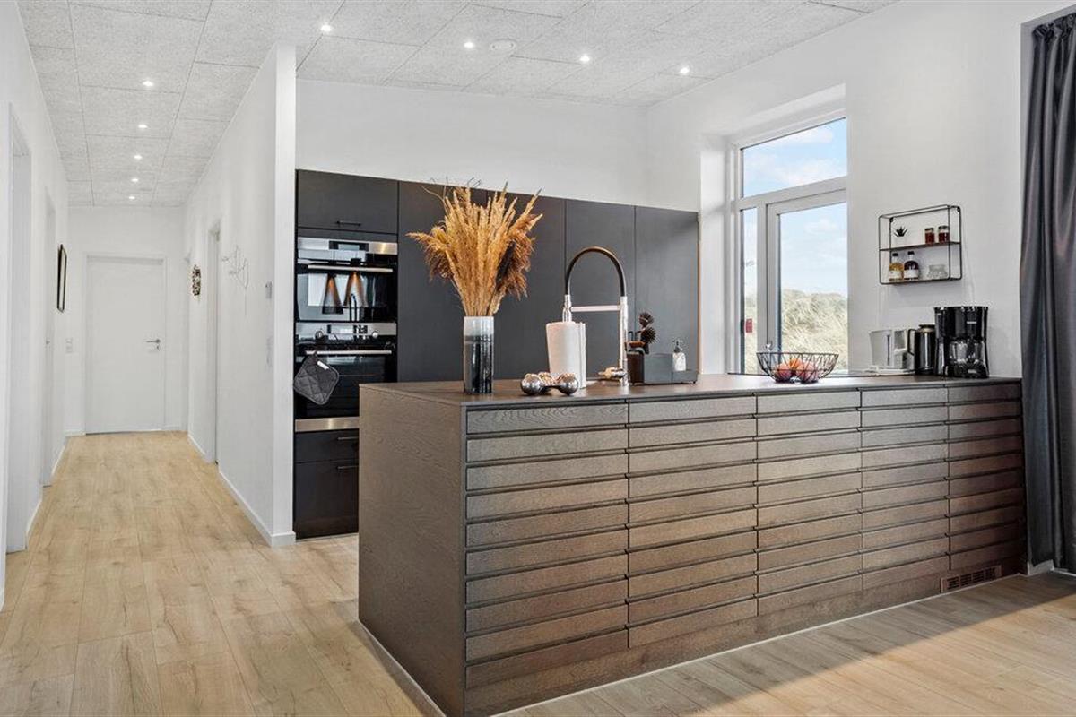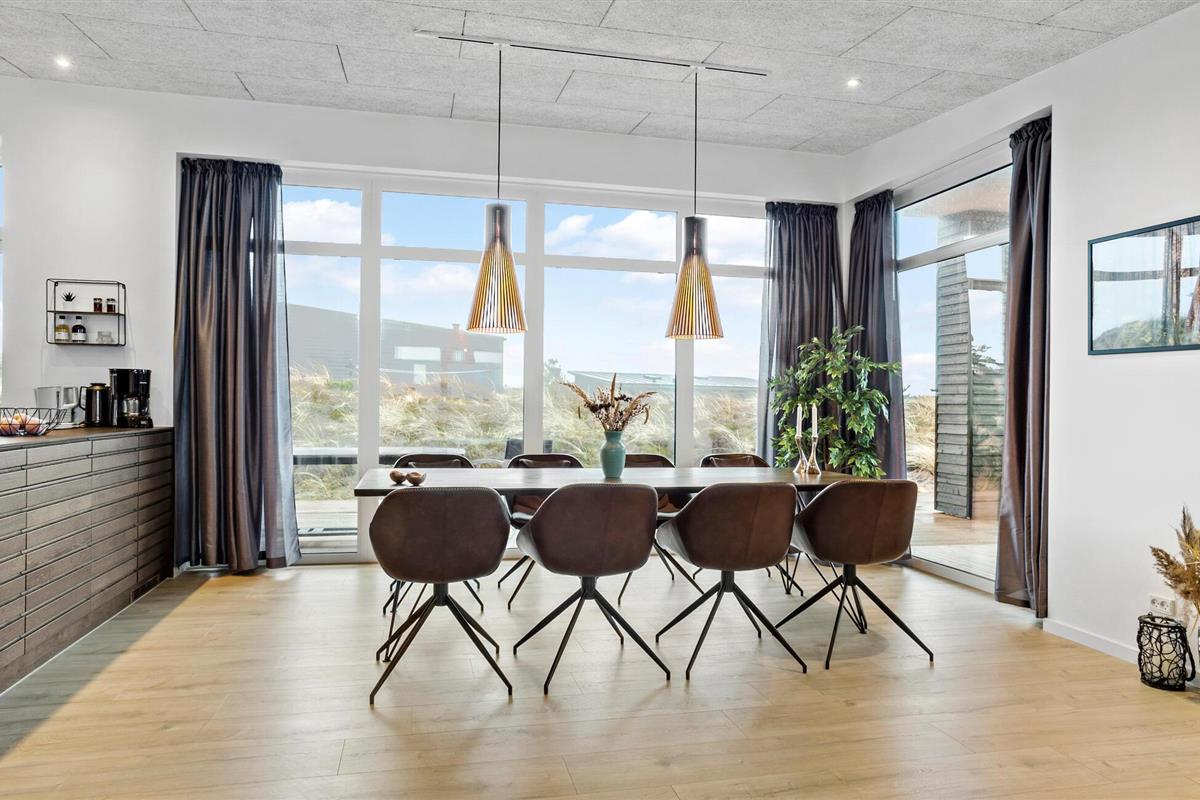 Binnen vind je een doordacht woonconcept met hoogwaardige materialen en een harmonieuze combinatie van lichtgekleurde oppervlakken en elegante, donkere elementen. De ruime woon- en eetkamer wordt overspoeld met licht dankzij ramen van vloer tot plafond en biedt een weids uitzicht op het omringende duinlandschap. De open keuken met kookeiland vormt het hart van het huis en nodigt uit om samen te koken en te tafelen. Geniet van je maaltijden aan de grote eettafel direct bij het raam met uitzicht op het groen. De sauna zorgt voor extra ontspanning en belooft rustgevende regeneratie na actieve dagen.