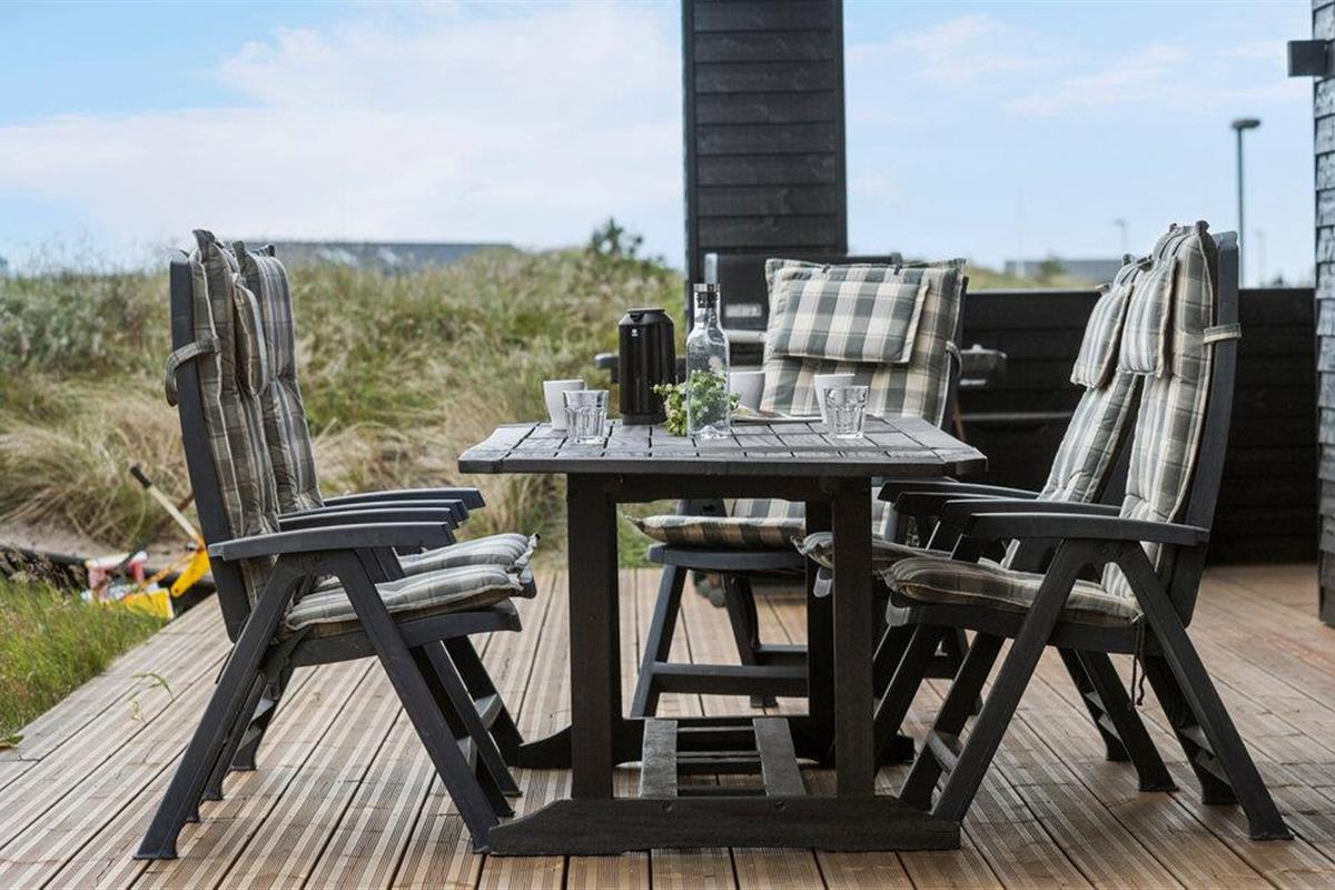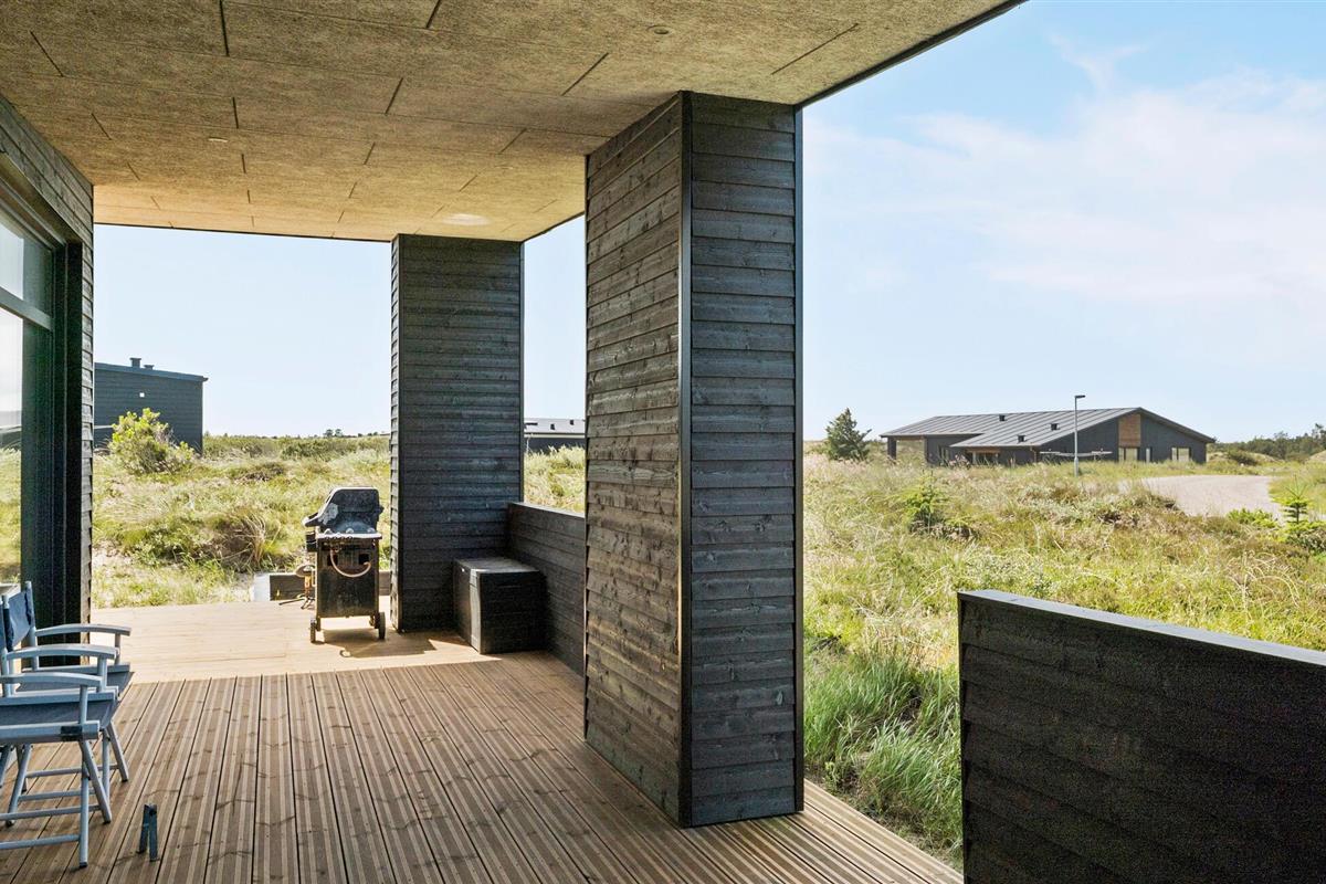 Het ruime houten terras strekt zich uit langs de zijkant van het huis en is gedeeltelijk overdekt, zodat je bij elk weertype buiten kunt zitten. Comfortabel tuinmeubilair en een barbecue zijn aanwezig terwijl je geniet van het ononderbroken uitzicht over het open landschap.