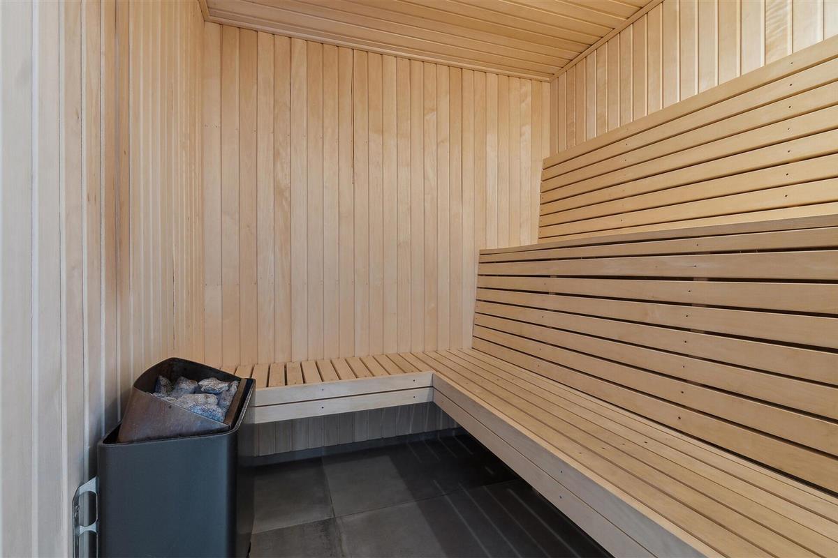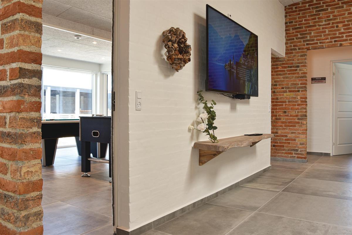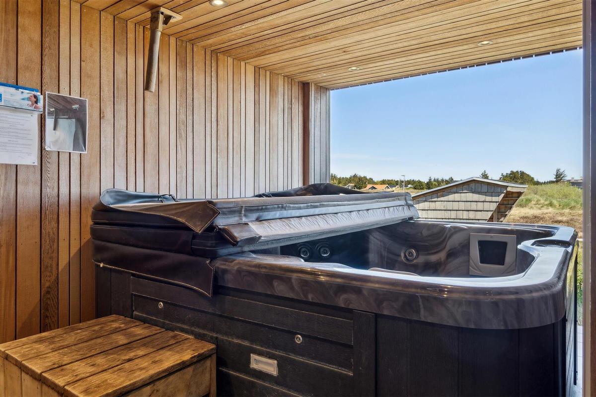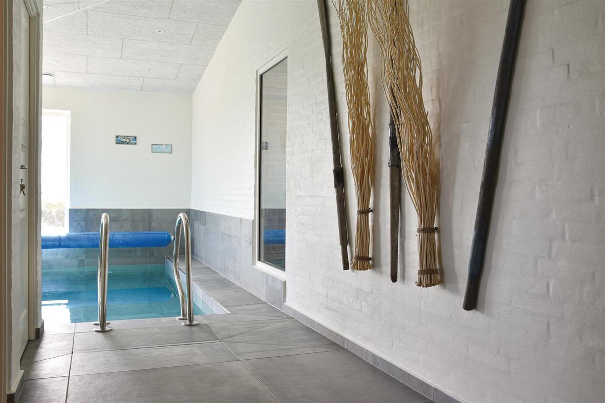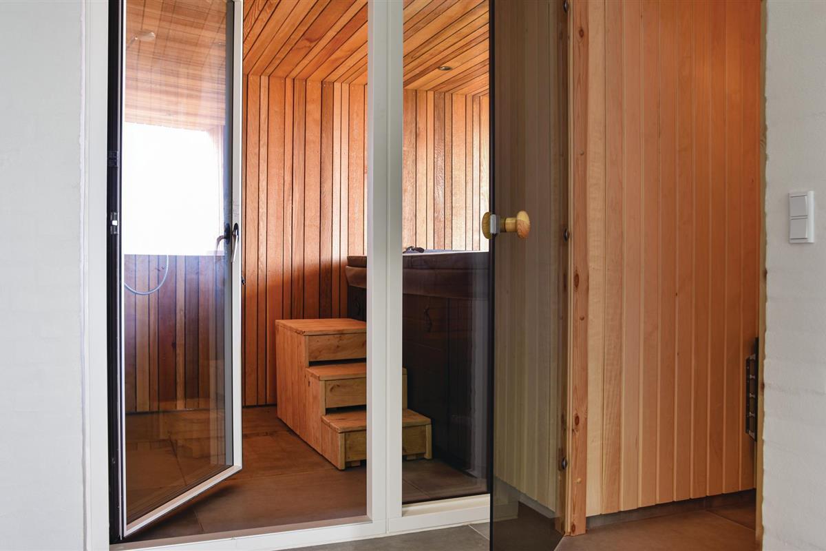 De mooie woonkamer is ingericht met comfortabele meubels en een grote flatscreen-tv, en er komt veel licht binnen door delen van ramen in de dakconstructie. Vanuit de woonkamer heeft u toegang tot de wellnessruimte met zwembad, sauna en een uitgang naar het terras met overdekte buitendouche en een stand-up whirlpool voor zes personen. Vanaf hier kunt u genieten van het uitzicht over de omgeving en in de tuin met overkapping en trampoline.