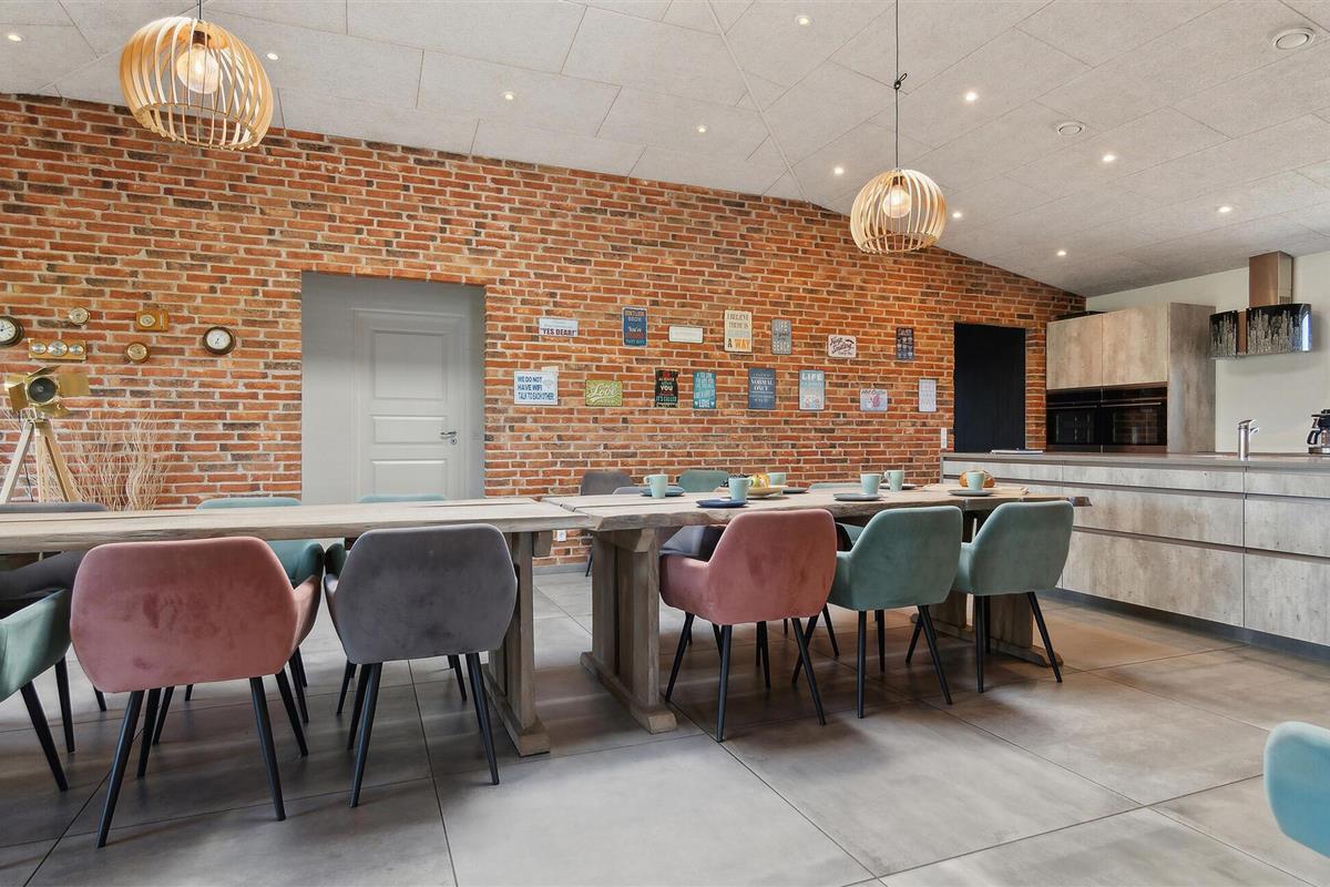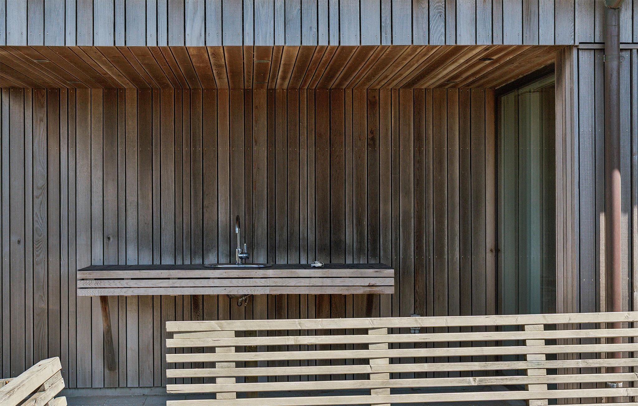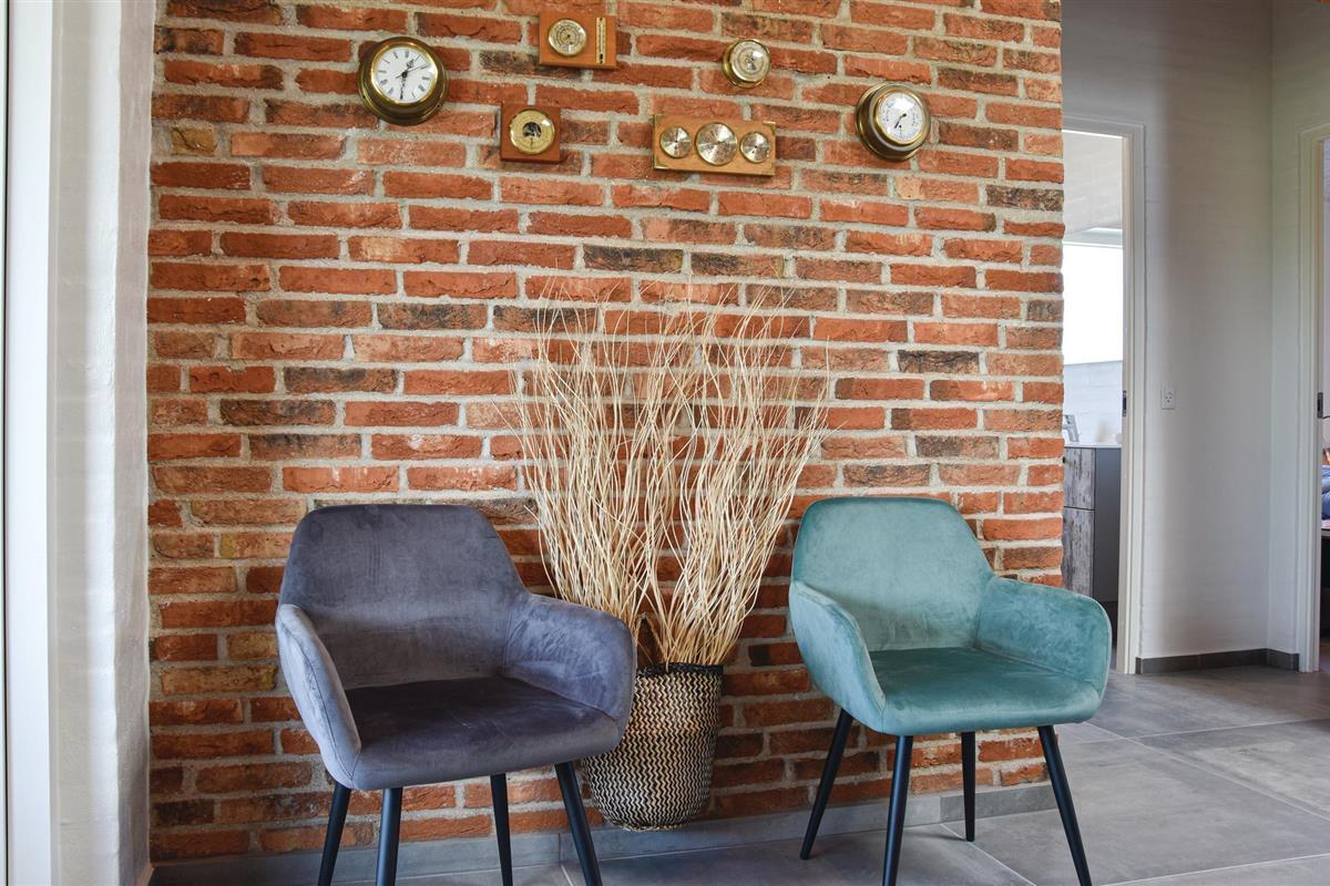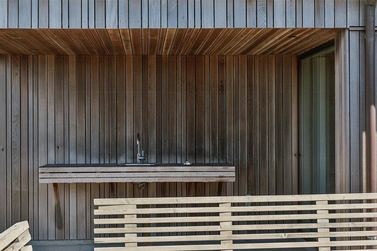 De mooie woonkamer is ingericht met comfortabele meubels en een grote flatscreen-tv, en er komt veel licht binnen door delen van ramen in de dakconstructie. Vanuit de woonkamer heeft u toegang tot de wellnessruimte met zwembad, sauna en een uitgang naar het terras met overdekte buitendouche en een stand-up whirlpool voor zes personen. Vanaf hier kunt u genieten van het uitzicht over de omgeving en in de tuin met overkapping en trampoline.