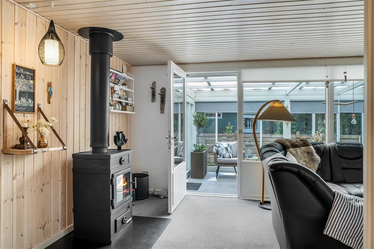 Inside, the house offers a range of modern facilities. There is a spacious bathroom with underfloor heating, shower and toilet, ensuring that you can relax after a long day. For those who value the comfort of heat, there is also a wood-burning stove and an energy-saving heat pump, which ensures a pleasant indoor climate all around. In summer, the heat pump can also function as air conditioning, keeping the house cool on hot days.