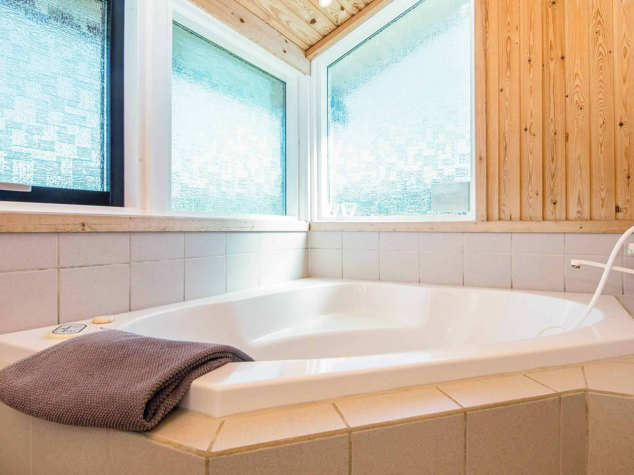 Das helle Badezimmer verfügt über eine Whirlpool-Badewanne für 2 Personen, eine Badewanne, eine Dusche, ein WC und eine Waschmaschine mit Trockner. Außerdem gibt es eine Sauna für 4 Personen.