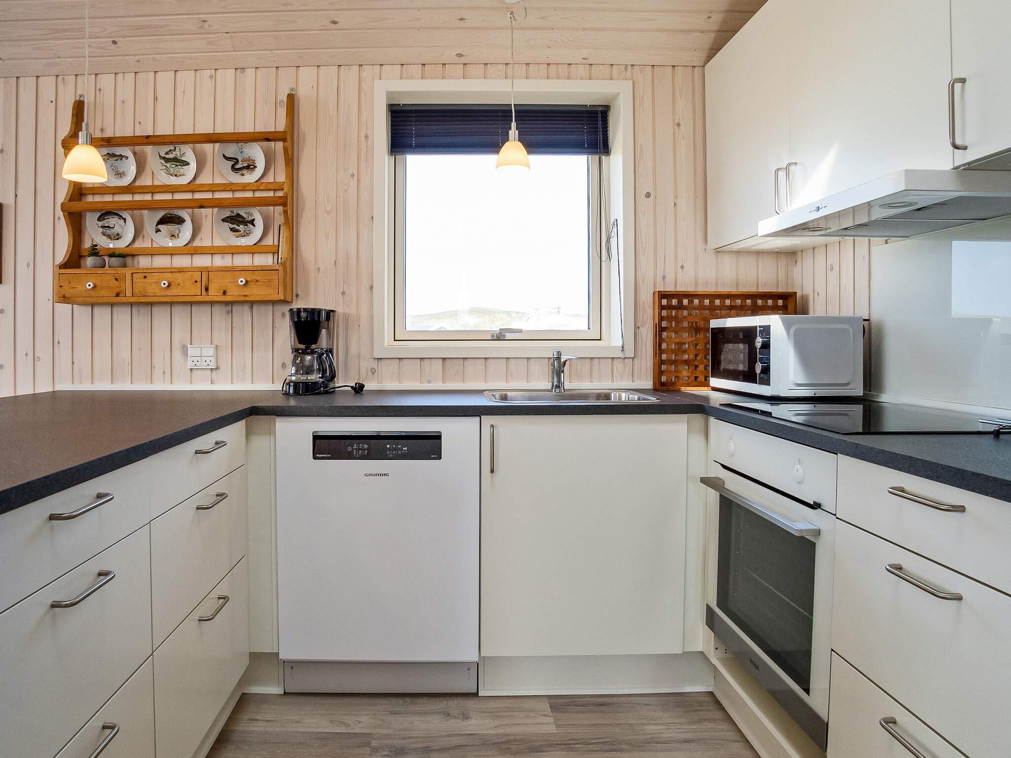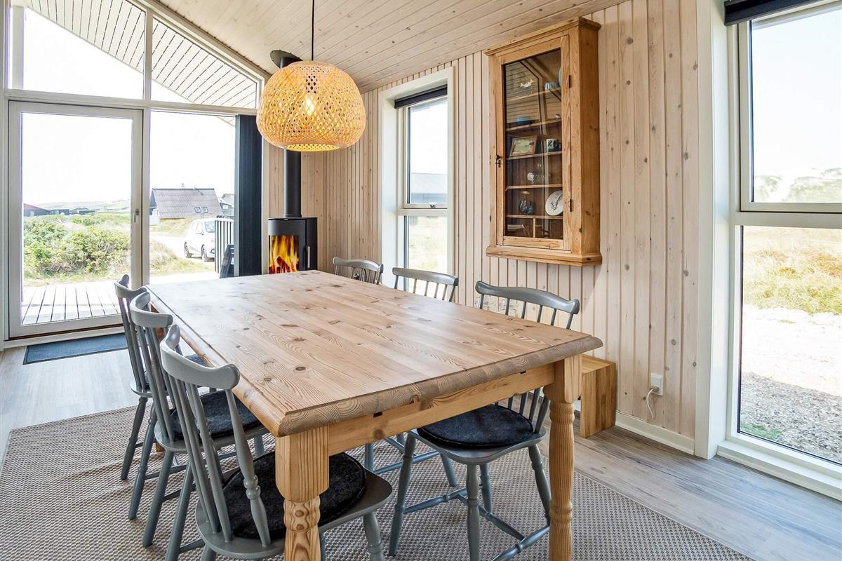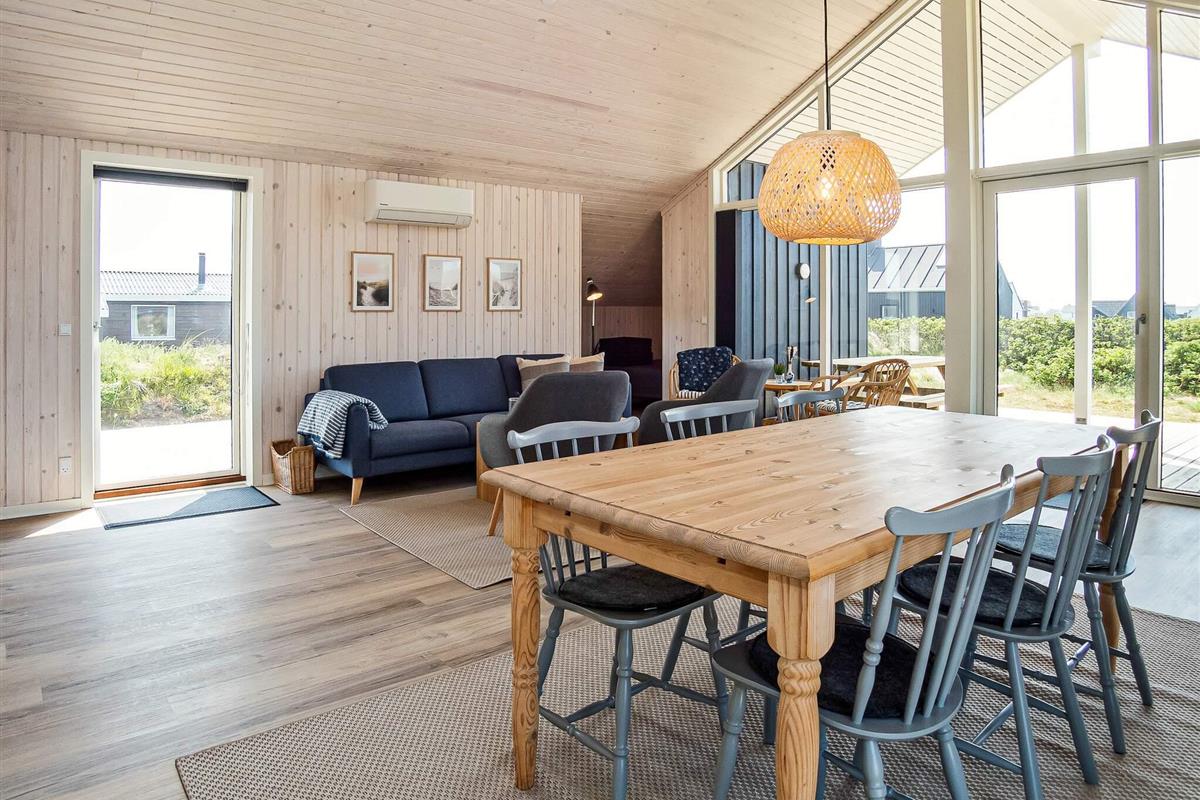 Offener Küchen-/Wohnbereich für das Familienleben mit Ess- und Sitzecke. Der Essbereich verfügt über große, bodentiefe Fenster mit Blick auf die Dünenlandschaft. Die Küche ist unter anderem mit Geschirrspüler, Kühl-/Gefrierschrank, Cerankochfeld und Mikrowelle ausgestattet.