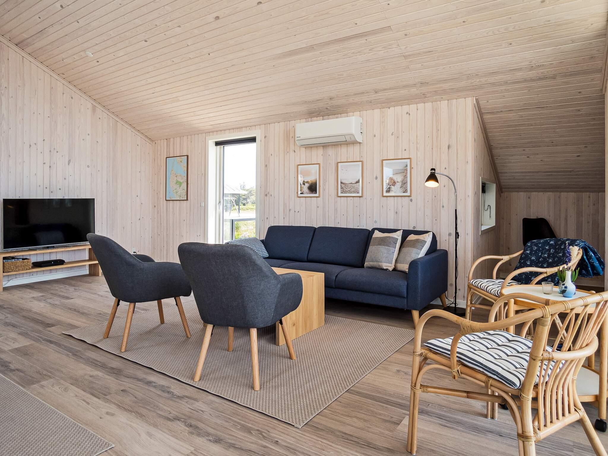 Geräumiger Wohnbereich mit klimafreundlicher Wärmepumpe, gemütlichem Holzofen und Fernseher mit Satellitenempfang. Vom Wohnbereich aus gelangt man direkt auf die überdachte Terrasse. An drei Seiten des Hauses befinden sich Terrassen, sodass Sie immer Sonne, Schatten oder Windschutz finden. Für sonnige Tage steht Ihnen ein Holzkohlegrill am Haus zur Verfügung.