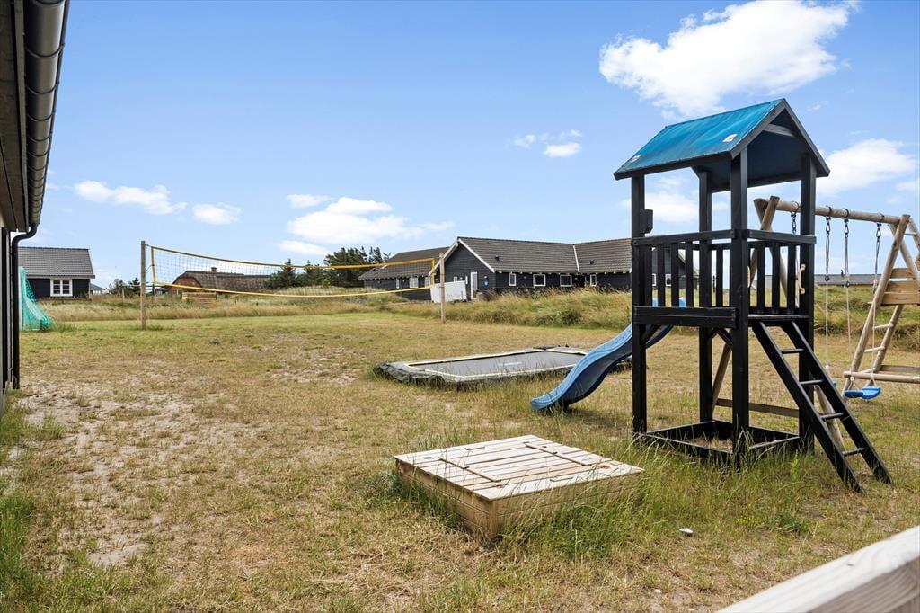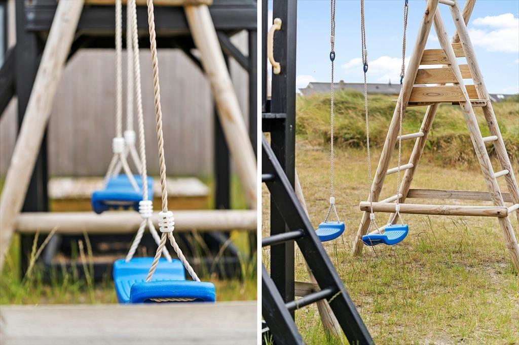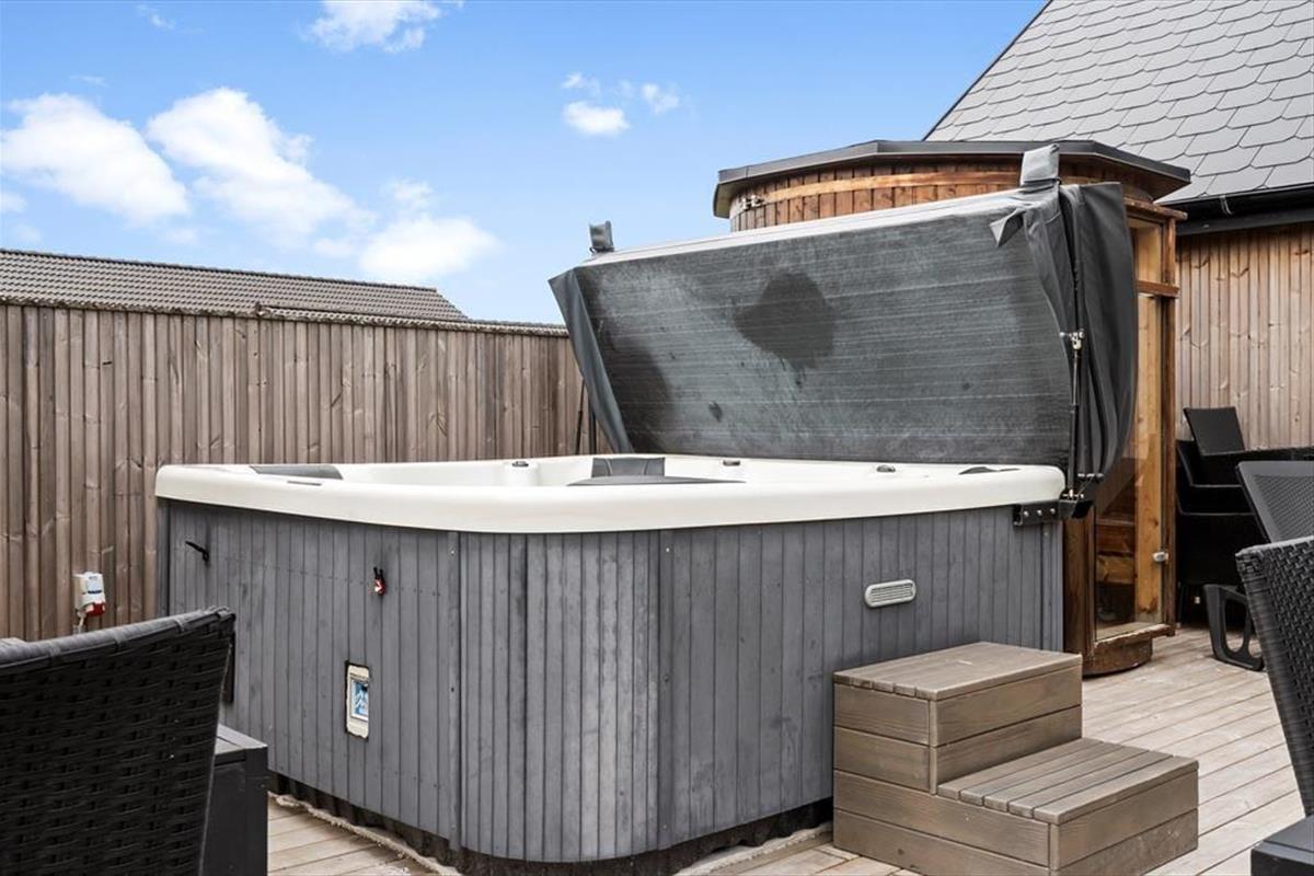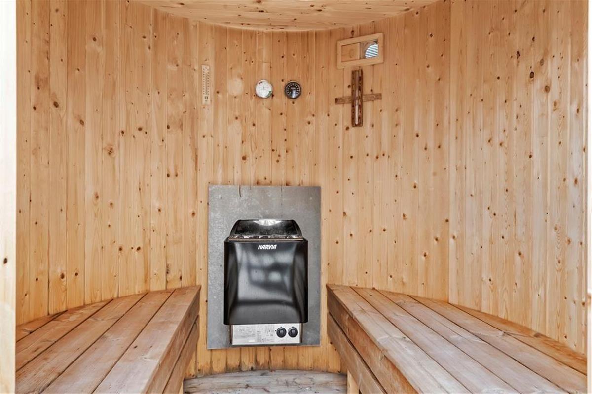 The large terrace opens endless opportunities for enjoying outdoor life, whether that’s with a cup of coffee in the sun, a good book in the lounge chair or a refreshing moment in the barrel sauna. There’s plenty of space for the kids to play freely, while the adults enjoy the view or prepare a delicious meal on the grill. The garden is tailor-made for playtime, featuring a trampoline, play tower, sandbox and a volleyball net – providing hours of outdoor fun and activity for the whole group. As the sun begins to set, it’s the perfect time to gather everyone around for a good meal and let the peace settle in, while the day winds down with laughter and great conversation under the open sky.