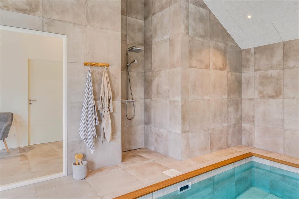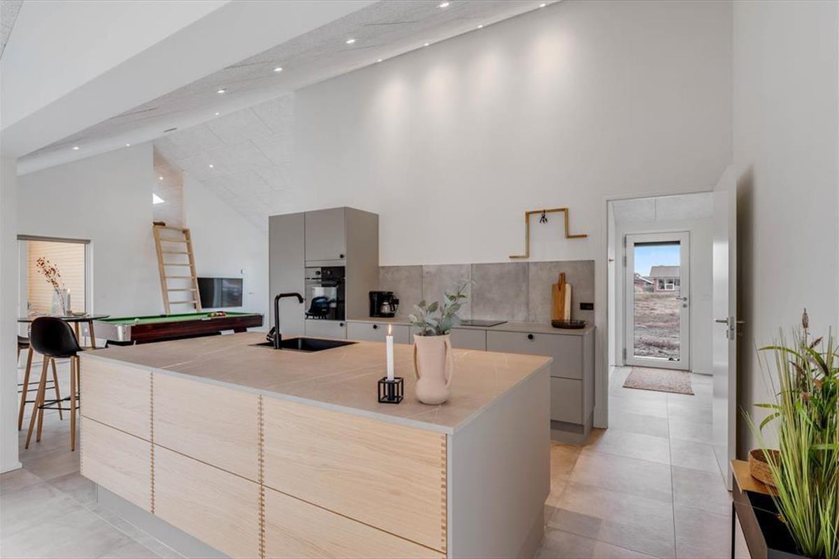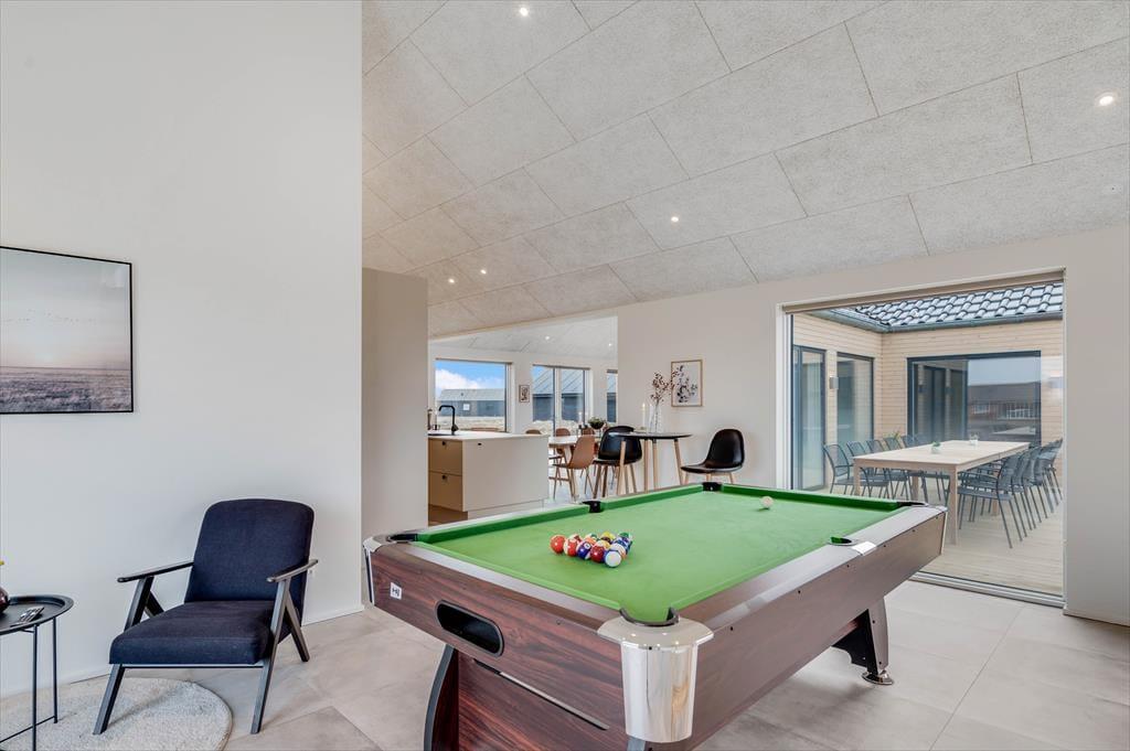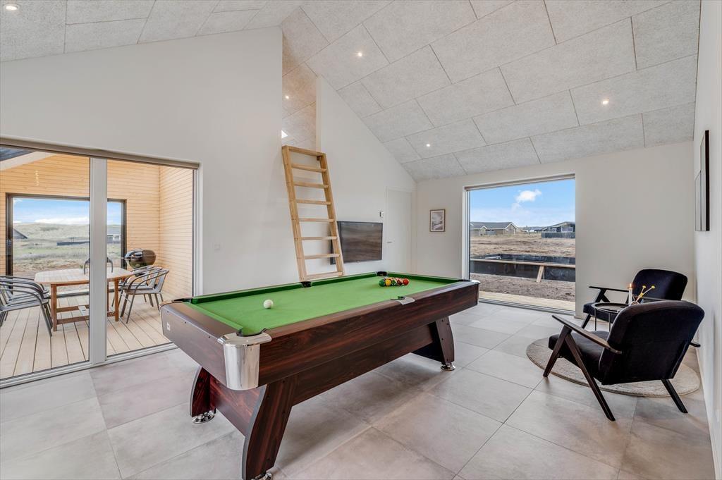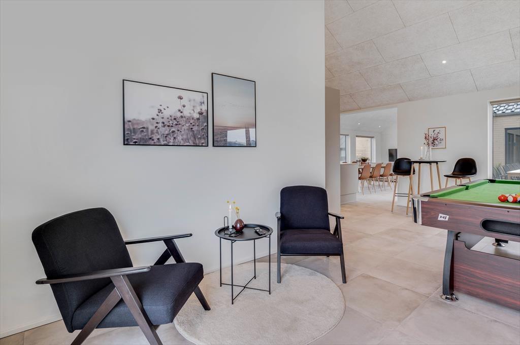 This spacious holiday home is thoughtfully designed with stylish details and a bright, welcoming atmosphere that makes it easy to feel at home. The kitchen and living room are combined in an open layout and quickly become the natural hub for cooking, chatting, and enjoying time together. When it’s time to relax and recharge, head into the beautiful pool area, where an indoor pool, shower, and sauna await. And if you're up for some fun and friendly competition, the activity room is equipped with both a pool table and table tennis – perfect for hours of entertainment for all ages. The house also features a cosy loft space that’s great for playing, reading, or simply enjoying a quiet moment away from it all. There’s room here for the whole family – and maybe even two – to enjoy a holiday with everything your heart desires.