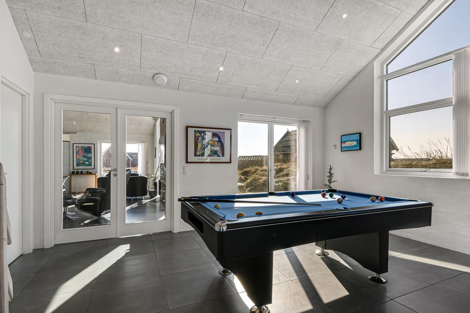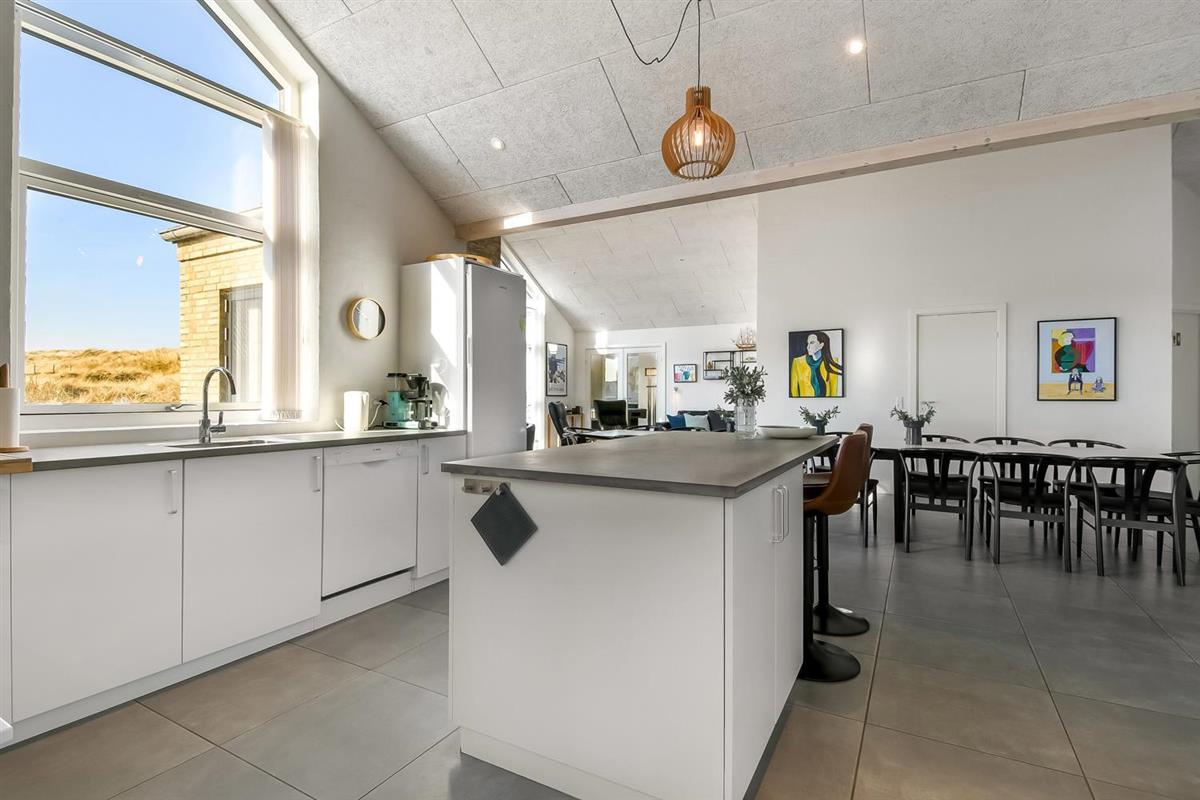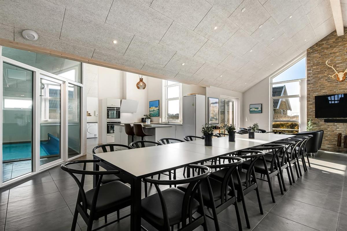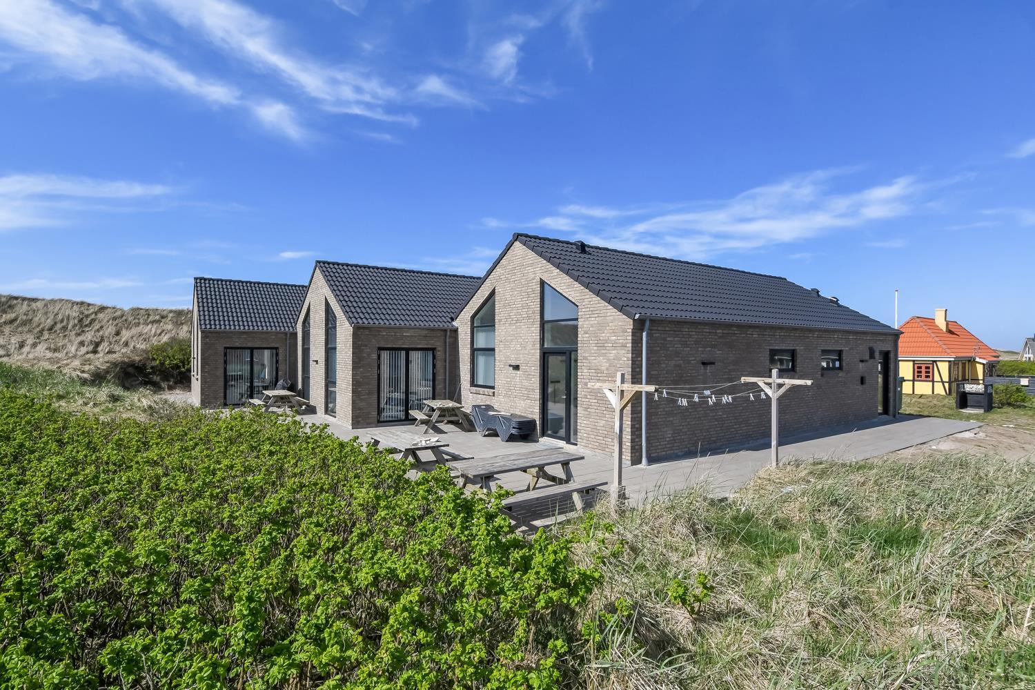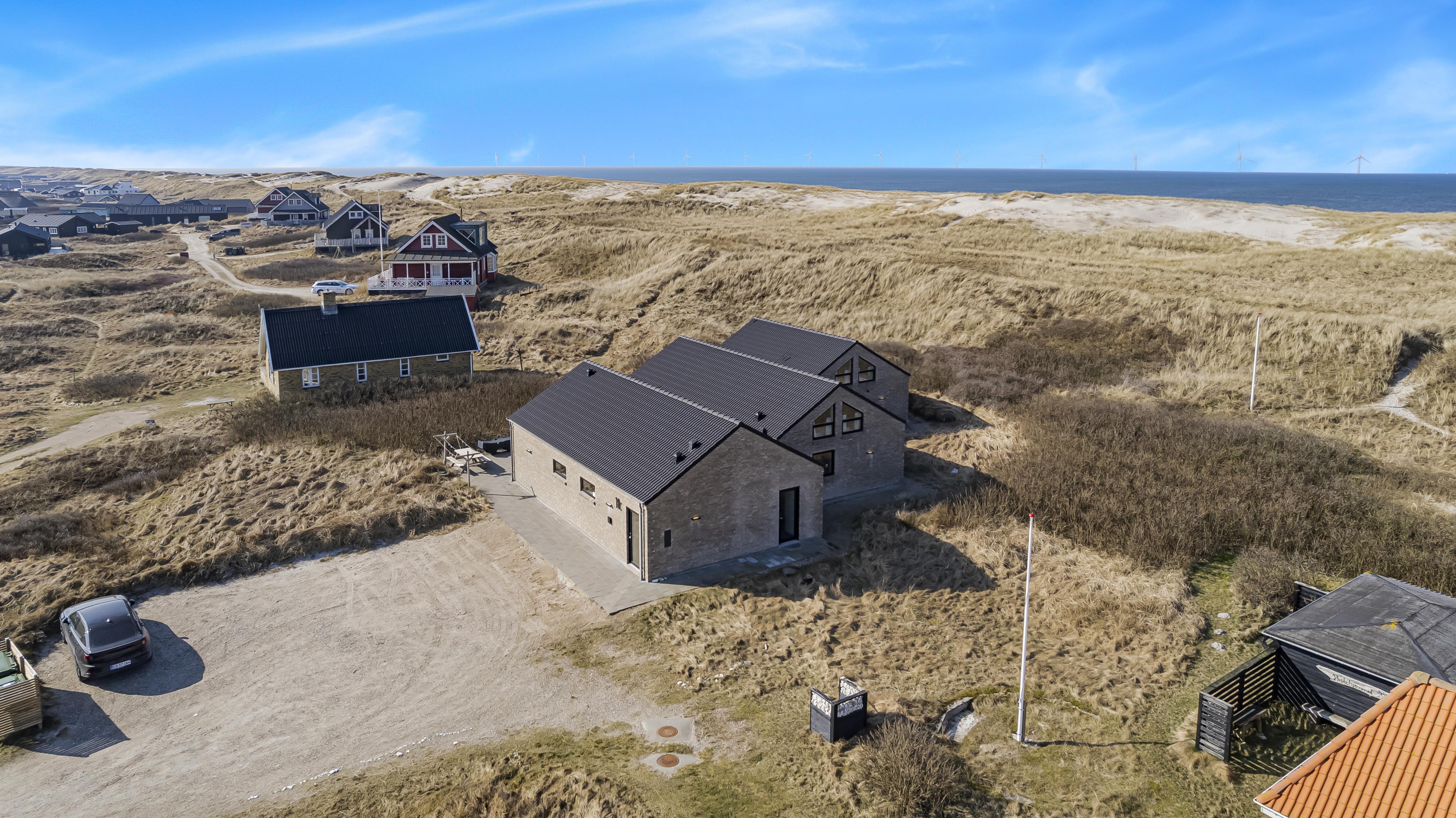 Schon auf dem Weg zu diesem herrlichen Ferienhaus spüren Sie die fantastische Lage des Hauses in der Nähe der großen Dünen an der Nordsee. Das Haus ist 241 m² groß und hat 6 gute Schlafräume: 1DB + 1DB + 1DB + 1DB + 2B + 2B. Außerdem gibt es 8 Schlafplätze, die auf 2 offenen Schlafböden verteilt sind. Im Zentrum des Hauses finden Sie die große, sehr gut ausgestattete Küche mit allem an Geschirr und Kochgeschirr. Küchenecke mit Cerankochfeld, eingebautem Ofen, Abzugshaube, Geschirrspüler, Mikrowelle, großem Kühlschrank und separater Gefriertruhe. Genießen Sie das Essen an dem großen Esstisch, schauen Sie aus den Fenstern und genießen Sie den Blick auf die hohen Dünen direkt an der Nordsee oder relaxen Sie einfach in den weichen Qualitätsmöbeln. Sie können auf dem TV dänische und deutsche Programme sehen oder Sie können Ihre Lieblingsserie streamen auf einem der Fernseher im Haus. Es gibt in allen Aufenthaltsräumen Fliesen mit Fußbodenheizung; das Haus ist sehr reinigungsfreundlich. Die große Wellness-/Poolabteilung des Hauses hat außer dem Pool einen Whirlpool und ein Badezimmer und eine separte Toilette. Ein eingebauter Projektor macht, dass Sie TV auf der grossen weissen Wand sehen können, während dass Sie im Pool oder im Whirlpool sind. Eine schöne Sauna gibt es mit Eingang von Aussen. Im Aktivitätsraum befinden sich ein kombinierter Tischtennis- und Pooltisch, neue Ledermöbel und noch ein Smart-TV, genau wie der andere und auch mit den gleichen Möglichkeiten. 2 Badezimmer: Toilette, Dusche, Waschbecken und Fußbodenheizung. Ausserdem gibt es eine exta Toilette mit Waschbecken und separtem Baderaum bei der Poolabteilung. Ein grosser Flur heisst Sie willkommen und hier gibt es eine Waschmaschine, einen Trockner und einen separaten Gefrierschrank. Für die Kleinsten gibt es ein Kinderbett und Kinderstuhl. Eine neue Luft-Wasser-Anlage macht das Haus extrem energieeffizient und führt auch zu einem günstigeren Stromverbrauch. Max. 2 Haustiere sind erlaubt. Das Haus wird nicht an Jugendgruppen vermietet. Kaution Wintersaison EUR 800 und Sommersaison EUR 500. Wenn Sie ein Elektroauto oder einen Plug-in-Hybrid haben, verfügt das Haus über eine Ladebox.