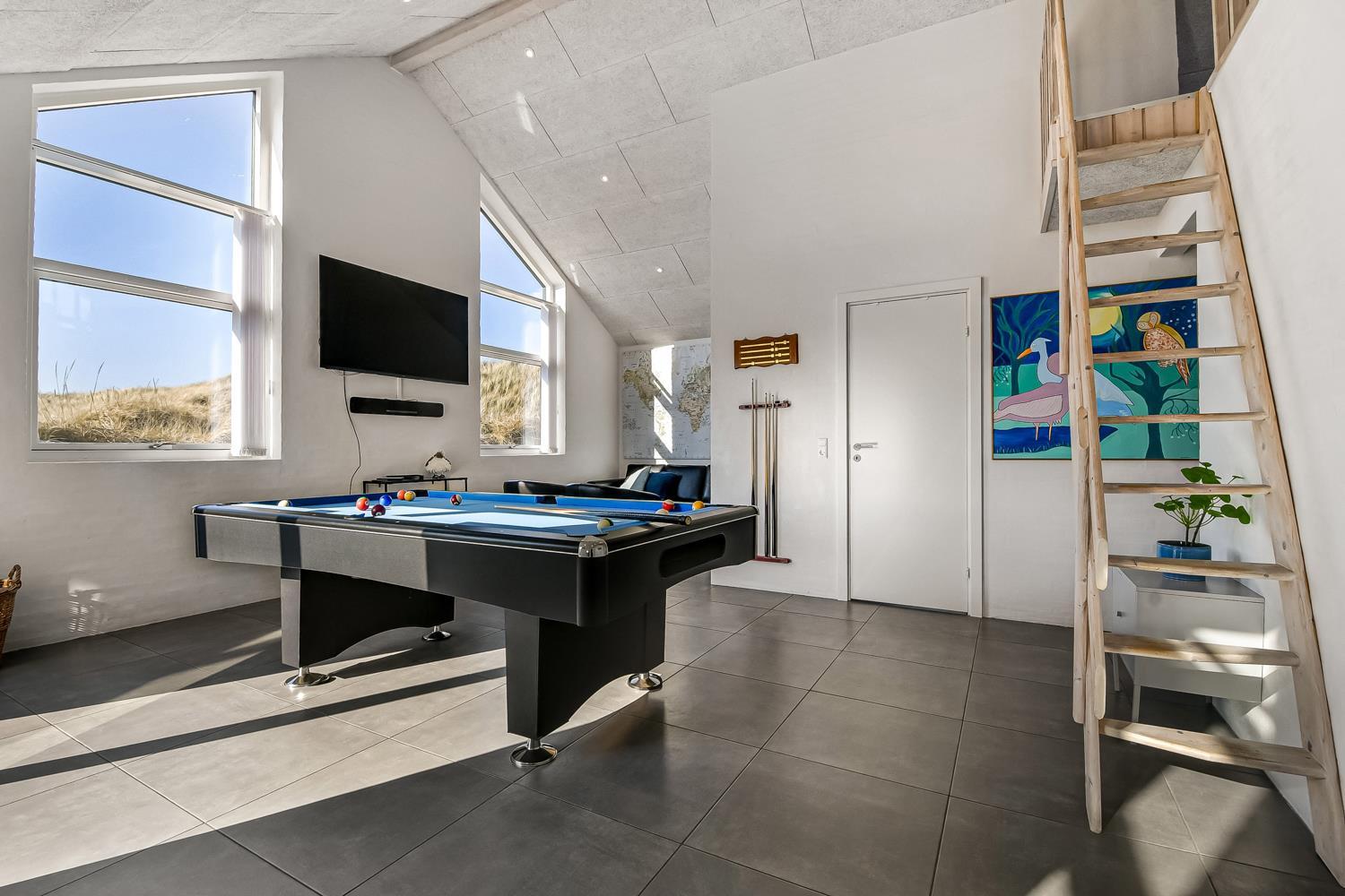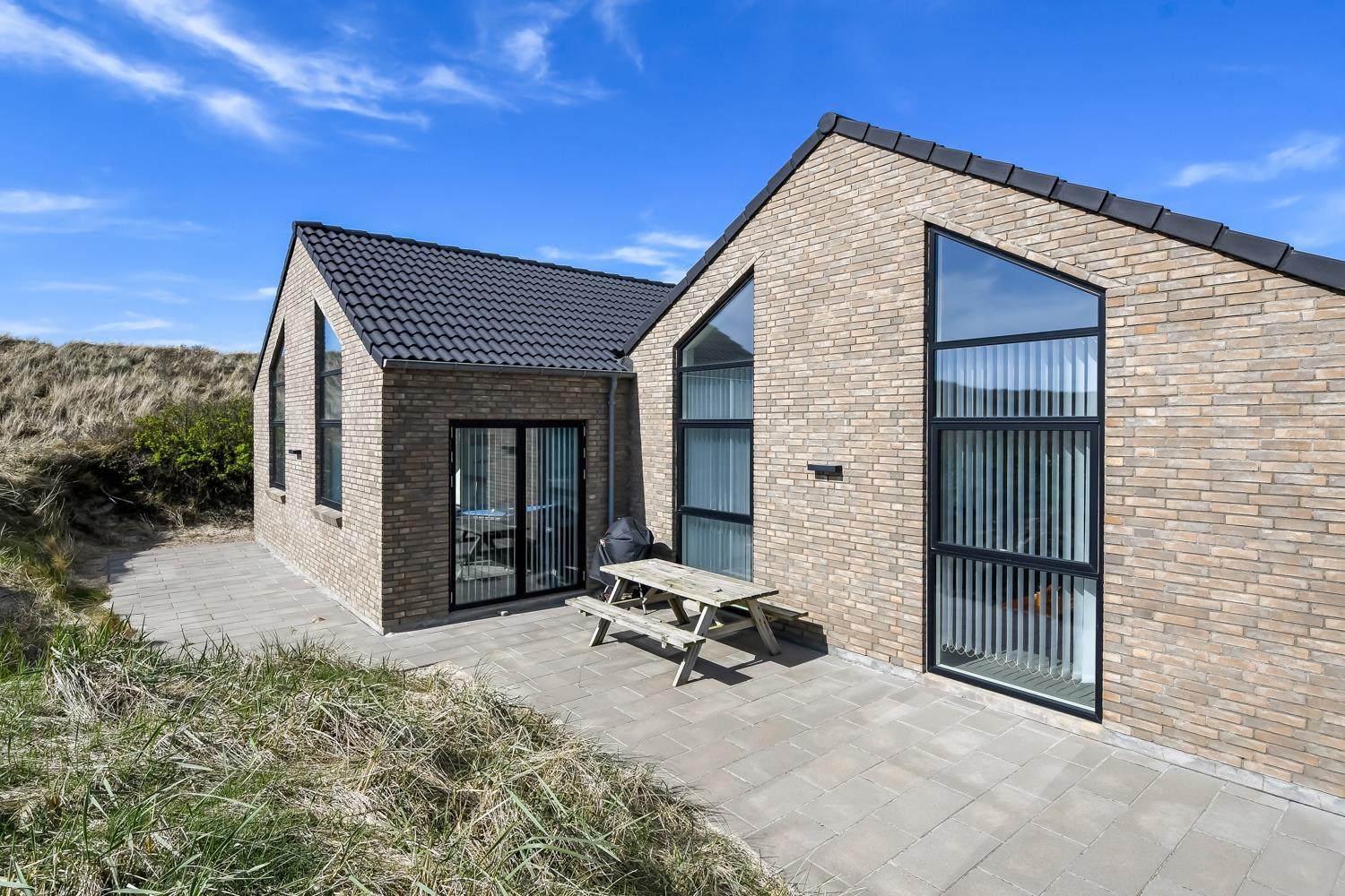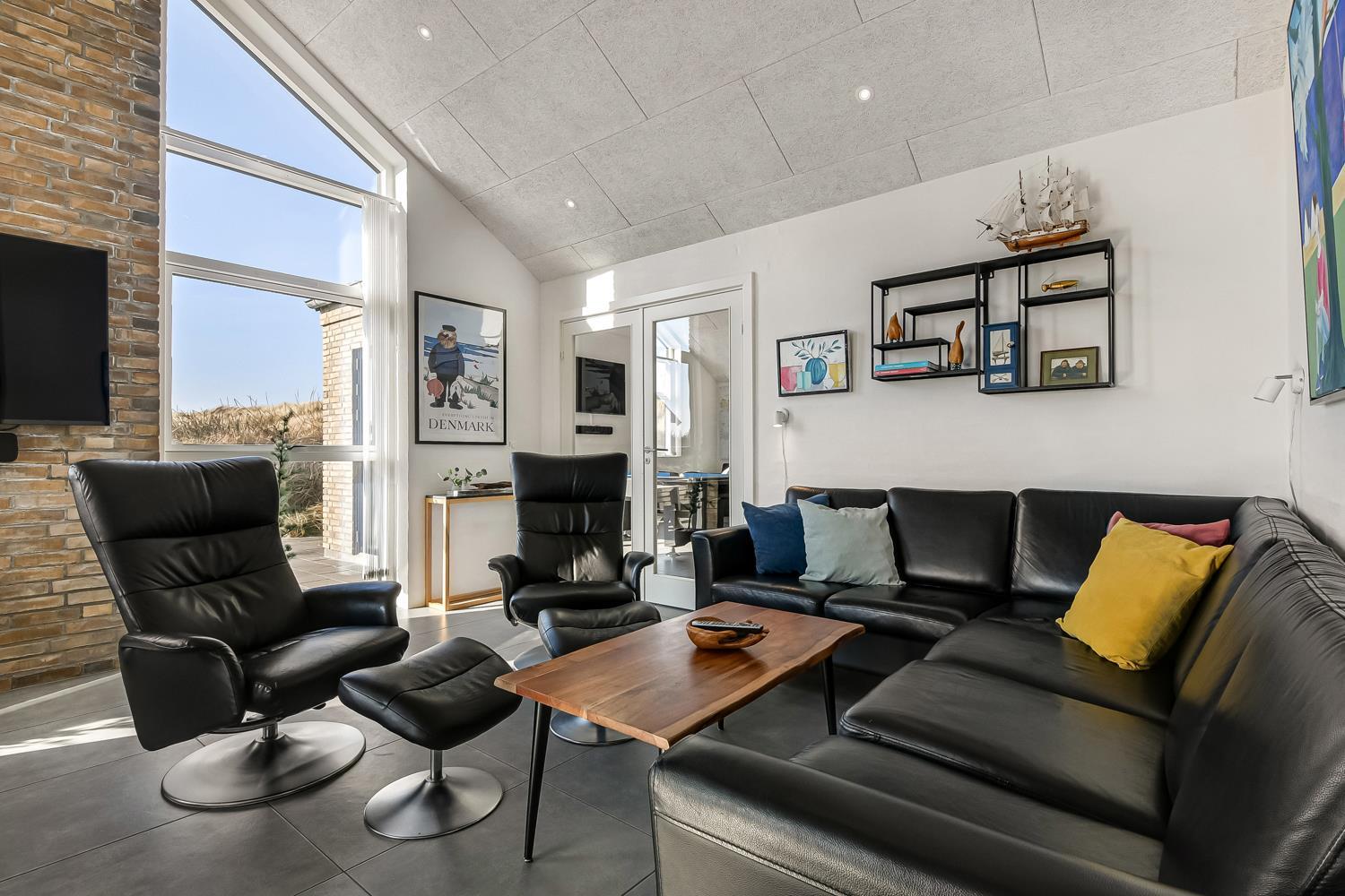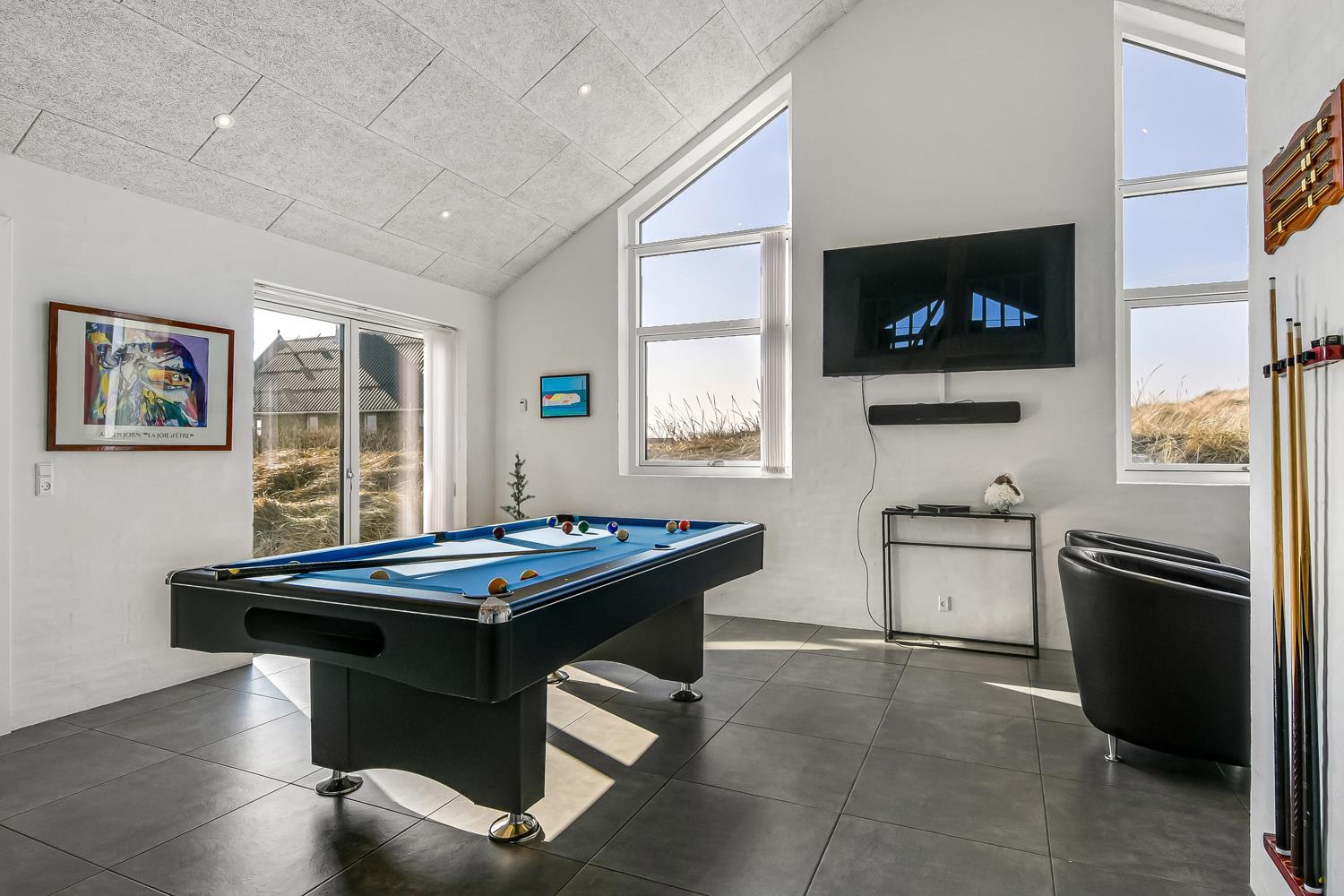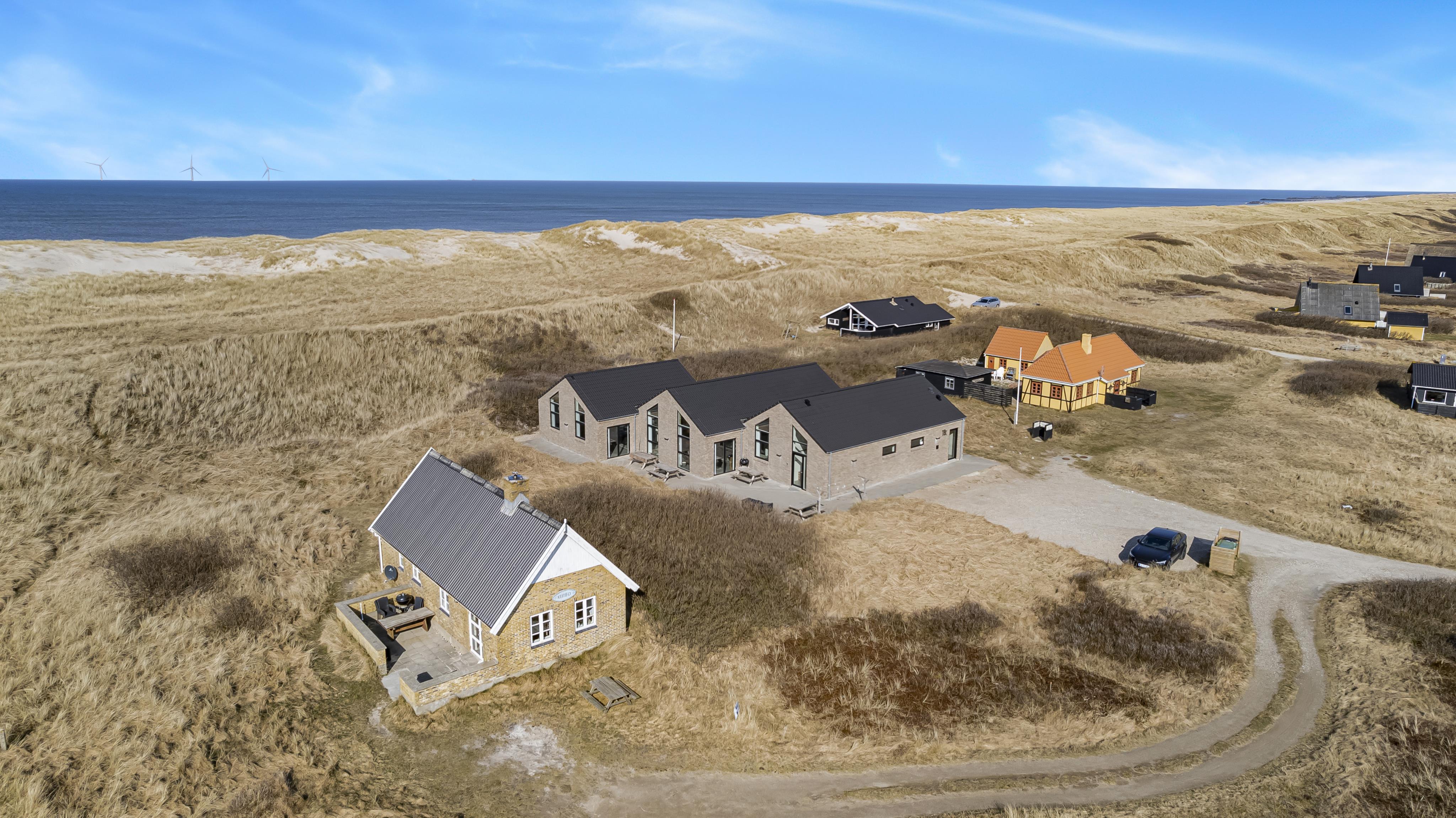 Schon auf dem Weg zu diesem herrlichen Ferienhaus spüren Sie die fantastische Lage des Hauses in der Nähe der großen Dünen an der Nordsee. Das Haus ist 241 m² groß und hat 6 gute Schlafräume: 1DB + 1DB + 1DB + 1DB + 2B + 2B. Außerdem gibt es 8 Schlafplätze, die auf 2 offenen Schlafböden verteilt sind. Im Zentrum des Hauses finden Sie die große, sehr gut ausgestattete Küche mit allem an Geschirr und Kochgeschirr. Küchenecke mit Cerankochfeld, eingebautem Ofen, Abzugshaube, Geschirrspüler, Mikrowelle, großem Kühlschrank und separater Gefriertruhe. Genießen Sie das Essen an dem großen Esstisch, schauen Sie aus den Fenstern und genießen Sie den Blick auf die hohen Dünen direkt an der Nordsee oder relaxen Sie einfach in den weichen Qualitätsmöbeln. Sie können auf dem TV dänische und deutsche Programme sehen oder Sie können Ihre Lieblingsserie streamen auf einem der Fernseher im Haus. Es gibt in allen Aufenthaltsräumen Fliesen mit Fußbodenheizung; das Haus ist sehr reinigungsfreundlich. Die große Wellness-/Poolabteilung des Hauses hat außer dem Pool einen Whirlpool und ein Badezimmer und eine separte Toilette. Ein eingebauter Projektor macht, dass Sie TV auf der grossen weissen Wand sehen können, während dass Sie im Pool oder im Whirlpool sind. Eine schöne Sauna gibt es mit Eingang von Aussen. Im Aktivitätsraum befinden sich ein kombinierter Tischtennis- und Pooltisch, neue Ledermöbel und noch ein Smart-TV, genau wie der andere und auch mit den gleichen Möglichkeiten. 2 Badezimmer: Toilette, Dusche, Waschbecken und Fußbodenheizung. Ausserdem gibt es eine exta Toilette mit Waschbecken und separtem Baderaum bei der Poolabteilung. Ein grosser Flur heisst Sie willkommen und hier gibt es eine Waschmaschine, einen Trockner und einen separaten Gefrierschrank. Für die Kleinsten gibt es ein Kinderbett und Kinderstuhl. Eine neue Luft-Wasser-Anlage macht das Haus extrem energieeffizient und führt auch zu einem günstigeren Stromverbrauch. Max. 2 Haustiere sind erlaubt. Das Haus wird nicht an Jugendgruppen vermietet. Kaution Wintersaison EUR 800 und Sommersaison EUR 500. Wenn Sie ein Elektroauto oder einen Plug-in-Hybrid haben, verfügt das Haus über eine Ladebox.