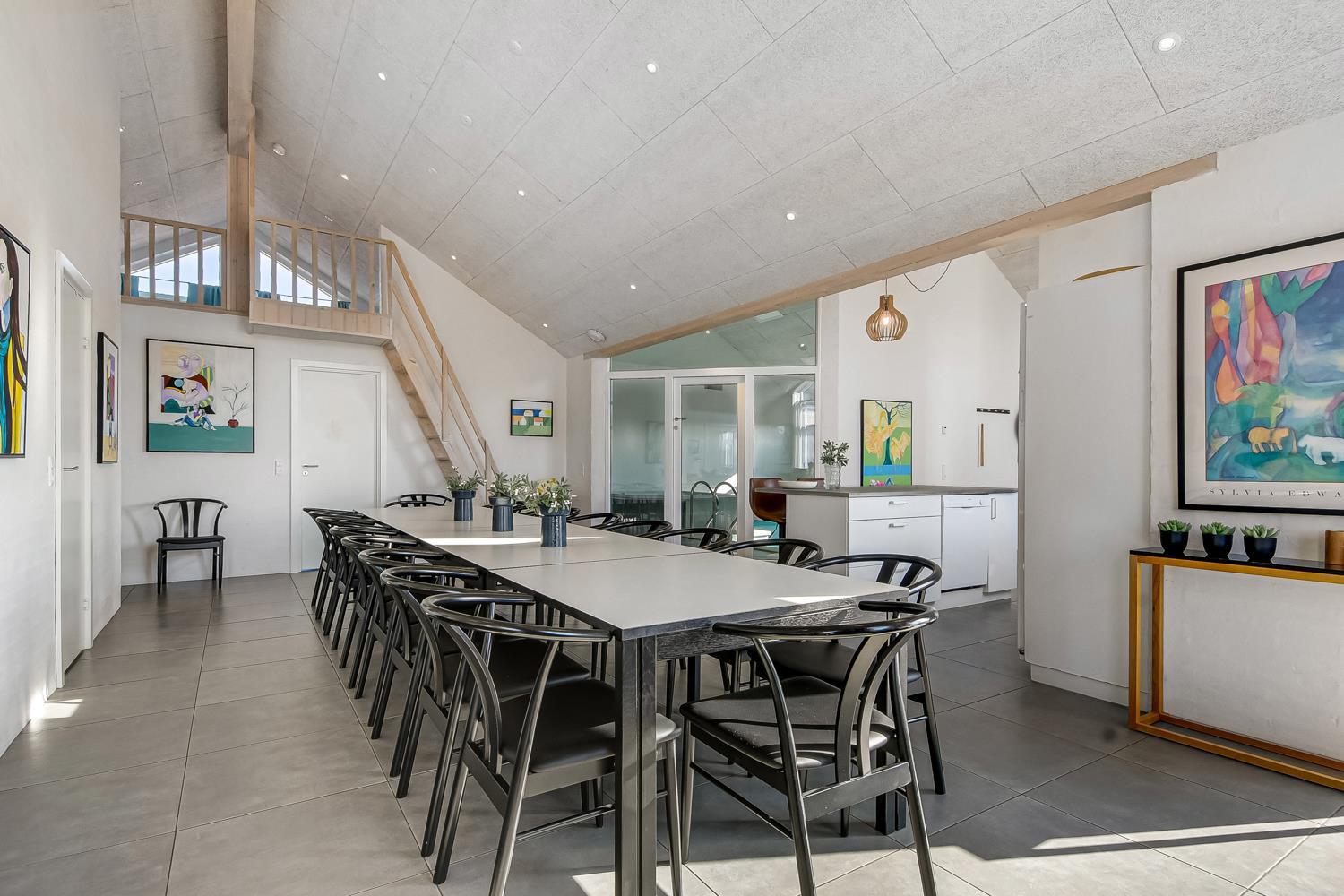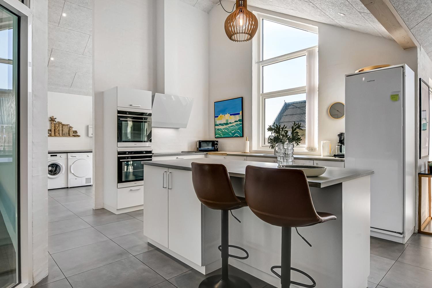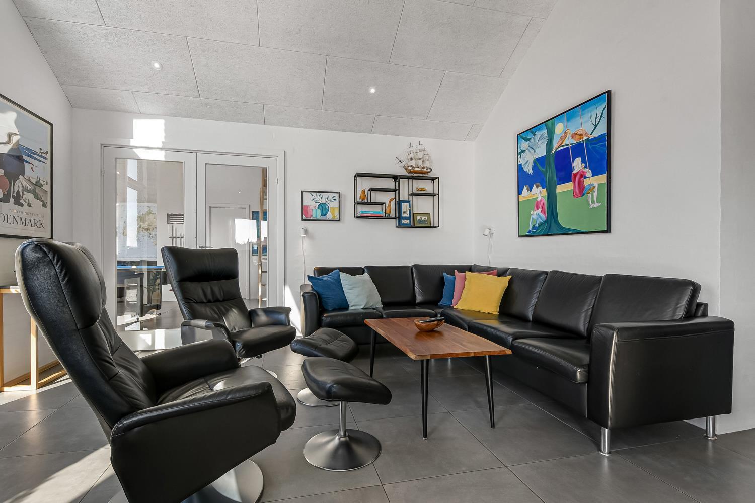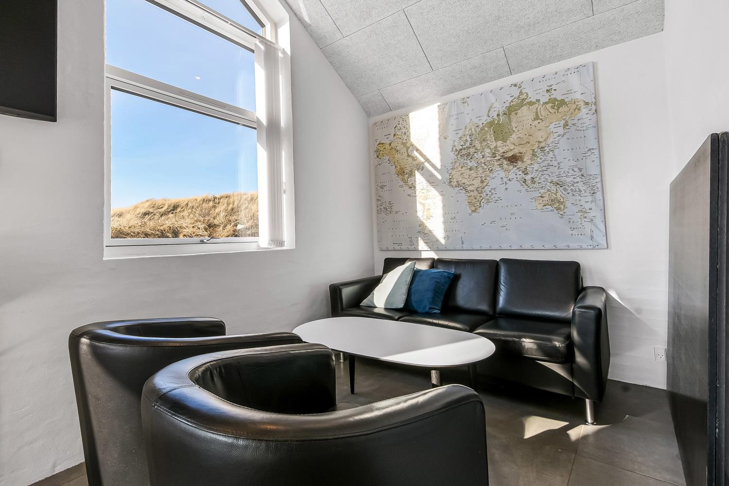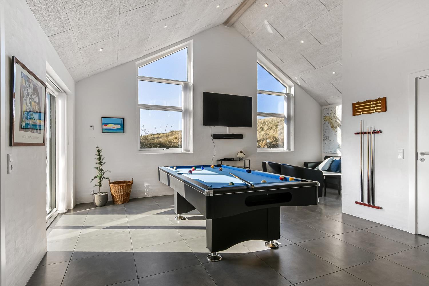 Schon auf dem Weg zu diesem herrlichen Ferienhaus spüren Sie die fantastische Lage des Hauses in der Nähe der großen Dünen an der Nordsee. Das Haus ist 241 m² groß und hat 6 gute Schlafräume: 1DB + 1DB + 1DB + 1DB + 2B + 2B. Außerdem gibt es 8 Schlafplätze, die auf 2 offenen Schlafböden verteilt sind. Im Zentrum des Hauses finden Sie die große, sehr gut ausgestattete Küche mit allem an Geschirr und Kochgeschirr. Küchenecke mit Cerankochfeld, eingebautem Ofen, Abzugshaube, Geschirrspüler, Mikrowelle, großem Kühlschrank und separater Gefriertruhe. Genießen Sie das Essen an dem großen Esstisch, schauen Sie aus den Fenstern und genießen Sie den Blick auf die hohen Dünen direkt an der Nordsee oder relaxen Sie einfach in den weichen Qualitätsmöbeln. Sie können auf dem TV dänische und deutsche Programme sehen oder Sie können Ihre Lieblingsserie streamen auf einem der Fernseher im Haus. Es gibt in allen Aufenthaltsräumen Fliesen mit Fußbodenheizung; das Haus ist sehr reinigungsfreundlich. Die große Wellness-/Poolabteilung des Hauses hat außer dem Pool einen Whirlpool und ein Badezimmer und eine separte Toilette. Ein eingebauter Projektor macht, dass Sie TV auf der grossen weissen Wand sehen können, während dass Sie im Pool oder im Whirlpool sind. Eine schöne Sauna gibt es mit Eingang von Aussen. Im Aktivitätsraum befinden sich ein kombinierter Tischtennis- und Pooltisch, neue Ledermöbel und noch ein Smart-TV, genau wie der andere und auch mit den gleichen Möglichkeiten. 2 Badezimmer: Toilette, Dusche, Waschbecken und Fußbodenheizung. Ausserdem gibt es eine exta Toilette mit Waschbecken und separtem Baderaum bei der Poolabteilung. Ein grosser Flur heisst Sie willkommen und hier gibt es eine Waschmaschine, einen Trockner und einen separaten Gefrierschrank. Für die Kleinsten gibt es ein Kinderbett und Kinderstuhl. Eine neue Luft-Wasser-Anlage macht das Haus extrem energieeffizient und führt auch zu einem günstigeren Stromverbrauch. Max. 2 Haustiere sind erlaubt. Das Haus wird nicht an Jugendgruppen vermietet. Kaution Wintersaison EUR 800 und Sommersaison EUR 500. Wenn Sie ein Elektroauto oder einen Plug-in-Hybrid haben, verfügt das Haus über eine Ladebox.