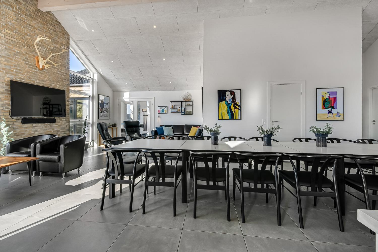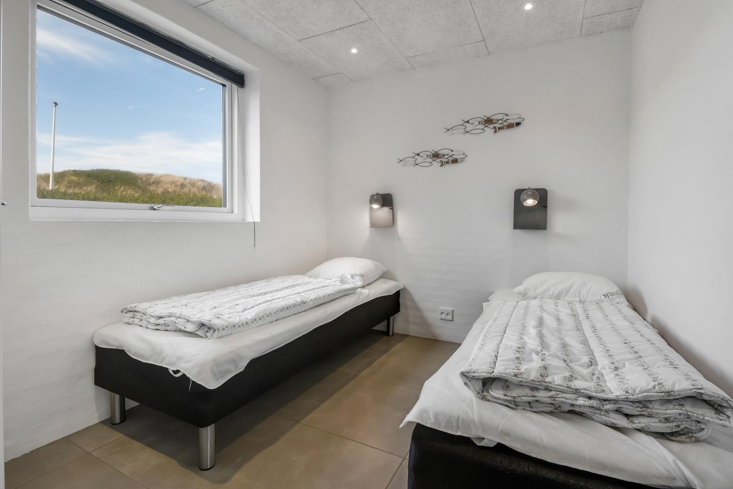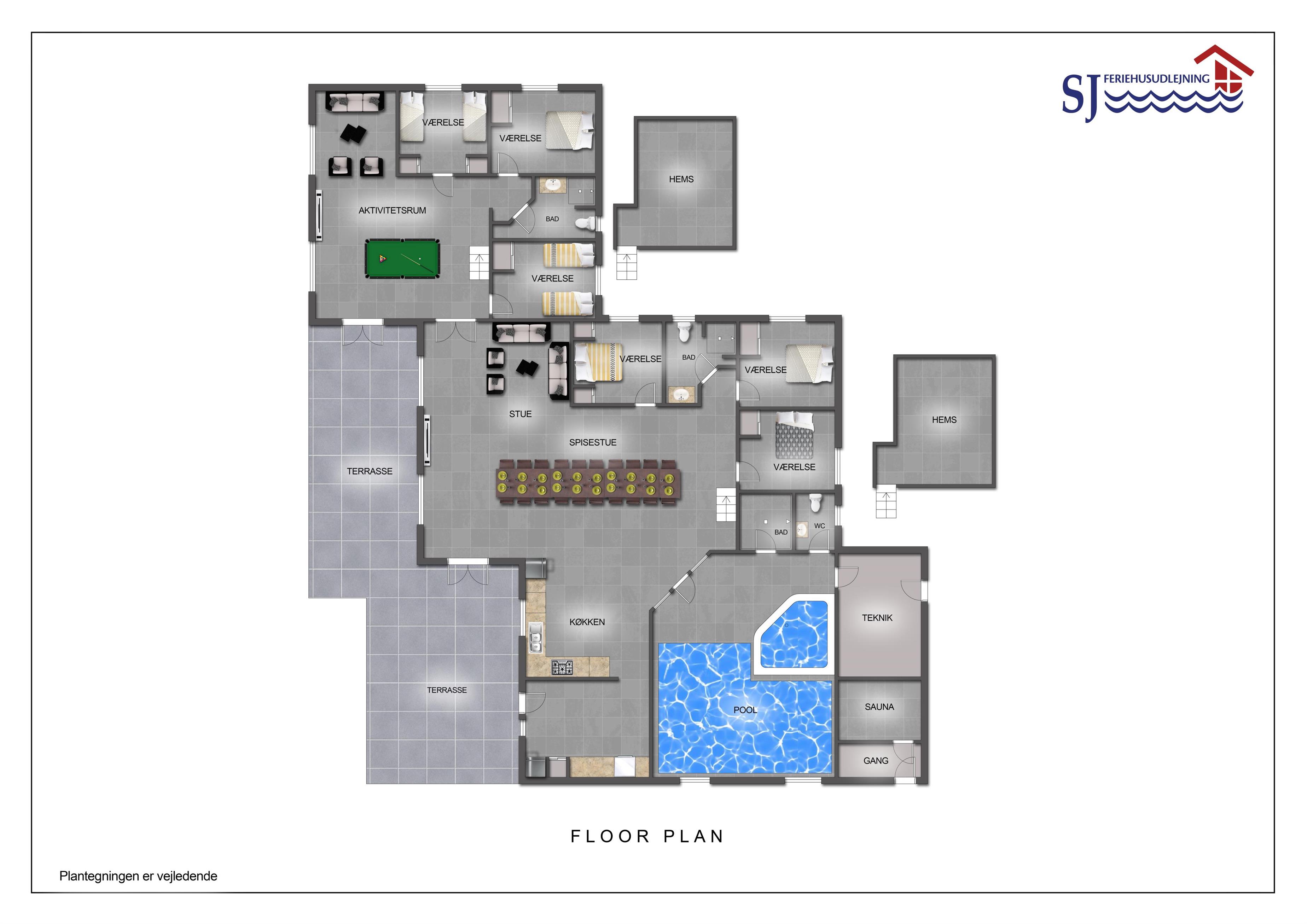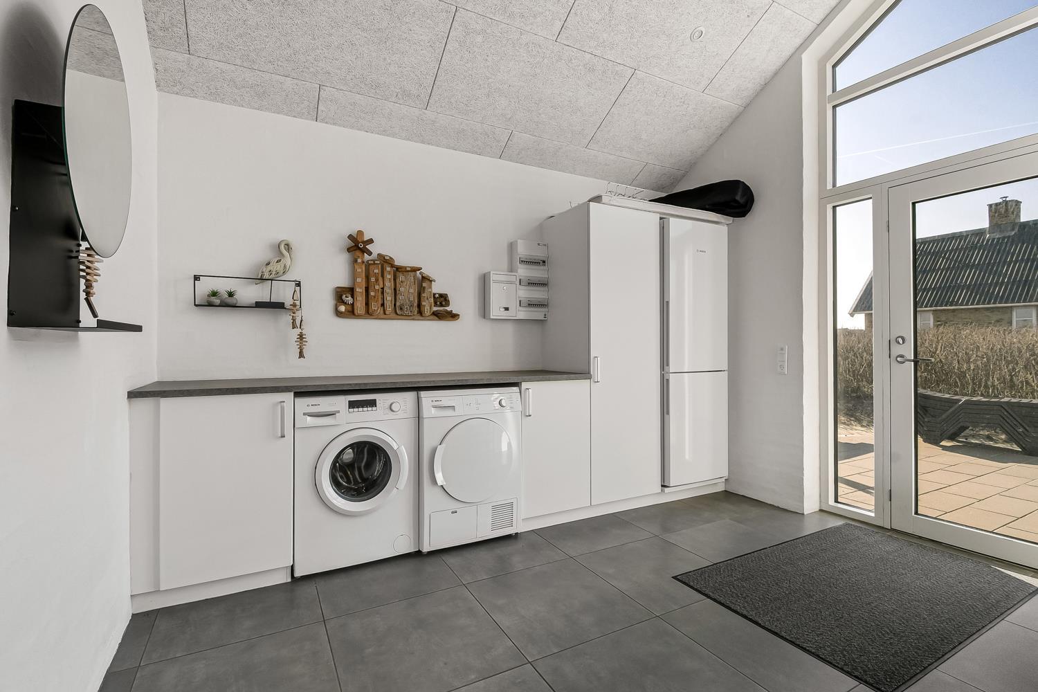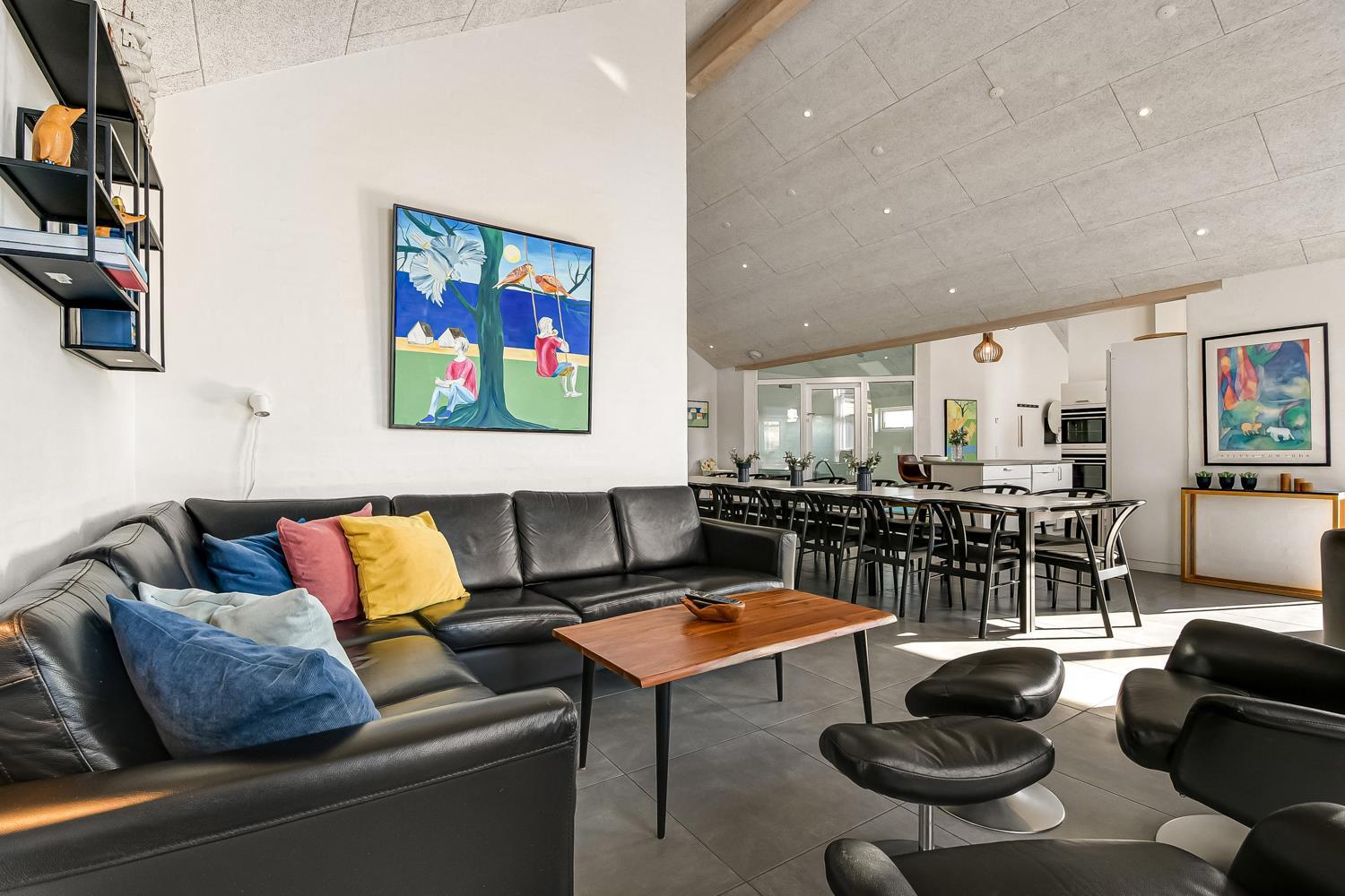 Schon auf dem Weg zu diesem herrlichen Ferienhaus spüren Sie die fantastische Lage des Hauses in der Nähe der großen Dünen an der Nordsee. Das Haus ist 241 m² groß und hat 6 gute Schlafräume: 1DB + 1DB + 1DB + 1DB + 2B + 2B. Außerdem gibt es 8 Schlafplätze, die auf 2 offenen Schlafböden verteilt sind. Im Zentrum des Hauses finden Sie die große, sehr gut ausgestattete Küche mit allem an Geschirr und Kochgeschirr. Küchenecke mit Cerankochfeld, eingebautem Ofen, Abzugshaube, Geschirrspüler, Mikrowelle, großem Kühlschrank und separater Gefriertruhe. Genießen Sie das Essen an dem großen Esstisch, schauen Sie aus den Fenstern und genießen Sie den Blick auf die hohen Dünen direkt an der Nordsee oder relaxen Sie einfach in den weichen Qualitätsmöbeln. Sie können auf dem TV dänische und deutsche Programme sehen oder Sie können Ihre Lieblingsserie streamen auf einem der Fernseher im Haus. Es gibt in allen Aufenthaltsräumen Fliesen mit Fußbodenheizung; das Haus ist sehr reinigungsfreundlich. Die große Wellness-/Poolabteilung des Hauses hat außer dem Pool einen Whirlpool und ein Badezimmer und eine separte Toilette. Ein eingebauter Projektor macht, dass Sie TV auf der grossen weissen Wand sehen können, während dass Sie im Pool oder im Whirlpool sind. Eine schöne Sauna gibt es mit Eingang von Aussen. Im Aktivitätsraum befinden sich ein kombinierter Tischtennis- und Pooltisch, neue Ledermöbel und noch ein Smart-TV, genau wie der andere und auch mit den gleichen Möglichkeiten. 2 Badezimmer: Toilette, Dusche, Waschbecken und Fußbodenheizung. Ausserdem gibt es eine exta Toilette mit Waschbecken und separtem Baderaum bei der Poolabteilung. Ein grosser Flur heisst Sie willkommen und hier gibt es eine Waschmaschine, einen Trockner und einen separaten Gefrierschrank. Für die Kleinsten gibt es ein Kinderbett und Kinderstuhl. Eine neue Luft-Wasser-Anlage macht das Haus extrem energieeffizient und führt auch zu einem günstigeren Stromverbrauch. Max. 2 Haustiere sind erlaubt. Das Haus wird nicht an Jugendgruppen vermietet. Kaution Wintersaison EUR 800 und Sommersaison EUR 500. Wenn Sie ein Elektroauto oder einen Plug-in-Hybrid haben, verfügt das Haus über eine Ladebox.