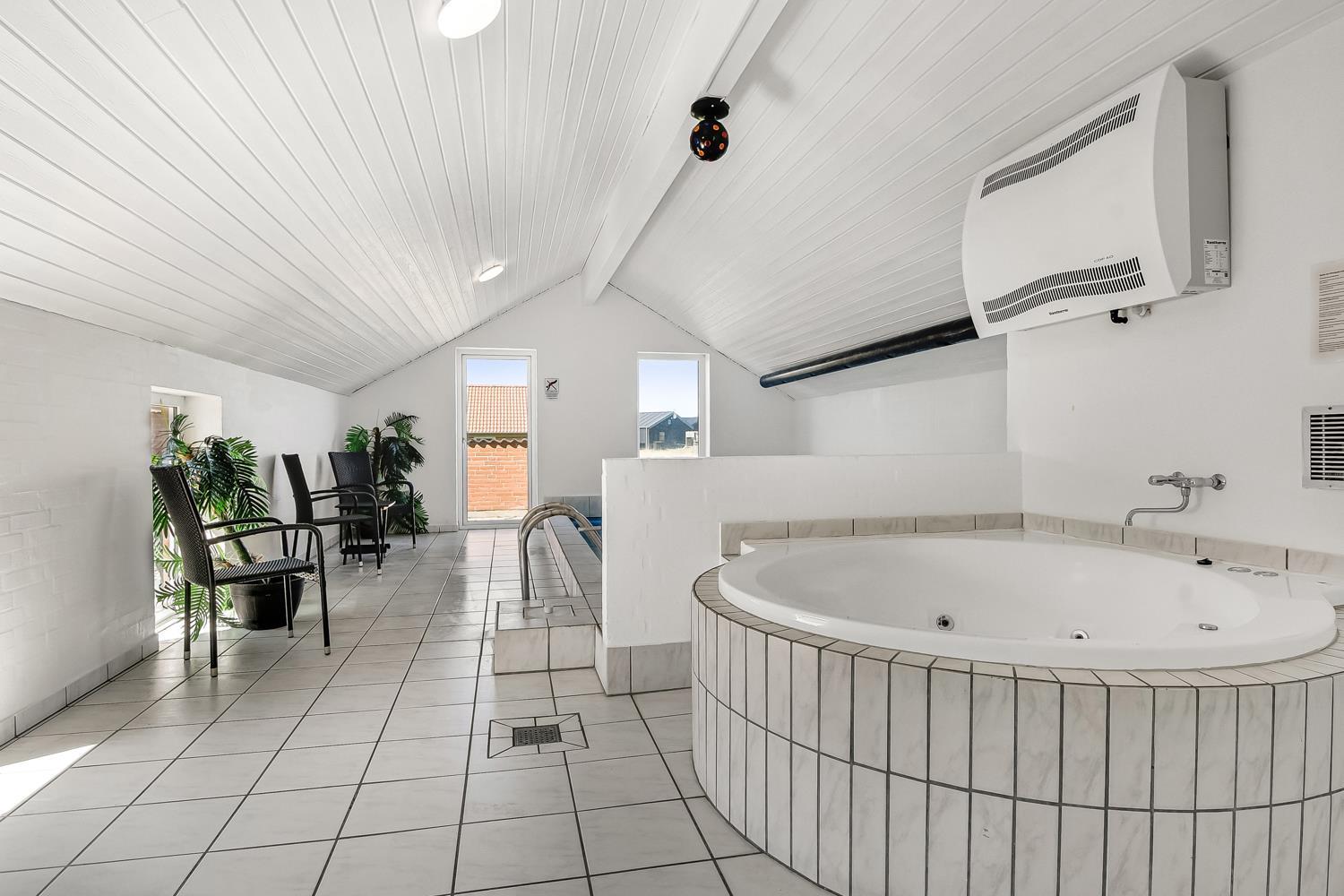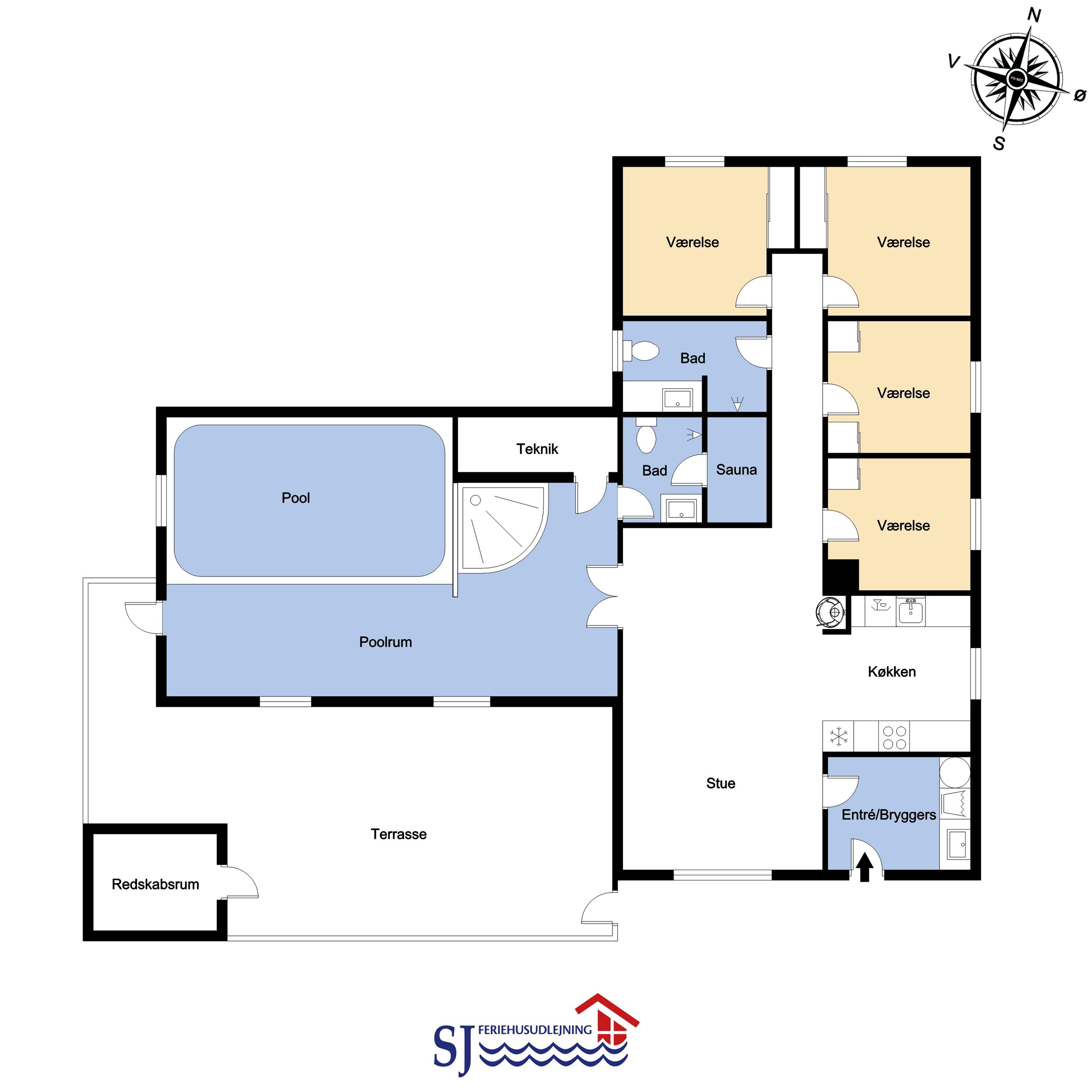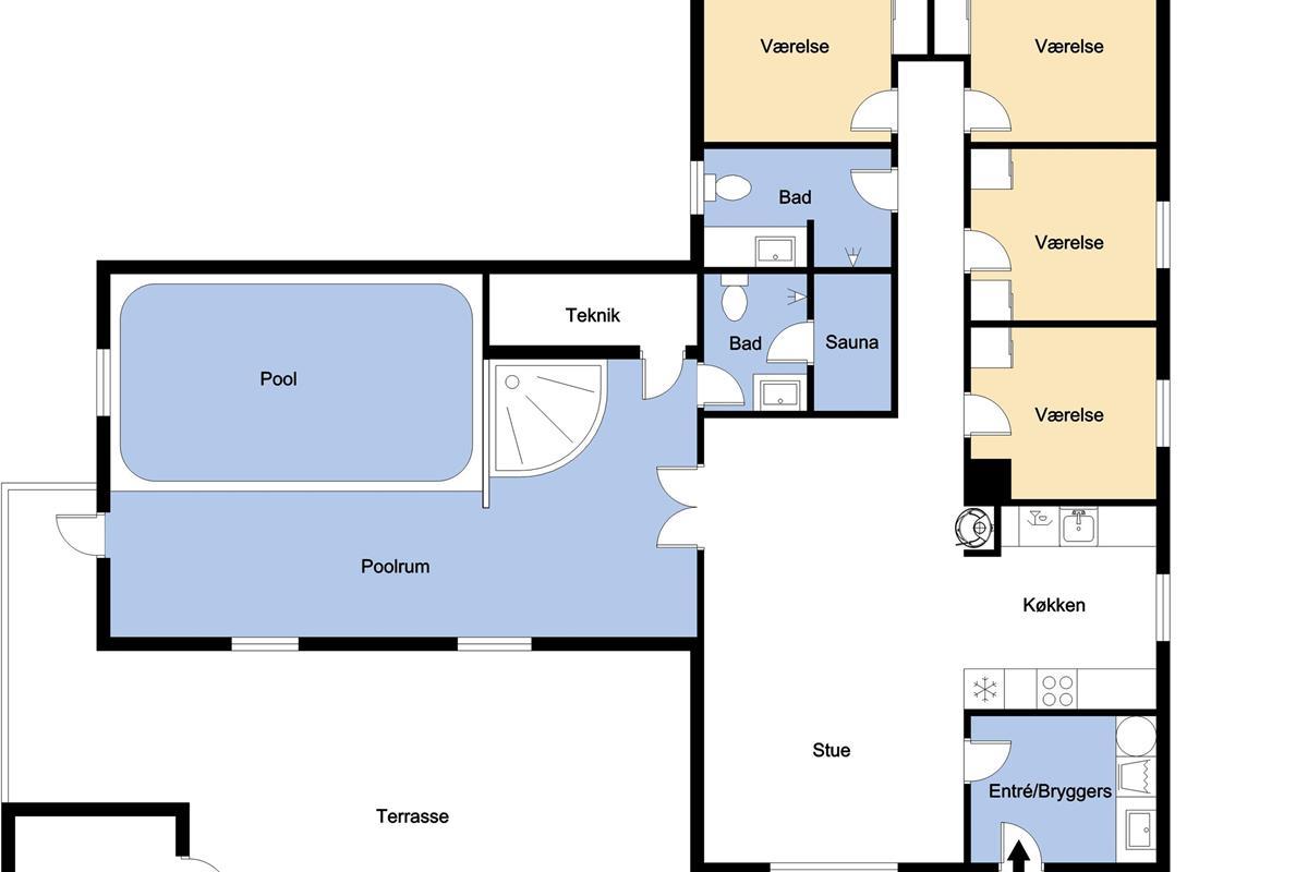 Das Haus ist 153 m² gross und hat 4 schöne Schlafräume: 1DB + 1DB + 2B + 2B mit Komfortbetten. Im Herzen des Hauses finden Sie die gut ausgestattete Küche mit Herd mit Cerankochfeld, Abzugshaube, Geschirrspüler, Mikrowelle und Kühlschrank mit Gefrierfach. Geniessen Sie Ihr Essen am Esstisch oder entspannen Sie einfach in den Ledermöbeln. Smart-TV mit dänischen und deutschen Programmen, Radio und die Möglichkeit zum Streaming. Möchten Sie die Stimmung erhöhen, dann machen Sie den Kaminofen an, wo Sie die intensive Wärme und den Blick in die Flammen geniessen können. Es gibt Fliesenboden mit Fussbodenheizung im Wohnraum und dem Küchebereich. Die Schlafräume sind mit Holzböden ausgelegt. Der Wellnessbereich des Hauses ist die Poolabteilung mit dem Whirlpool, der Sauna und natürlich auch mit dem Pool eingerichtet. 2 Badezimmer mit Toilette, Dusche, Waschbecken und Fussbodenheizung. Waschmaschine und Trockner sind natürlich auch vorhanden und stehen im Flur. Nichtraucher- Haus. Max. 2 Haustiere sind erlaubt. Kaution Wintersaison EUR 400 und Sommersaison EUR 300. Obligatorische Endreinigung.
