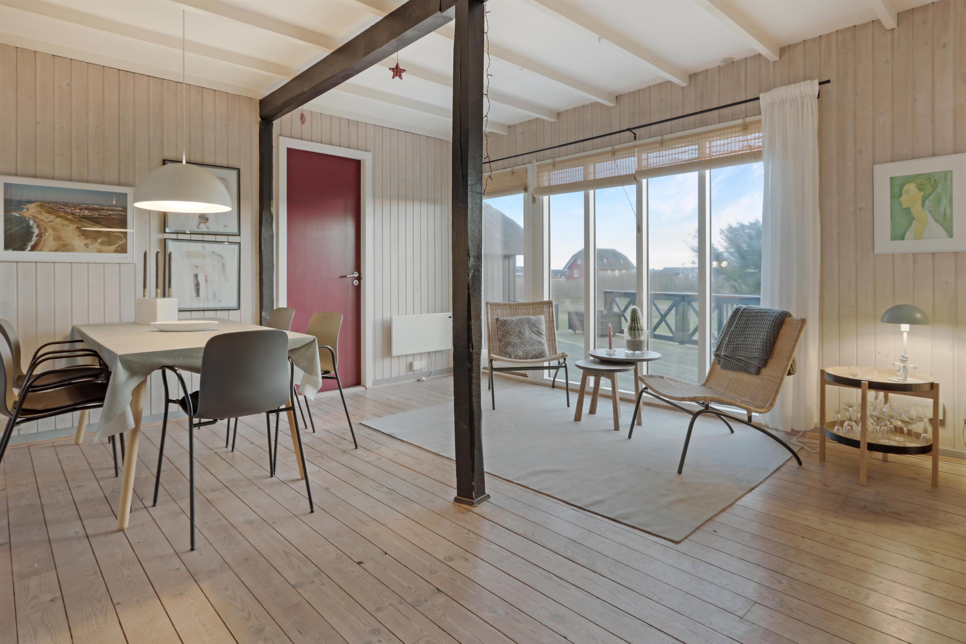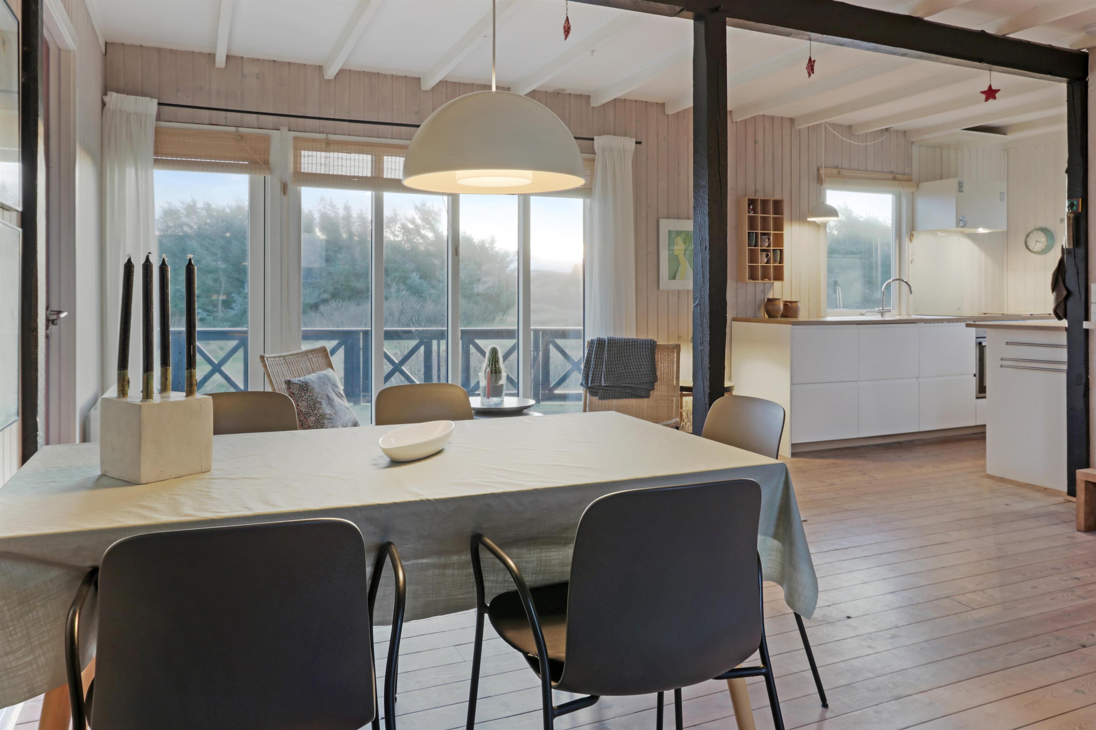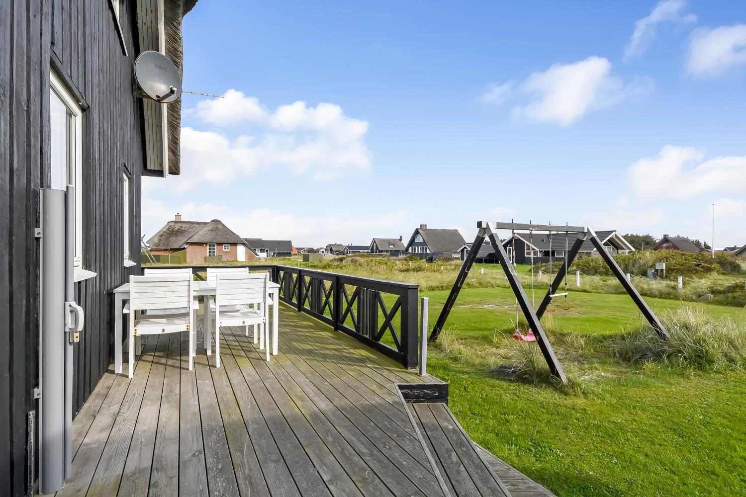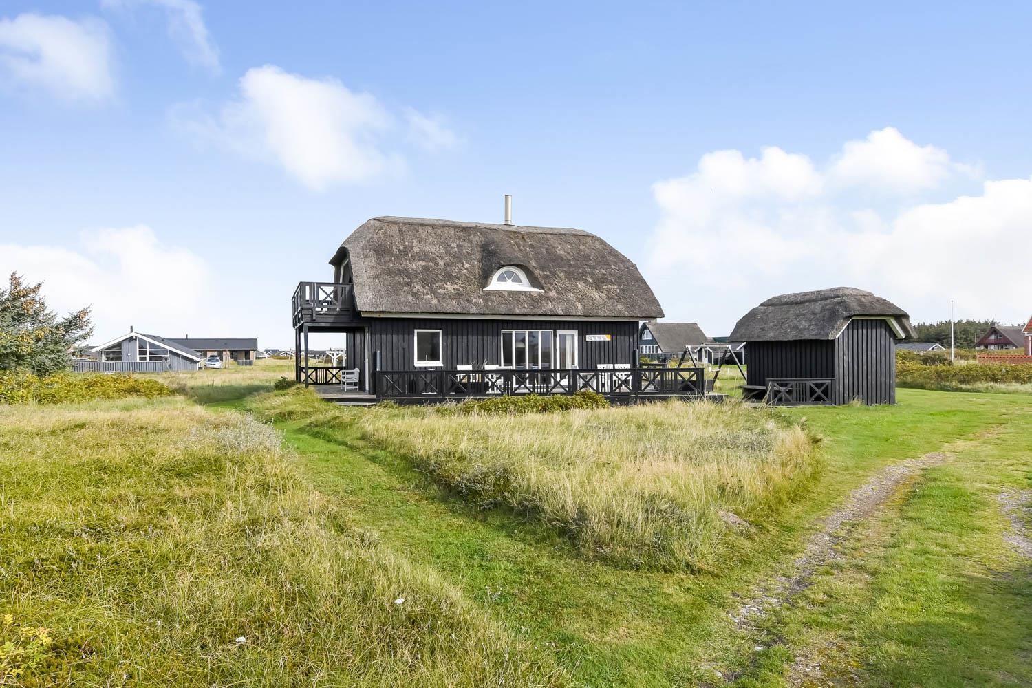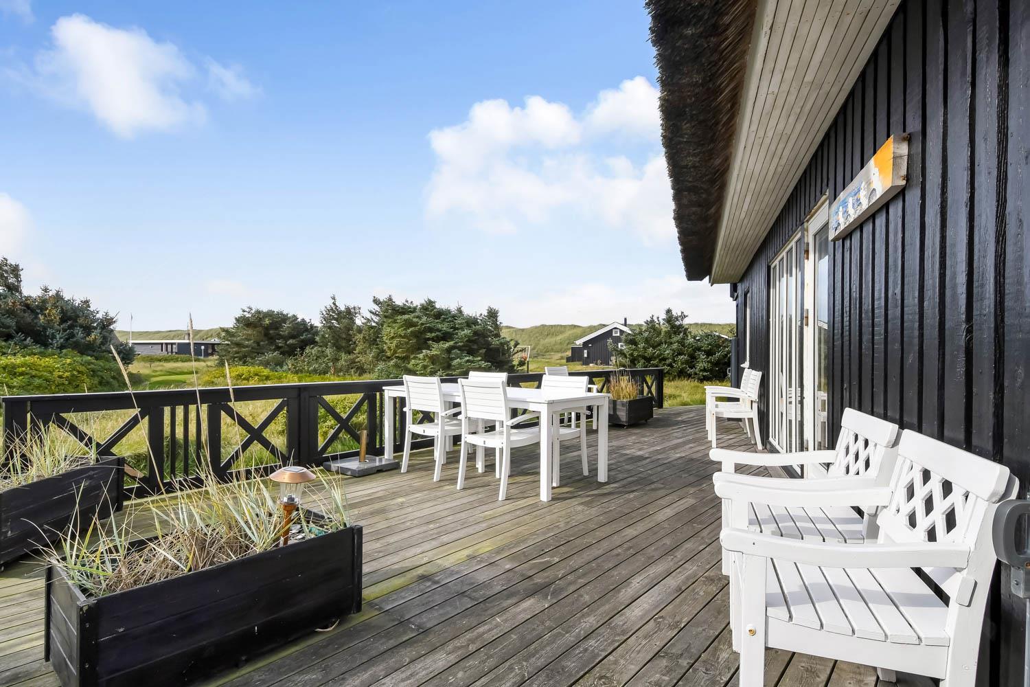Das Ferienhaus liegt auf einem 2.616 m² grossen Dünengrundstück bloss 100 m von der Nordsee entfernt. Schöne romatische Terrasseanlage mit Gartenmöbeln, Sonnenliegen und Grill. Geniessen Sie die einmalige Möglichkeit die Sonne zu geniessen, oder miteinander einen gemütlichen Grillabend. Machen Sie einen Spaziergang mit dem Hund in der ruhigen Ferienhausgegend über die hohen Dünen und unmittelbar danach offenbart sich die Nordsee. Jeden Tag bietet die Nordsee neue malerische Erlebnisse, die zu einem flotten Spaziergang oder Joggen einladen. Oder wie wäre es mit einer kleinen Reise von rd. 10 - 15 Minuten bis zum kleinen Lebensmittelgeschäft der Gegend, das während der Saison geöffnet ist und ein frisches Frühstück bietet und in dem auch täglich eingekauft werden kann. Egal, ob Sie im aktiven Urlaub sind oder sich total entspannen, dieses schöne Ferienhaus bietet den perfekten Rahmen in Bezug auf Haus, Lage und Umgebung. Innerhalb einer kurzen Autofahrt erreichen Sie sowohl die aktive Handelsstadt Lemvig mit mehreren Fachgeschäften als auch das einzigartige Fischerdorf Thyborøn, das neben dem aktiven Fischerhafen auch einen Strand und verschiedene Aktivitäten bietet, die alle einen Besuch wert sind.