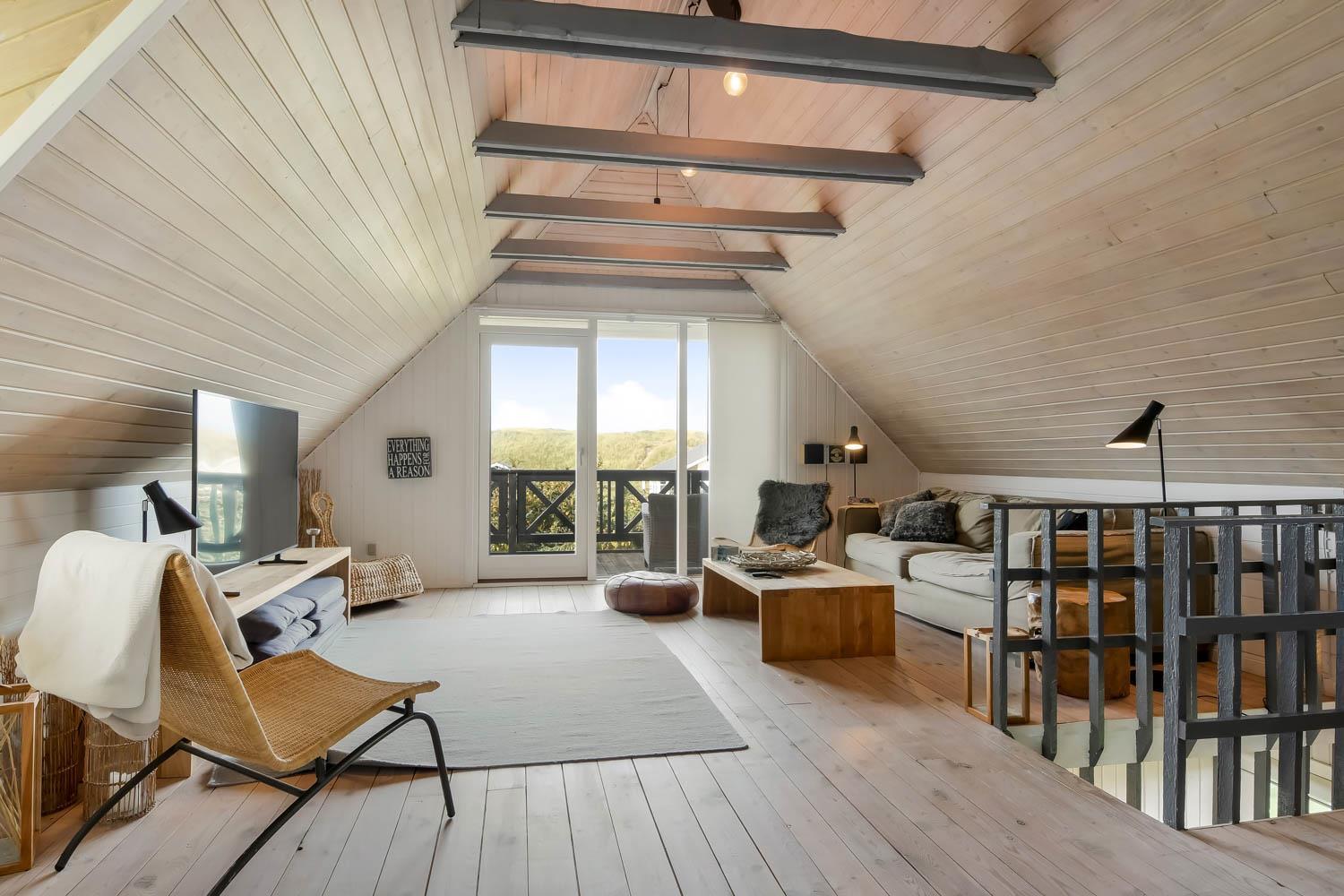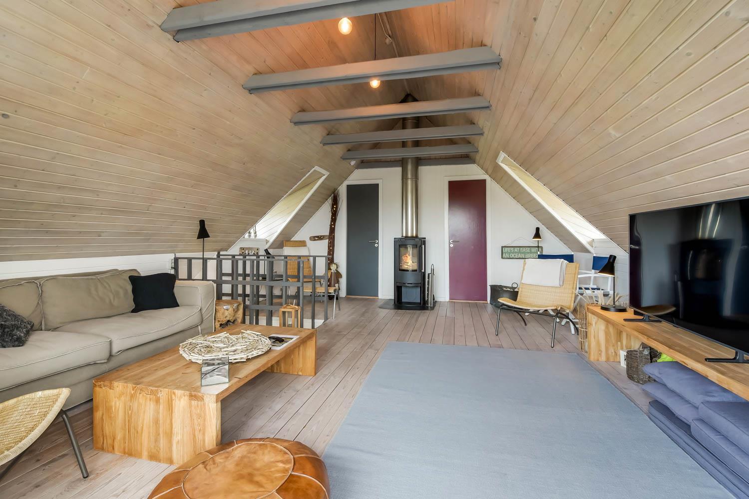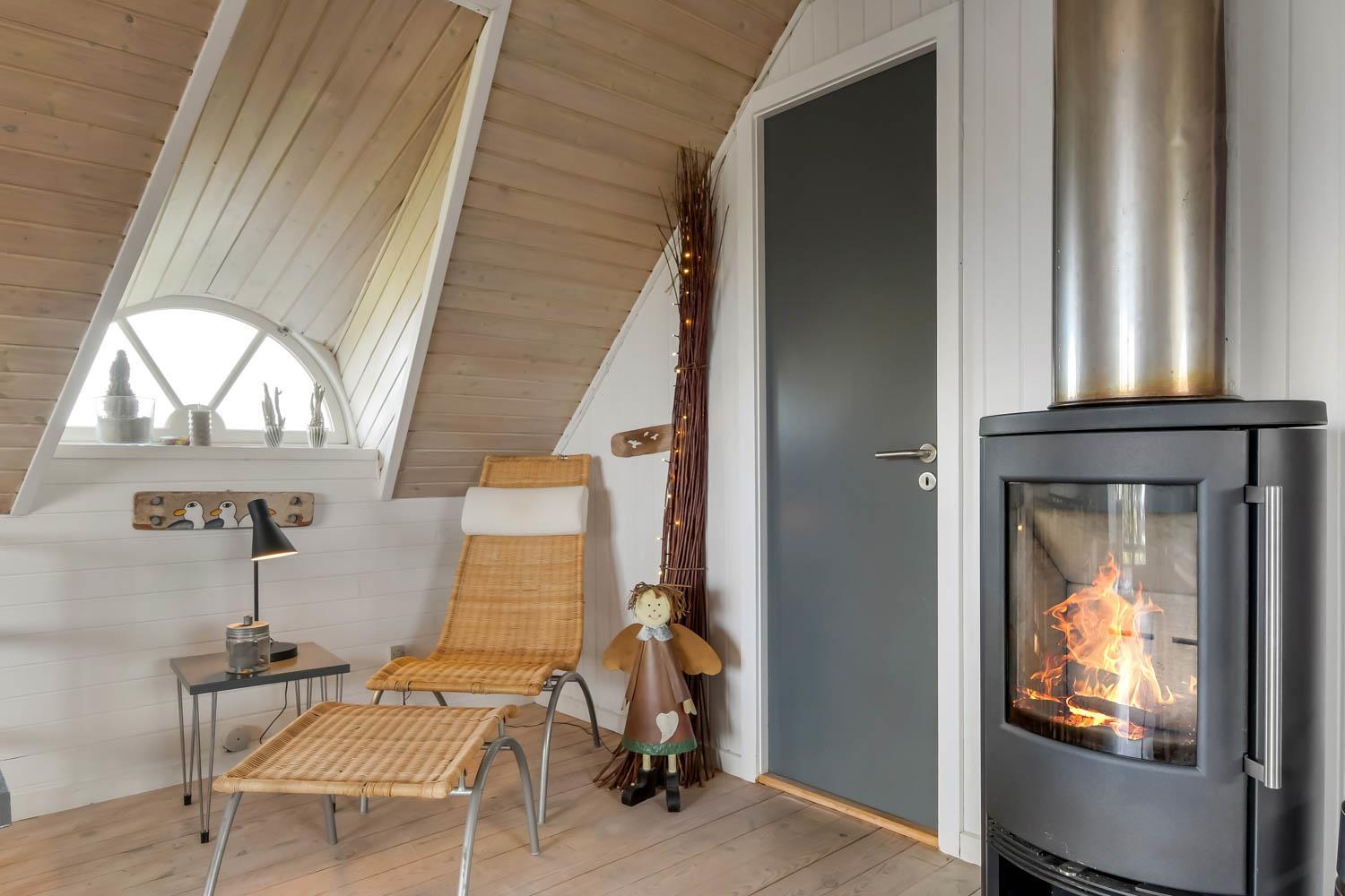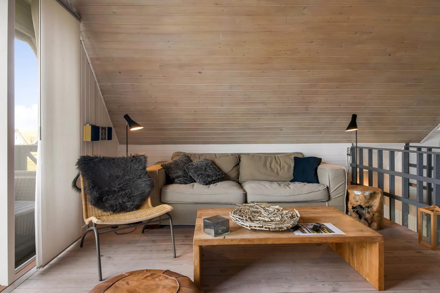 Im Wohnraum kommen Sie über die Treppe zum 1. Stock. Hier gibt es noch einen Wohnraum. Von dem 55” Smart-TV können Sie dänische Programme 1 und TV 2 und viele ausländische und deutsche Programme sehen. Ausserdem haben Sie die Möglichkeit Ihr eigenes Programm zu streamen von Ihrem Handy oder Laptop. Geniessen Sie die Flammen in dem gemütlichen Kaminofen, der zusammen mit der Wärmepumpe im Parterre für einen minimalen Verbrauch für die Wärme sorgt. Ausgang vom Balkon mit einmaligem Blick zur Nordsee. Im 1. Stock gibt es auch 2 von den schönen Schlafräumen: 1DB + 1DB. Es gibt praktische Holzböden in allen Räumen und das Haus ist sehr pflegeleicht. Badezimmer mit Toilette, Dusche, Waschbecken, Waschmaschine und Fliesenboden mit Fussbodenheizung. Max. 2 Haustiere ist erlaubt. Nichtraucher-Haus.