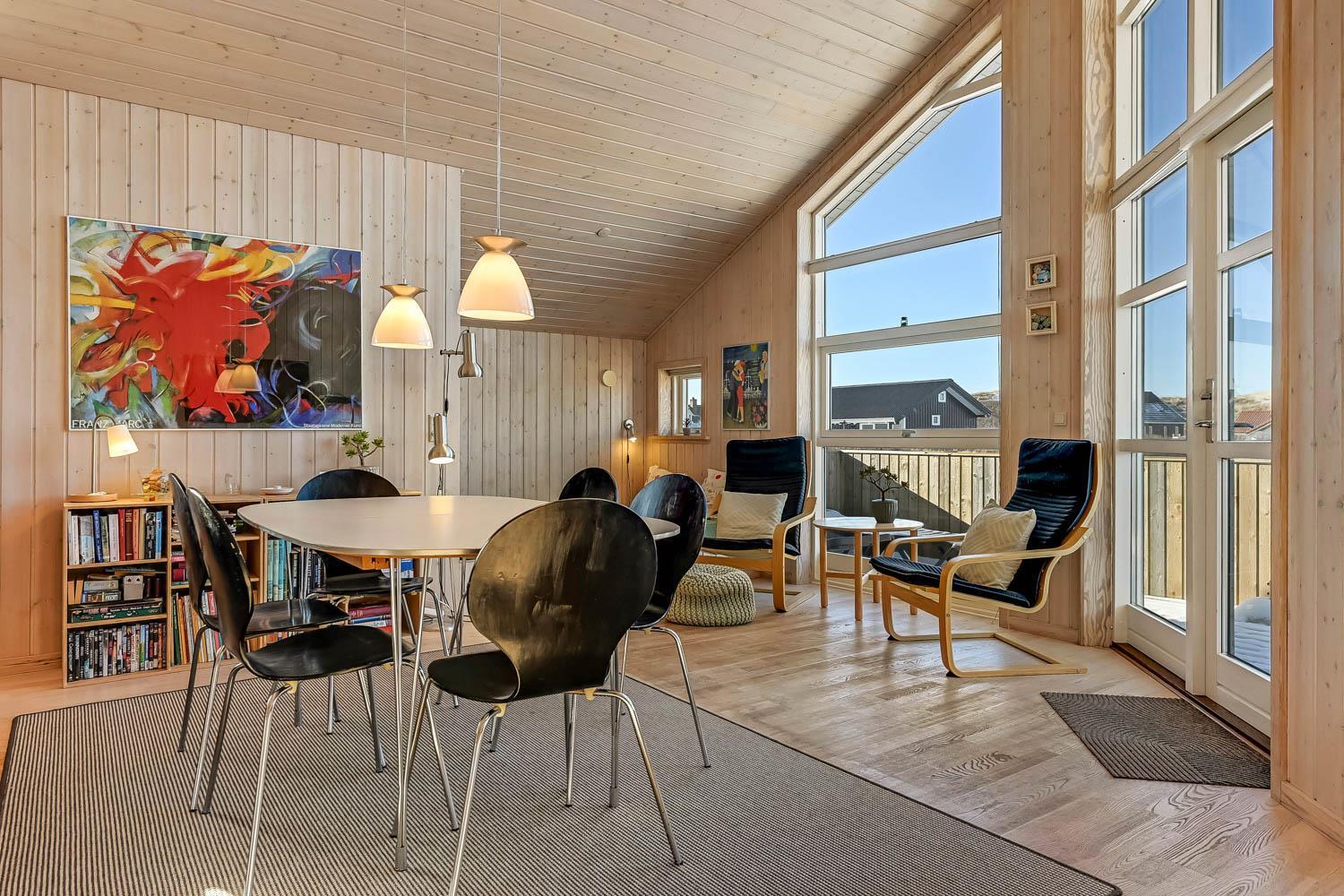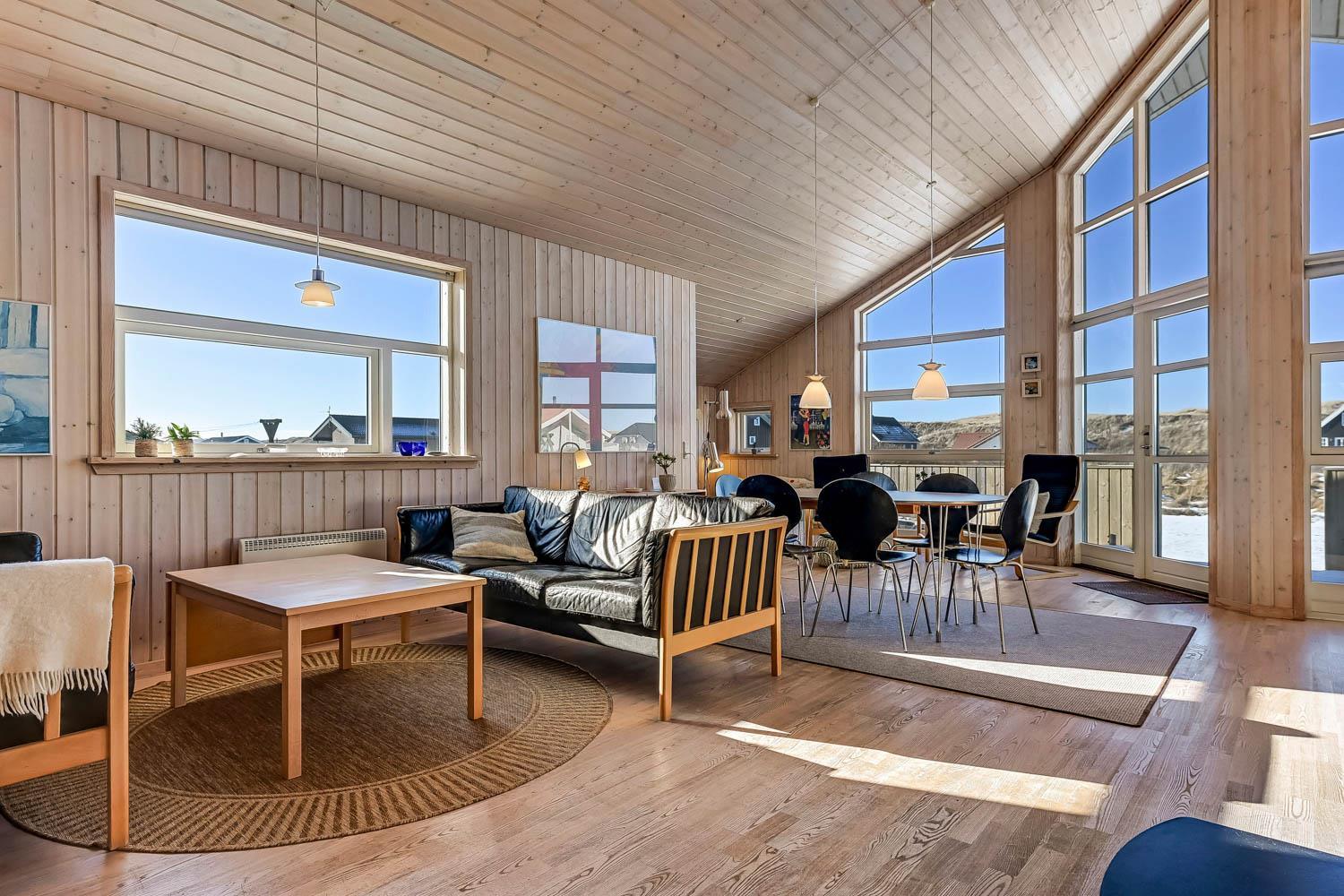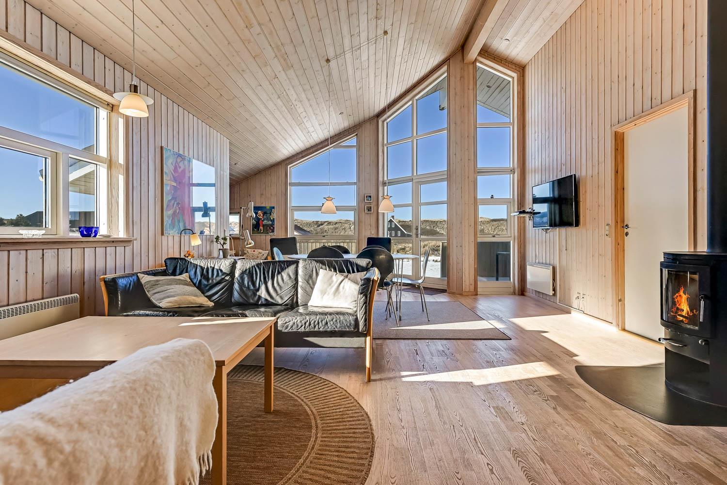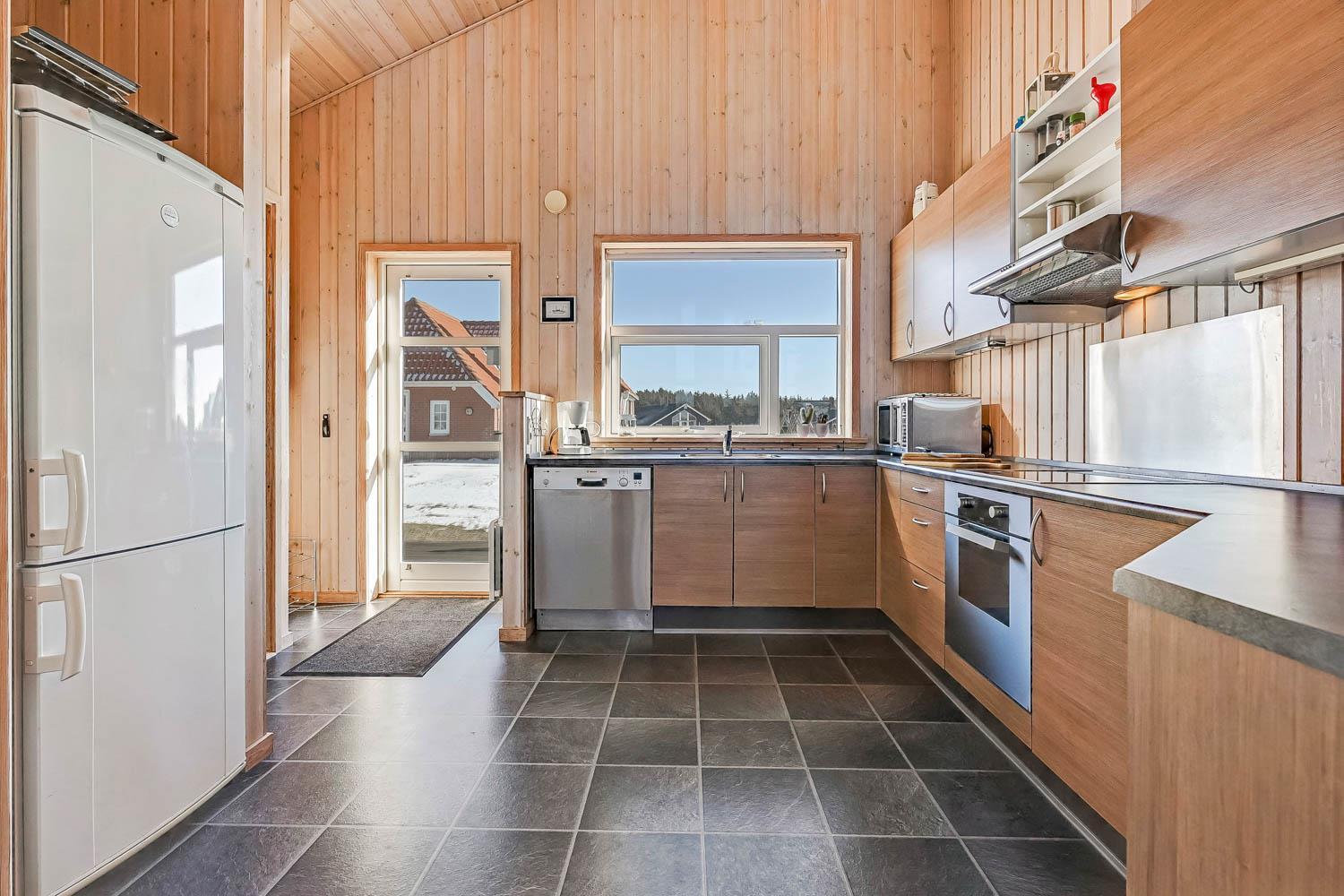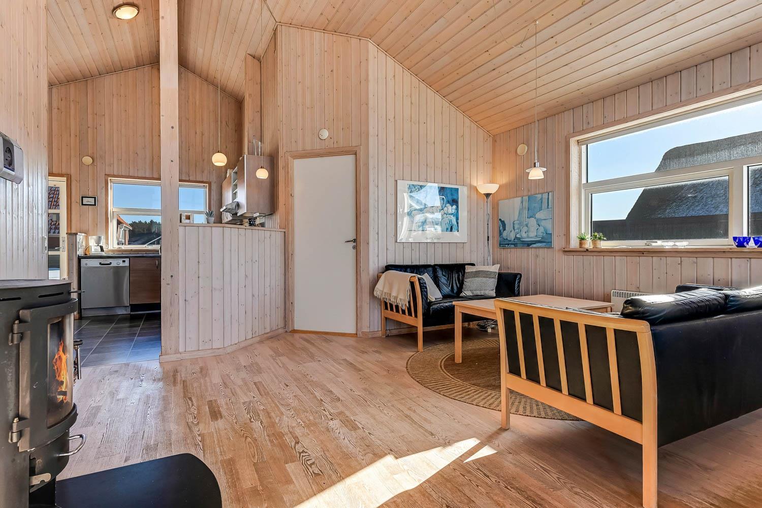 Dieses schöne und gut eingerichtete Ferienhaus aus Holz ist mit guter Möblierung ausgestattet. Der Wohnraum und die Küche sind kombiniert und es gibt einen Ausgang zu einer teilweise überdachten Terrasse. Der Wohnraum hat gute Ledermöbel und einen Esstisch mit Stühlen. Ein schöner Kaminofen sorgt für eine gute Wärme, egal zu welcher Jahreszeit. Es gibt TV mit Parabolantenne (nur deutsche Programme). Vom Wohnraum ist der Zugang zu 2 Schlafräumen im Haus, einer mit 1DB und einer mit 2B. Von der Küche gibt es einen Zugang zu dem letzen Schlafraum, der mit 2B eingerichtet ist. Das Badezimmer ist mit Toilette, Dusche, Waschbecken, Whirlpool und Sauna ausgestattet. Außerdem gibt es hier auch Waschmaschine und Trockner. In dem Badezimmer gibt es Fußbodenheizung und Fliesenboden. Gut ausgestattete Küche mit Herd mit Cerankochfeld, Geschirrspüler, Abzugshaube, Mikrowelle, Kühl-/Gefrierschrank. Es gibt Holzboden in allen Räumen und in der Küche gibt es Vinylboden. Haustiere sind nicht erlaubt. Nichtraucher-Haus.