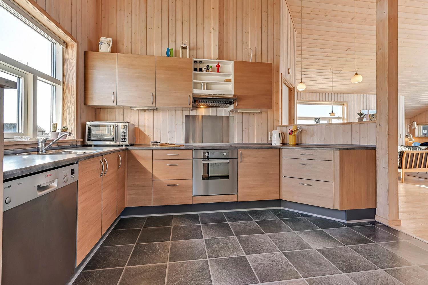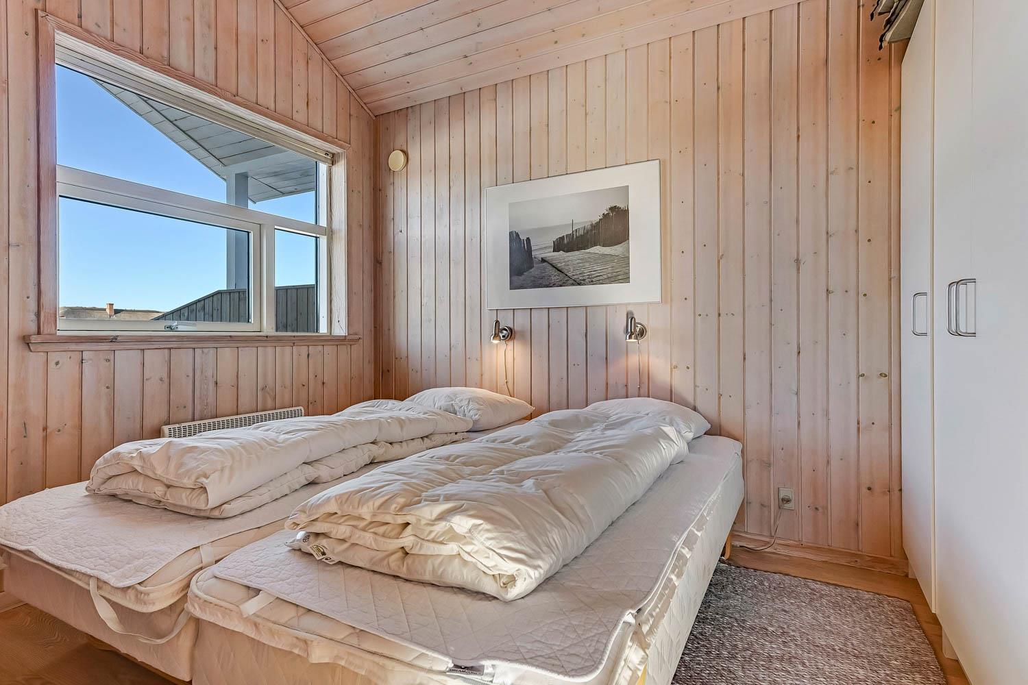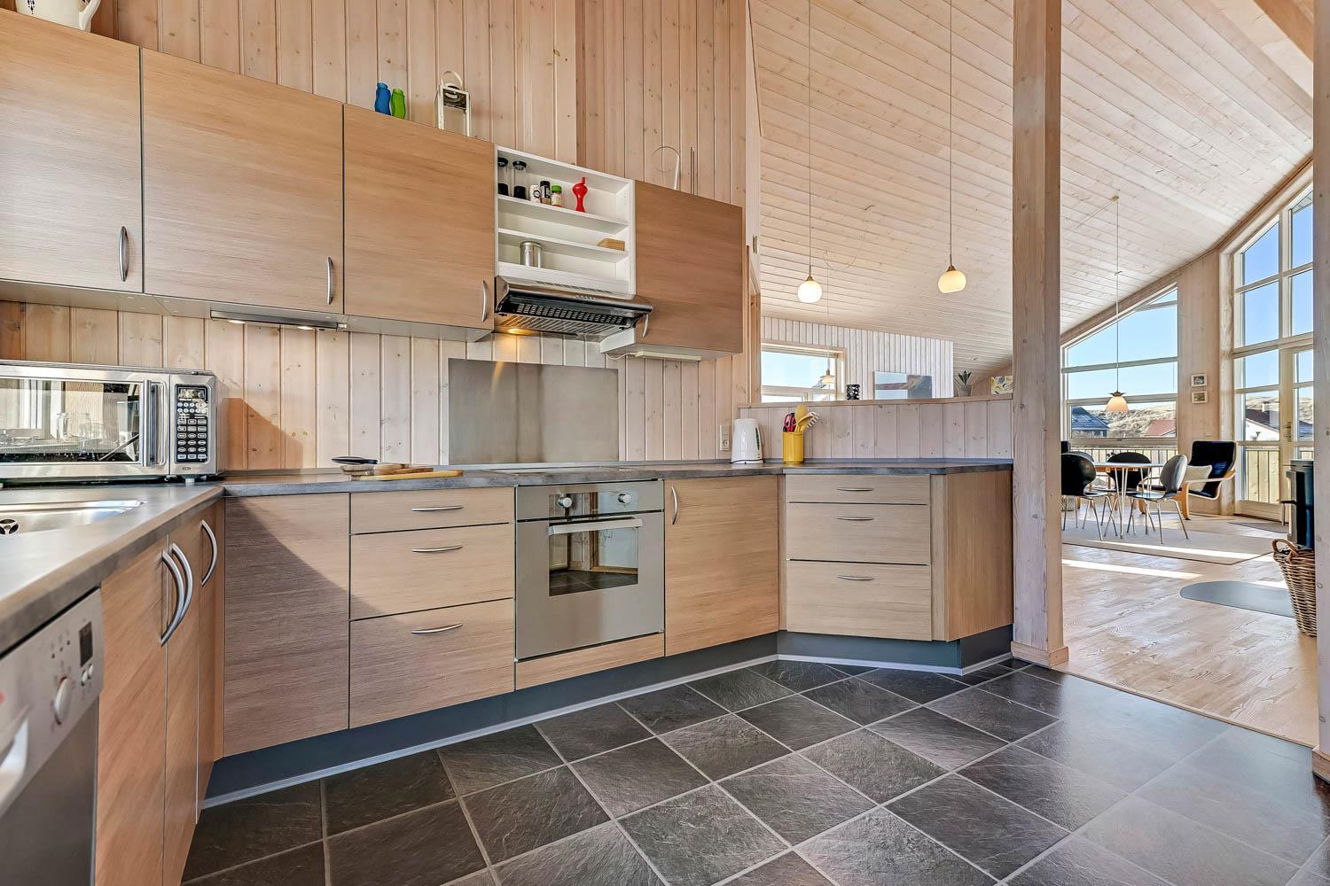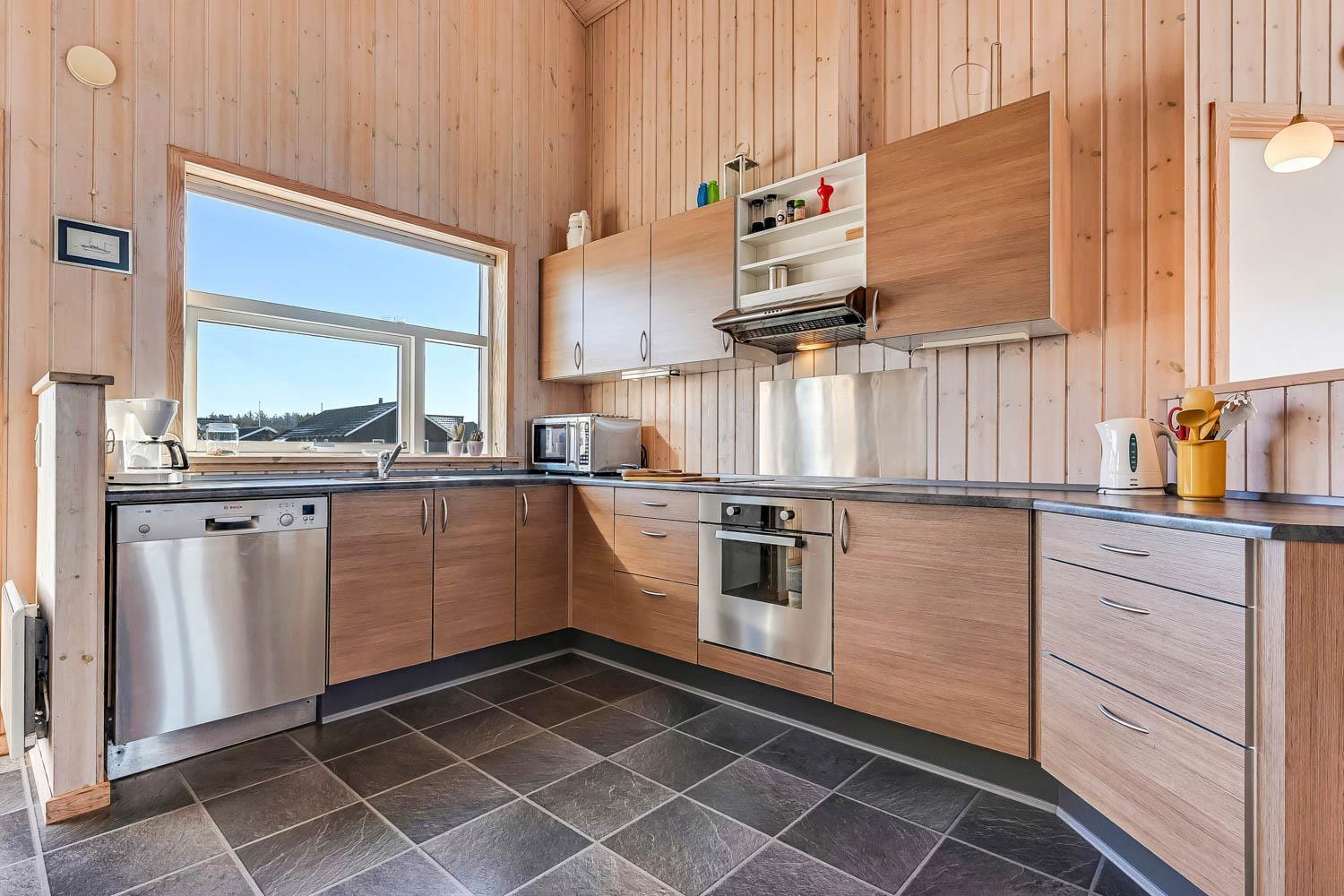 Dieses schöne und gut eingerichtete Ferienhaus aus Holz ist mit guter Möblierung ausgestattet. Der Wohnraum und die Küche sind kombiniert und es gibt einen Ausgang zu einer teilweise überdachten Terrasse. Der Wohnraum hat gute Ledermöbel und einen Esstisch mit Stühlen. Ein schöner Kaminofen sorgt für eine gute Wärme, egal zu welcher Jahreszeit. Es gibt TV mit Parabolantenne (nur deutsche Programme). Vom Wohnraum ist der Zugang zu 2 Schlafräumen im Haus, einer mit 1DB und einer mit 2B. Von der Küche gibt es einen Zugang zu dem letzen Schlafraum, der mit 2B eingerichtet ist. Das Badezimmer ist mit Toilette, Dusche, Waschbecken, Whirlpool und Sauna ausgestattet. Außerdem gibt es hier auch Waschmaschine und Trockner. In dem Badezimmer gibt es Fußbodenheizung und Fliesenboden. Gut ausgestattete Küche mit Herd mit Cerankochfeld, Geschirrspüler, Abzugshaube, Mikrowelle, Kühl-/Gefrierschrank. Es gibt Holzboden in allen Räumen und in der Küche gibt es Vinylboden. Haustiere sind nicht erlaubt. Nichtraucher-Haus.