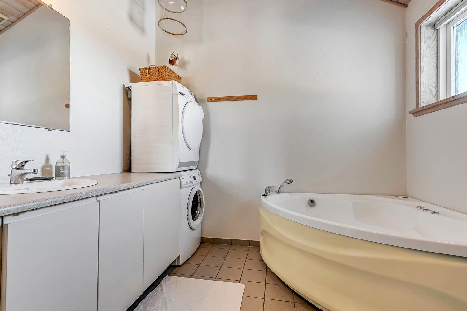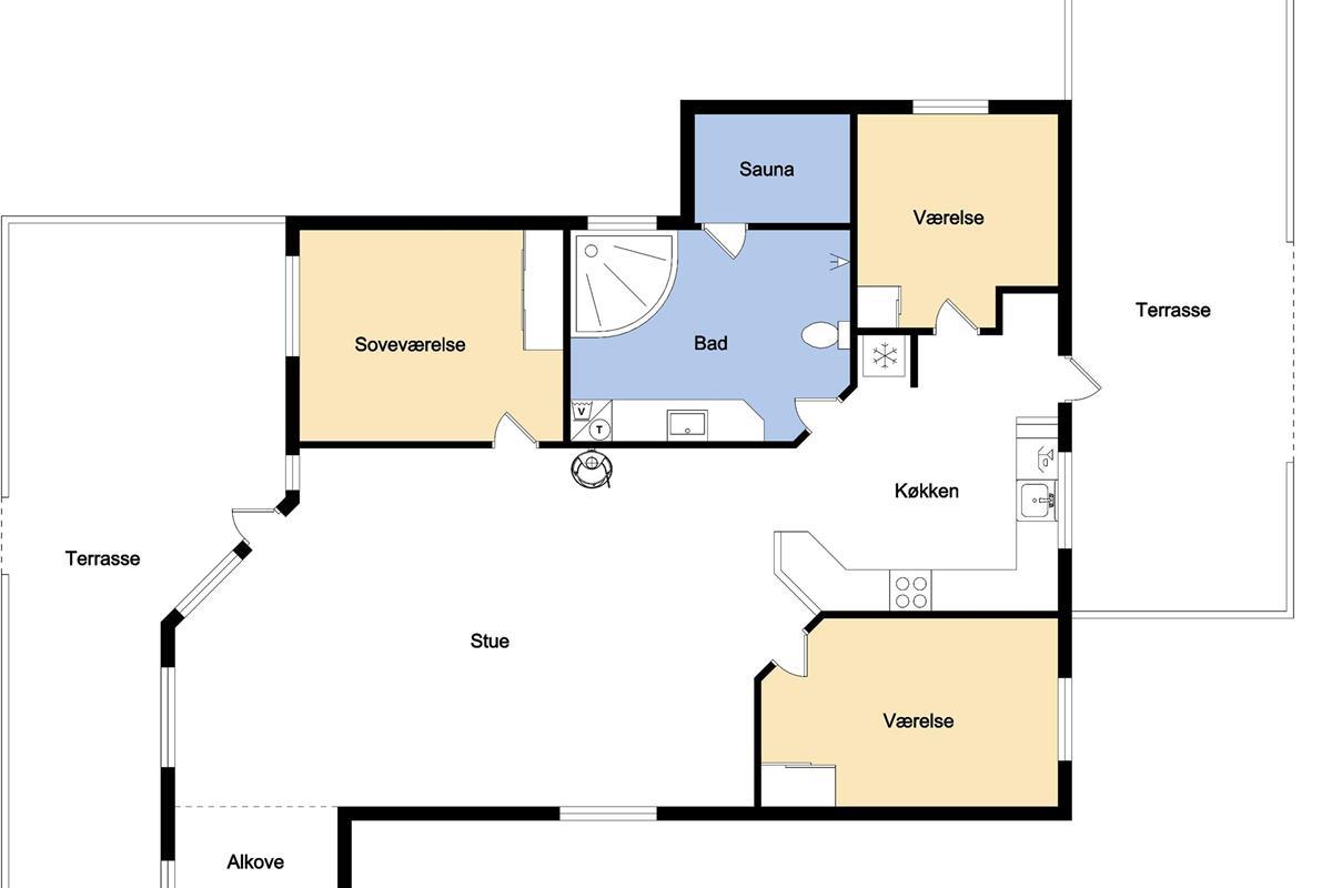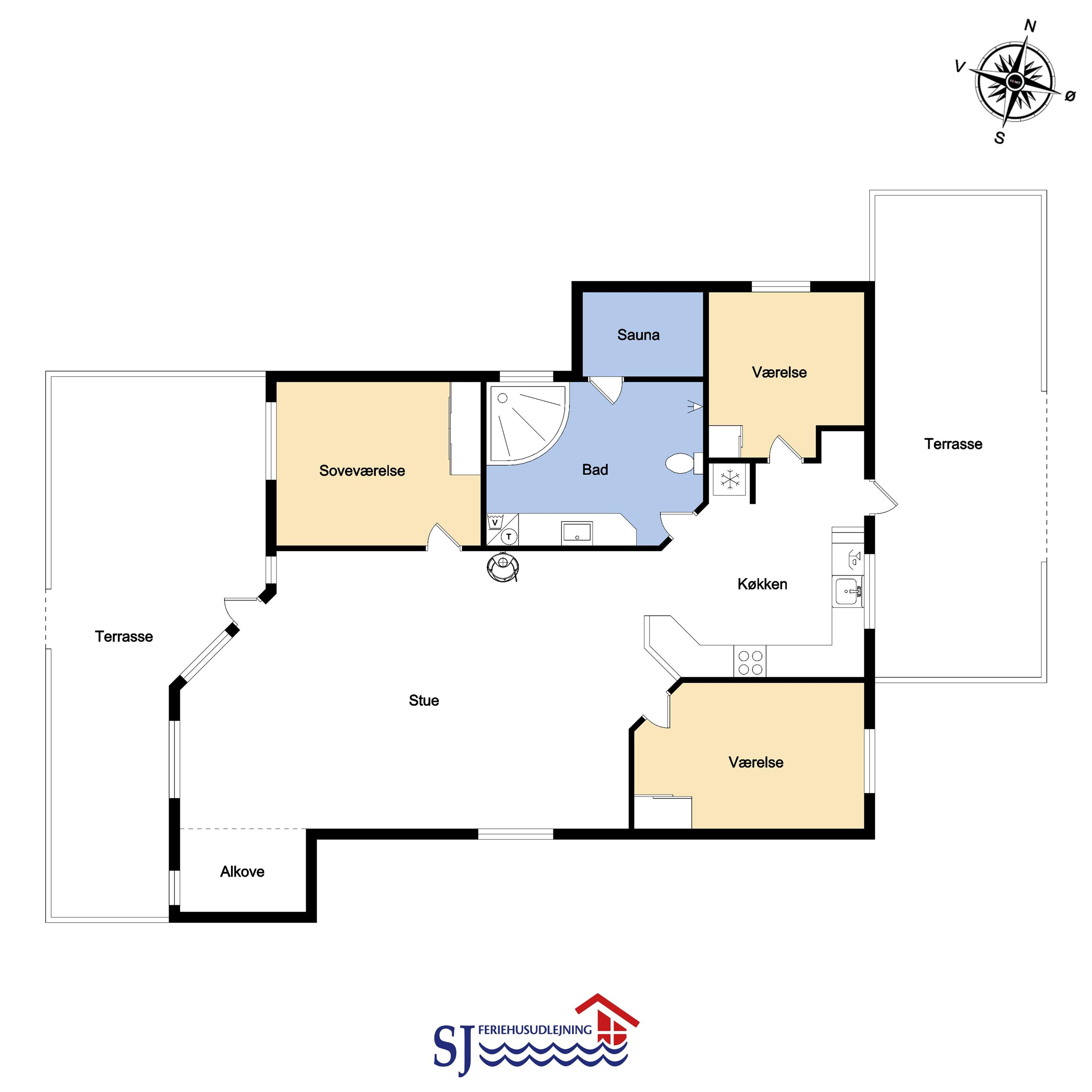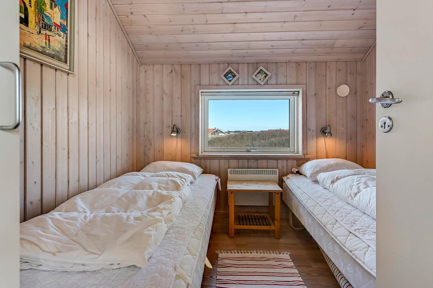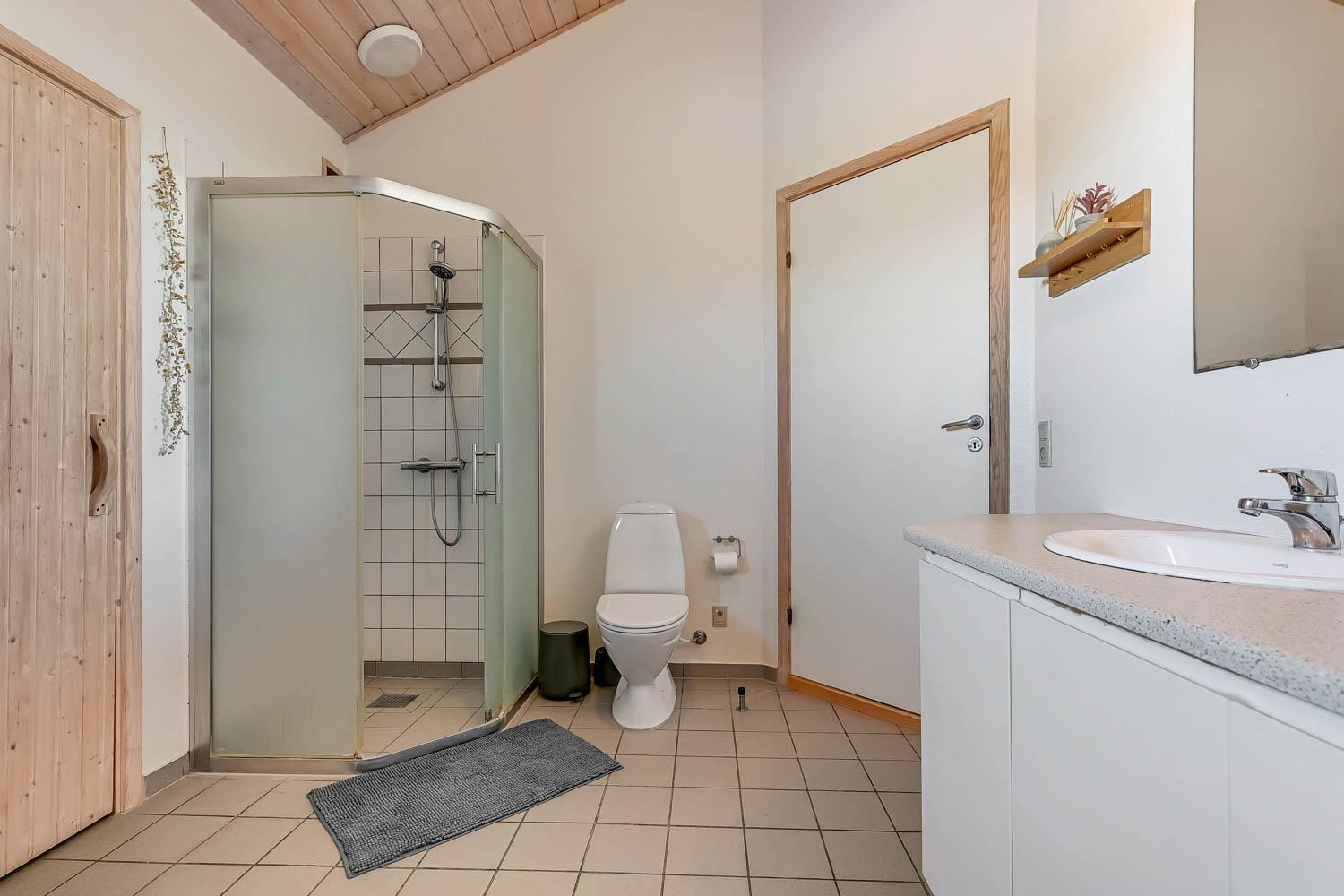 Dieses schöne und gut eingerichtete Ferienhaus aus Holz ist mit guter Möblierung ausgestattet. Der Wohnraum und die Küche sind kombiniert und es gibt einen Ausgang zu einer teilweise überdachten Terrasse. Der Wohnraum hat gute Ledermöbel und einen Esstisch mit Stühlen. Ein schöner Kaminofen sorgt für eine gute Wärme, egal zu welcher Jahreszeit. Es gibt TV mit Parabolantenne (nur deutsche Programme). Vom Wohnraum ist der Zugang zu 2 Schlafräumen im Haus, einer mit 1DB und einer mit 2B. Von der Küche gibt es einen Zugang zu dem letzen Schlafraum, der mit 2B eingerichtet ist. Das Badezimmer ist mit Toilette, Dusche, Waschbecken, Whirlpool und Sauna ausgestattet. Außerdem gibt es hier auch Waschmaschine und Trockner. In dem Badezimmer gibt es Fußbodenheizung und Fliesenboden. Gut ausgestattete Küche mit Herd mit Cerankochfeld, Geschirrspüler, Abzugshaube, Mikrowelle, Kühl-/Gefrierschrank. Es gibt Holzboden in allen Räumen und in der Küche gibt es Vinylboden. Haustiere sind nicht erlaubt. Nichtraucher-Haus.