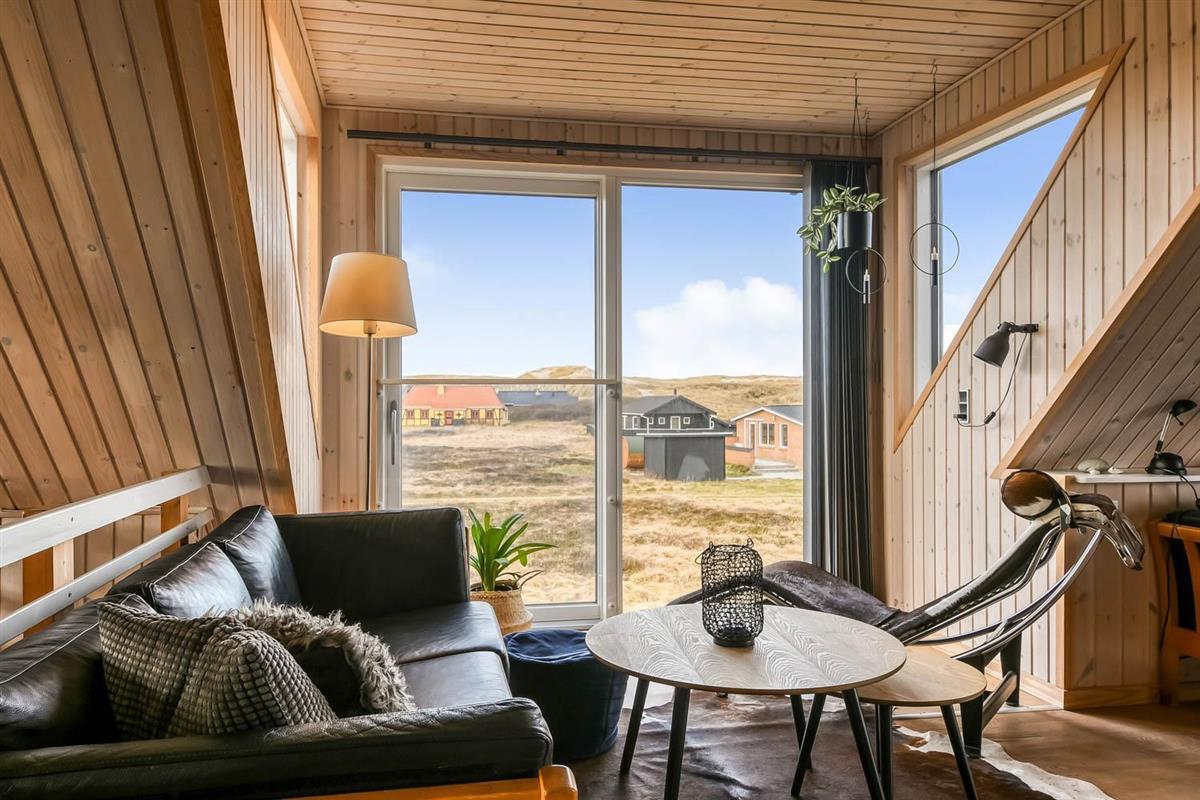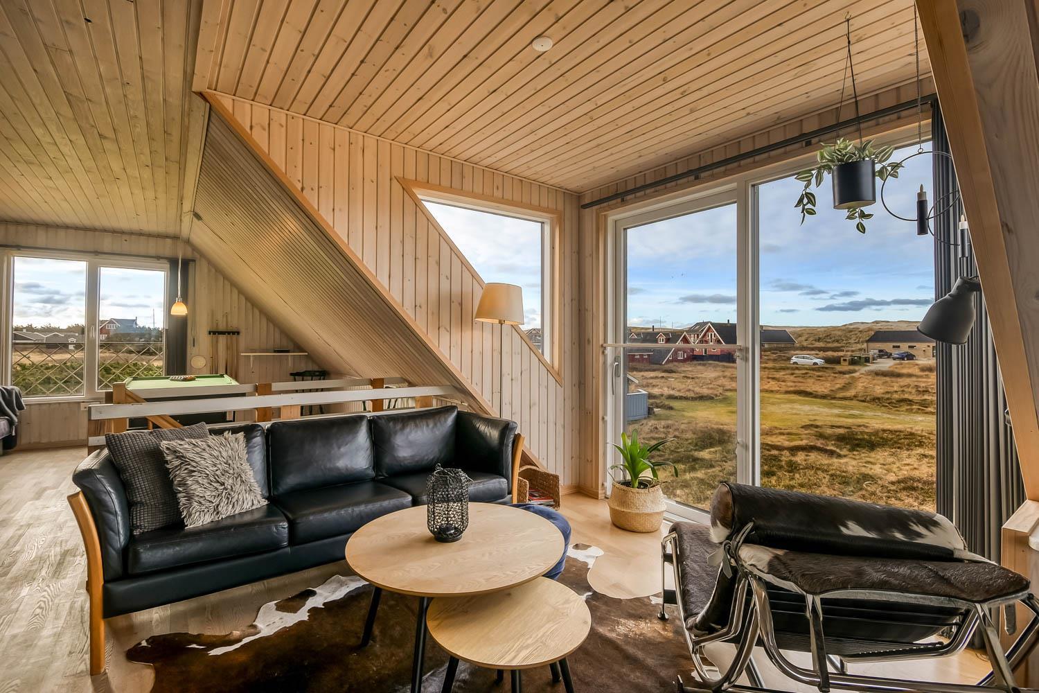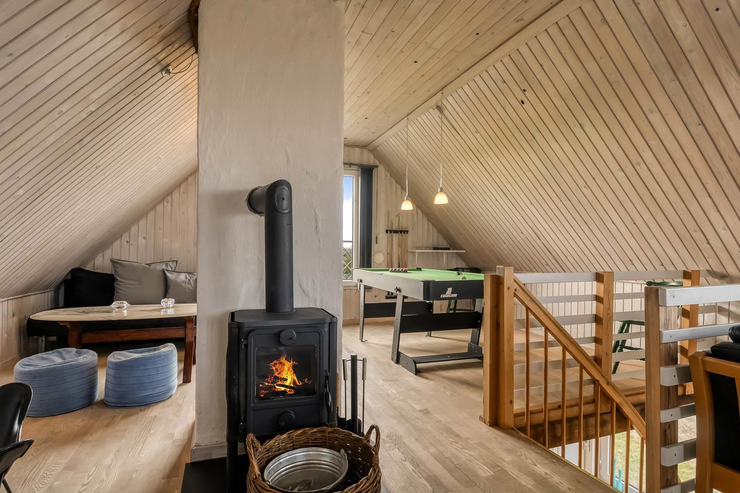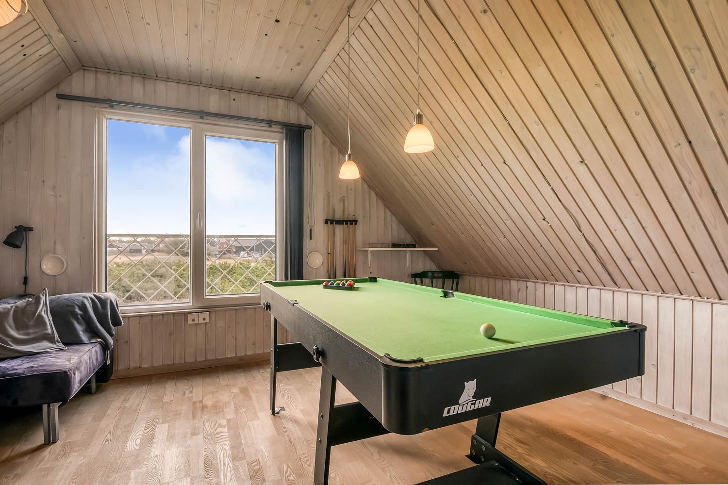 Über die Treppe am Ende des Wohnzimmers gelangt man in die 1. Etage. Hier ist ein schönes großes Wohnzimmer mit einem fantastischen Canapé mit Blick auf die Dünen an der Nordsee und über die Landschaft. Genießen Sie die schönen Möbel im Dachgeschoss zusammen mit dem Blick auf einen wunderschönen Sonnenuntergang. Es ist außerdem mit neuen modernen Ledermöbeln, kleinem Holzofen, Wärmepumpe, Flatscreen-TV mit dänischen und deutschen Sendern und einem Chromecast ausgestattet. Es gibt auch einen Aktivitätsbereich mit Billardtisch und Sofagruppe für Brettspiele. Zu guter Letzt gibt ist es ein schönes großes Schlafzimmer (1DB + 1B) und einen Schreibtisch mit Computerbildschirm (HDMI), wenn Hausaufgaben gemacht werden müssen.