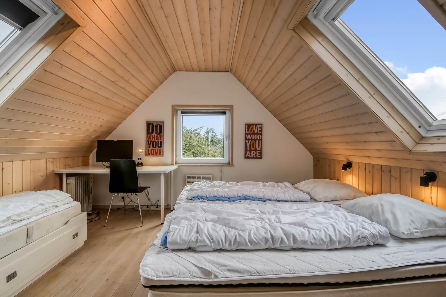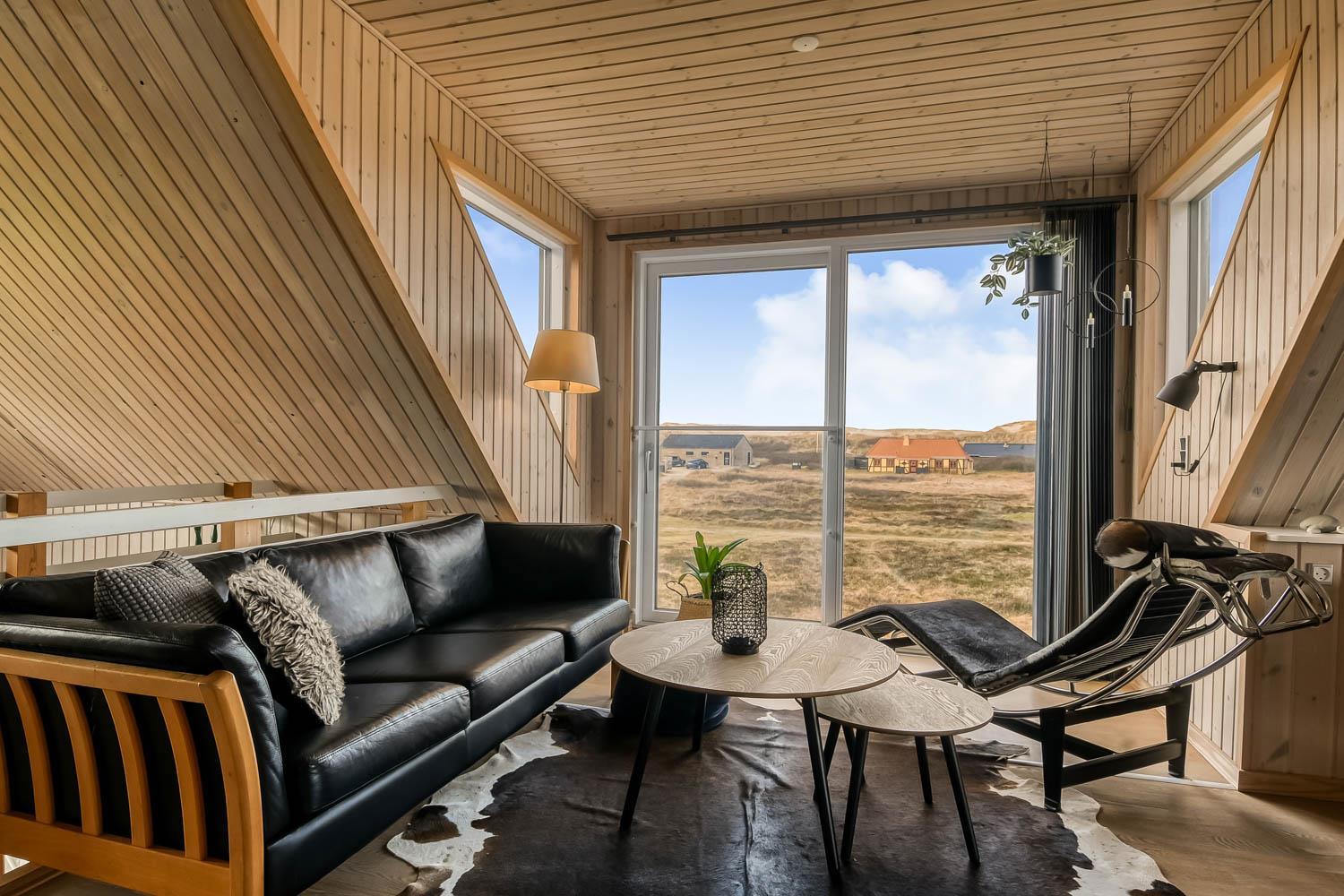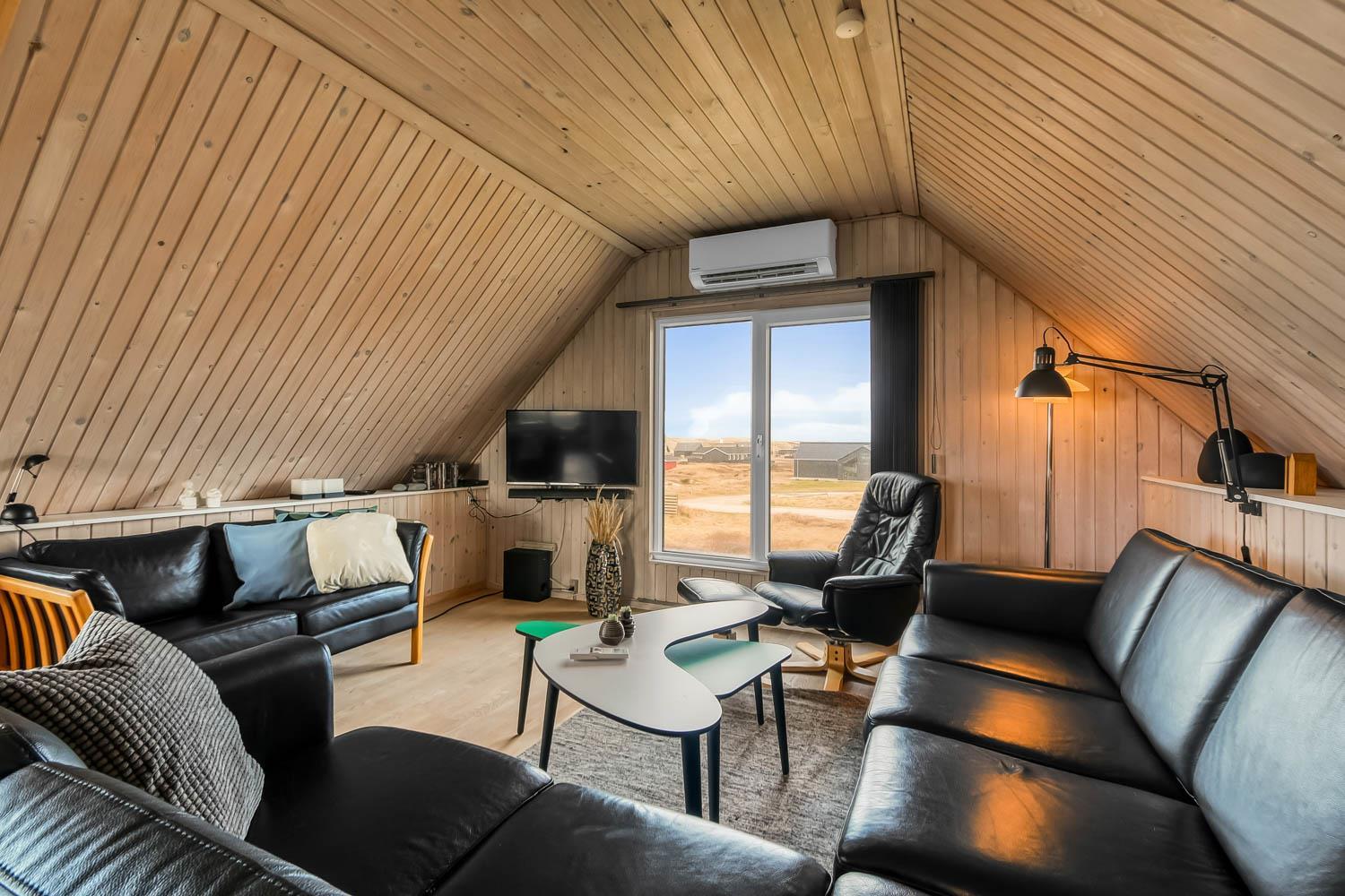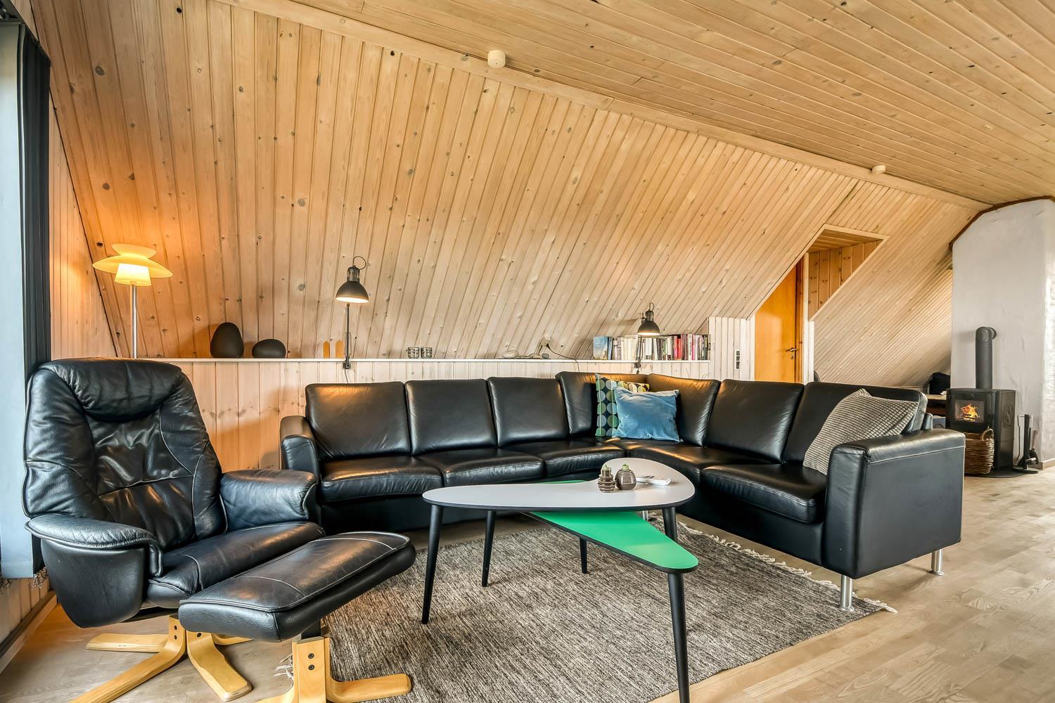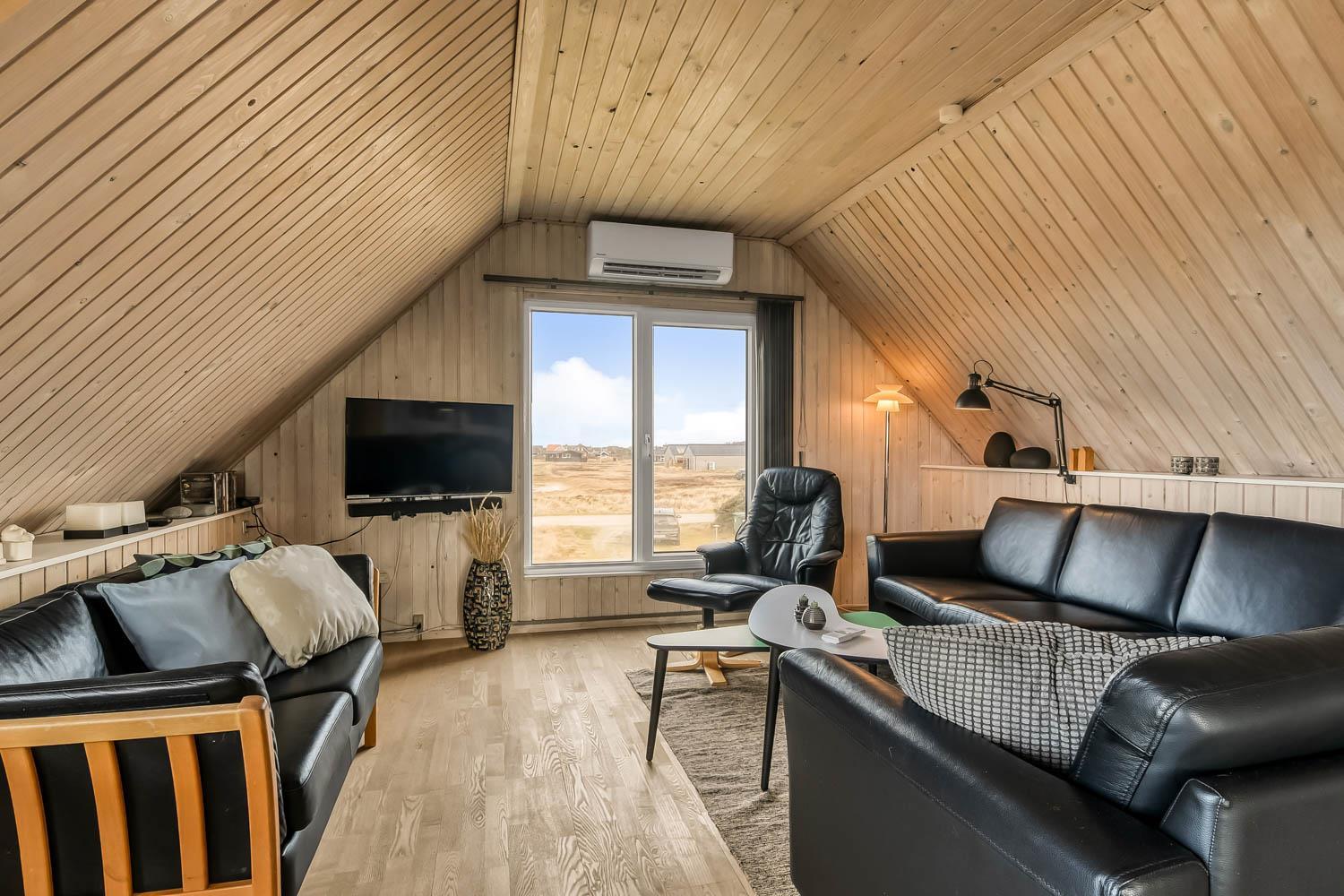 Über die Treppe am Ende des Wohnzimmers gelangt man in die 1. Etage. Hier ist ein schönes großes Wohnzimmer mit einem fantastischen Canapé mit Blick auf die Dünen an der Nordsee und über die Landschaft. Genießen Sie die schönen Möbel im Dachgeschoss zusammen mit dem Blick auf einen wunderschönen Sonnenuntergang. Es ist außerdem mit neuen modernen Ledermöbeln, kleinem Holzofen, Wärmepumpe, Flatscreen-TV mit dänischen und deutschen Sendern und einem Chromecast ausgestattet. Es gibt auch einen Aktivitätsbereich mit Billardtisch und Sofagruppe für Brettspiele. Zu guter Letzt gibt ist es ein schönes großes Schlafzimmer (1DB + 1B) und einen Schreibtisch mit Computerbildschirm (HDMI), wenn Hausaufgaben gemacht werden müssen.