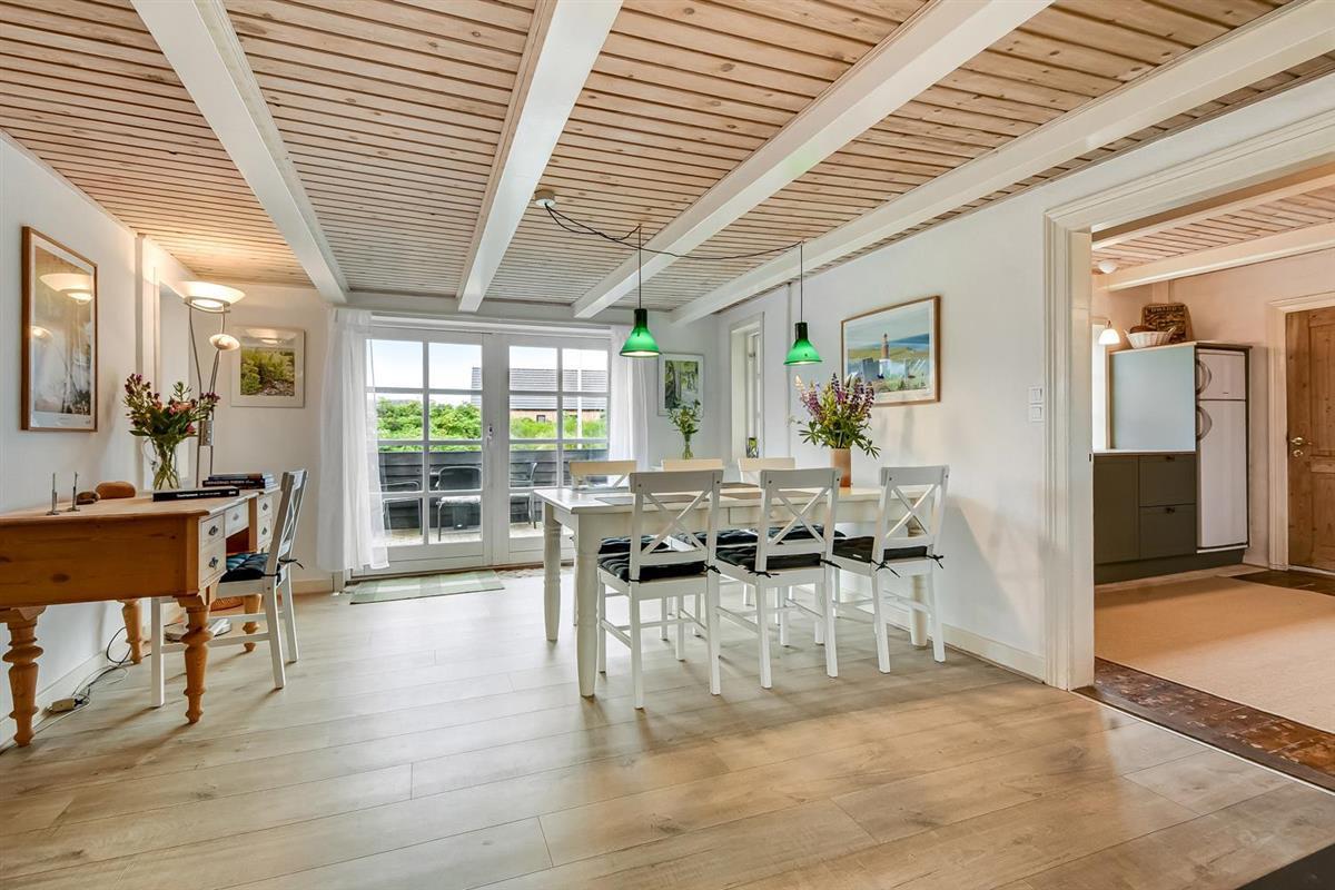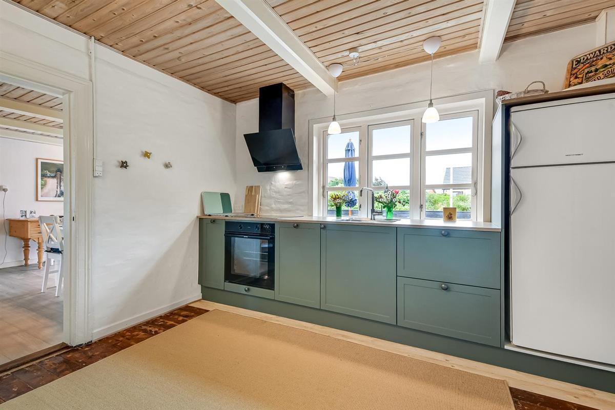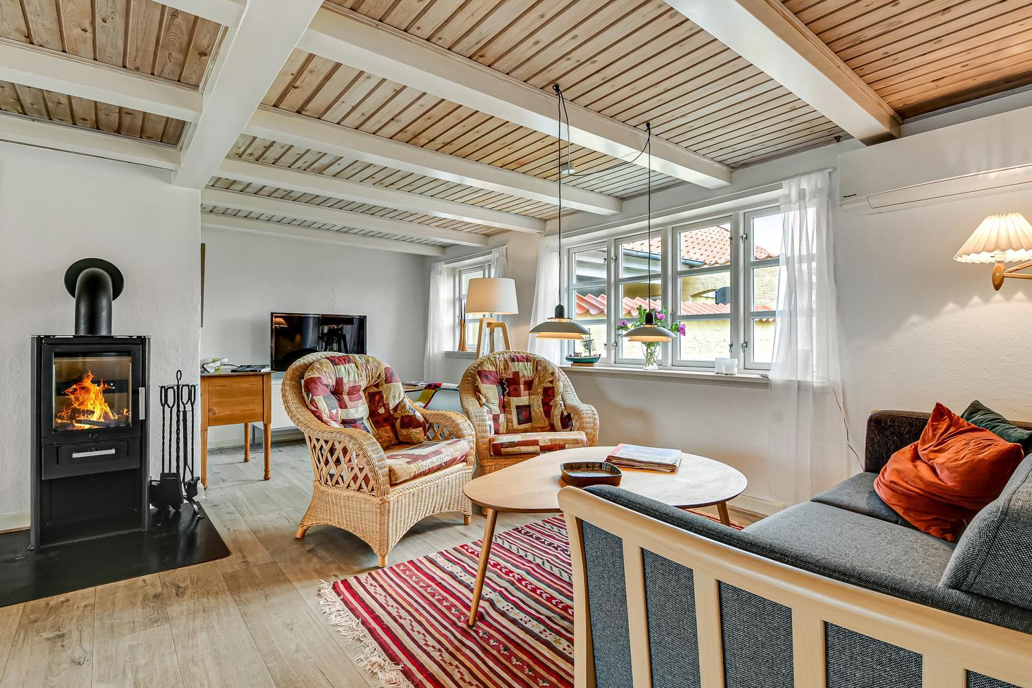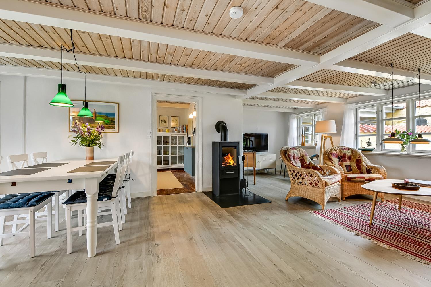 Dieses historische Haus mit einer Fläche von 100 m2 stammt aus dem Jahr 1877 und ist das Geburtshaus des Schriftstellers Erik Bertelsen (u. a. bekannt für das Lied "Blæsten går frisk over Limfjordens vande"). Der größte Raum des Hauses ist das schöne, große und helle Wohnzimmer, wo die vielen Fenster für viel Licht sorgen. Im Wohnzimmer gibt es Polstermöbel, einen Fernseher mit dänischen und deutschen Kanälen, sowie ein Radio. Vom Wohnzimmer aus gelangt man auf die große, südlich ausgerichtete Terrasse, die ideal ist, um zu grillen und die Sonne zu genießen. Das Wohnzimmer kann mit einer energieeffizienten Wärmepumpe beheizt werden, oder man kann den gemütlichen Kamin anzünden. In den meisten Teilen des Hauses sind die alten, authentischen Deckenbalken erhalten geblieben. Es ist jedoch zu beachten, dass die Deckenhöhe im Wohnzimmer niedriger ist (1,90 m). Die Küche ist mit allem ausgestattet, was man für einen Urlaub benötigt. Hier gibt es Induktionskochfeld, Backofen, Abzugshaube, Kühl-/Gefrierschrank, Geschirrspüler und Mikrowelle i ein neurenoviertes Küche. Das Haus verfügt über drei helle gute Schlafzimmer. Zwei Schlafzimmer sind mit einem Doppelbett ausgestattet, und das dritte Schlafzimmer verfügt über ein Schlafsofa. Vom Schlafzimmer mit Schlafsofa gibt es ebenfalls Zugang zur großen, südlich ausgerichteten Terrasse. Das Badezimmer ist mit einer Toilette, einem Waschbecken und einer Dusche ausgestattet und wird mit Fußbodenheizung beheizt. Ausserdem hat das Haus eine Gästetoilette. Es besteht die Möglichkeit, in der Waschmaschine Wäsche zu waschen. Für die jüngsten Gäste stehen ein Kinderstuhl und ein Kinderbett zur Verfügung. Dicht am Haus gibt es 2 Ladeständer für Elektro-Autos.