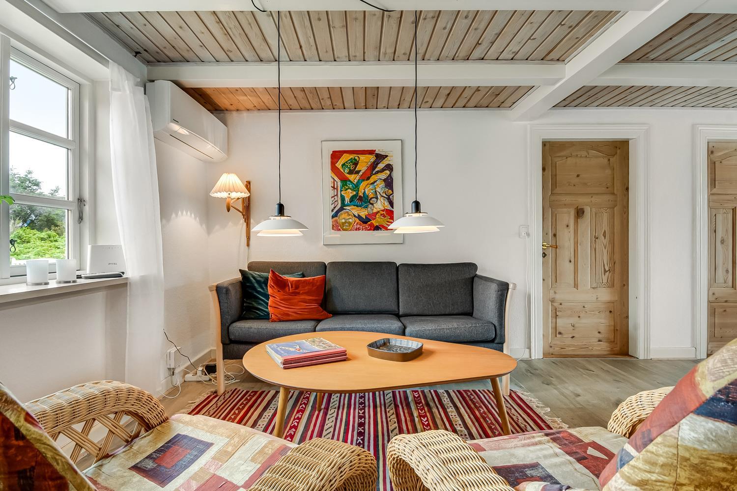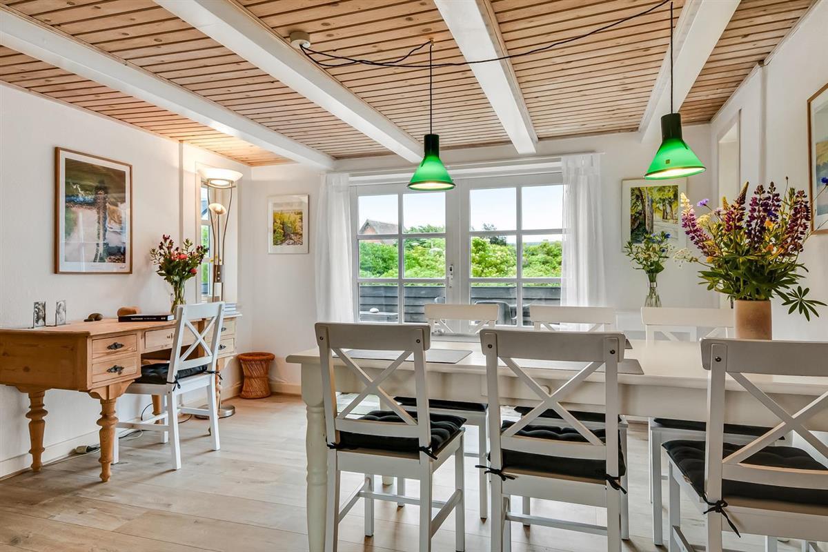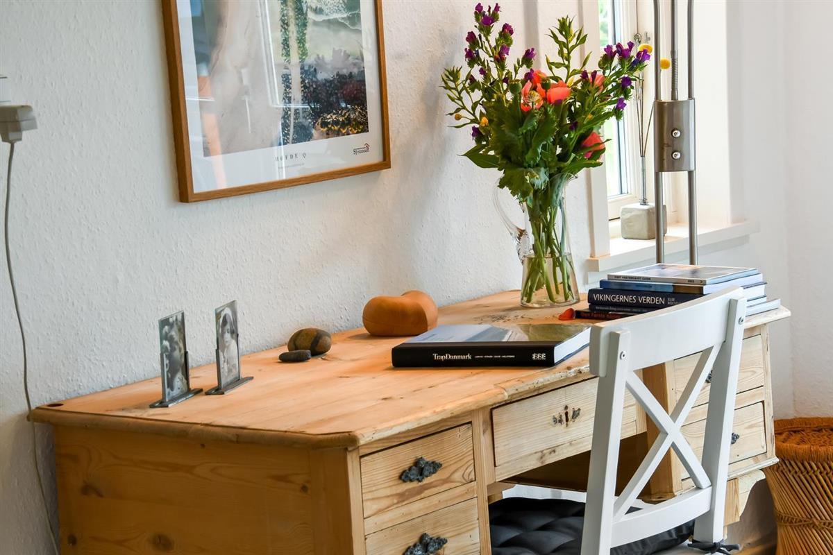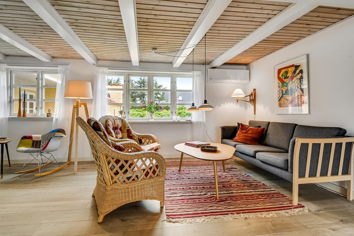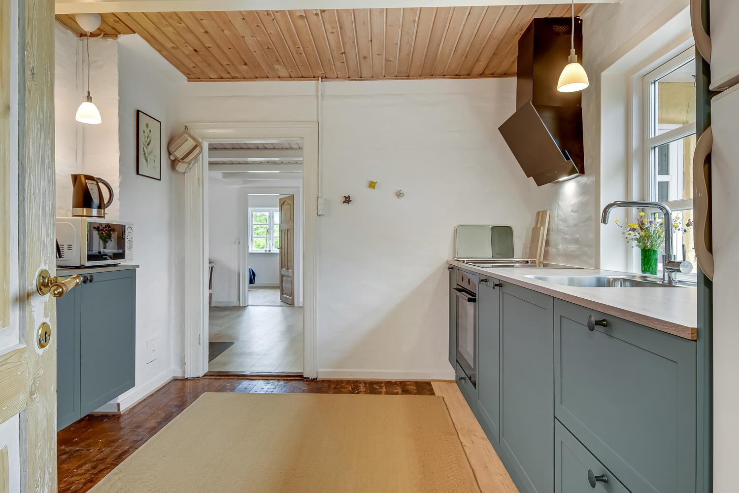 Dieses historische Haus mit einer Fläche von 100 m2 stammt aus dem Jahr 1877 und ist das Geburtshaus des Schriftstellers Erik Bertelsen (u. a. bekannt für das Lied "Blæsten går frisk over Limfjordens vande"). Der größte Raum des Hauses ist das schöne, große und helle Wohnzimmer, wo die vielen Fenster für viel Licht sorgen. Im Wohnzimmer gibt es Polstermöbel, einen Fernseher mit dänischen und deutschen Kanälen, sowie ein Radio. Vom Wohnzimmer aus gelangt man auf die große, südlich ausgerichtete Terrasse, die ideal ist, um zu grillen und die Sonne zu genießen. Das Wohnzimmer kann mit einer energieeffizienten Wärmepumpe beheizt werden, oder man kann den gemütlichen Kamin anzünden. In den meisten Teilen des Hauses sind die alten, authentischen Deckenbalken erhalten geblieben. Es ist jedoch zu beachten, dass die Deckenhöhe im Wohnzimmer niedriger ist (1,90 m). Die Küche ist mit allem ausgestattet, was man für einen Urlaub benötigt. Hier gibt es Induktionskochfeld, Backofen, Abzugshaube, Kühl-/Gefrierschrank, Geschirrspüler und Mikrowelle i ein neurenoviertes Küche. Das Haus verfügt über drei helle gute Schlafzimmer. Zwei Schlafzimmer sind mit einem Doppelbett ausgestattet, und das dritte Schlafzimmer verfügt über ein Schlafsofa. Vom Schlafzimmer mit Schlafsofa gibt es ebenfalls Zugang zur großen, südlich ausgerichteten Terrasse. Das Badezimmer ist mit einer Toilette, einem Waschbecken und einer Dusche ausgestattet und wird mit Fußbodenheizung beheizt. Ausserdem hat das Haus eine Gästetoilette. Es besteht die Möglichkeit, in der Waschmaschine Wäsche zu waschen. Für die jüngsten Gäste stehen ein Kinderstuhl und ein Kinderbett zur Verfügung. Dicht am Haus gibt es 2 Ladeständer für Elektro-Autos.